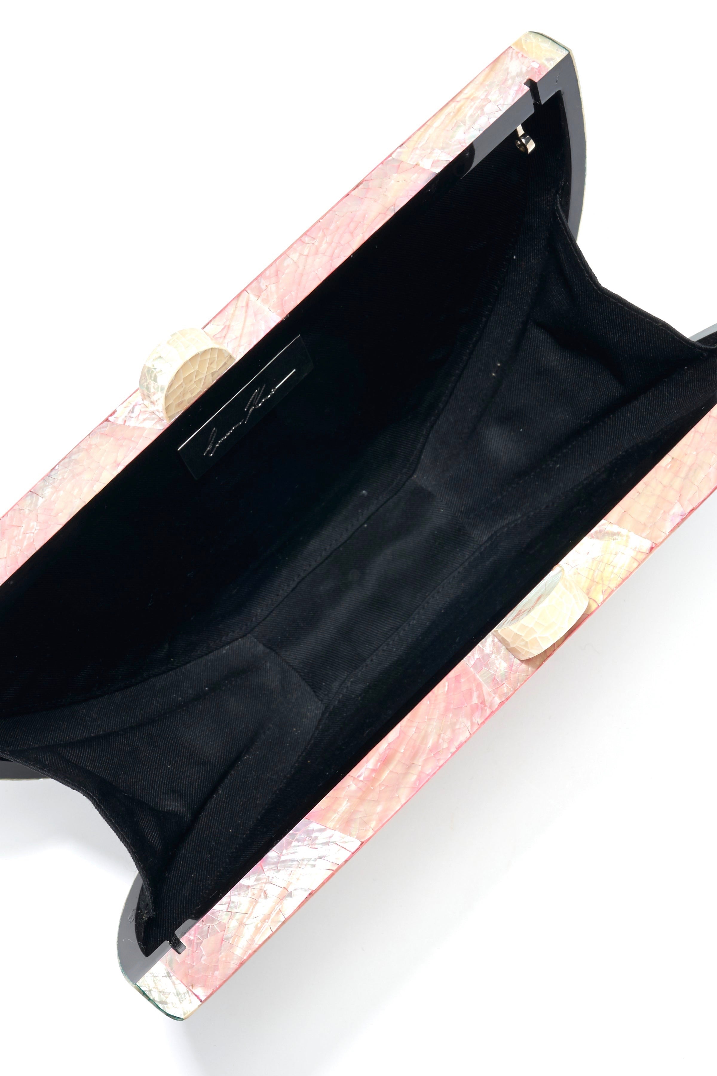 Mother of Pearl,Resin appliqué, Natural Dyed Pigment.Black Matte Satin Lining, detachable 44 inch silver snake chain.