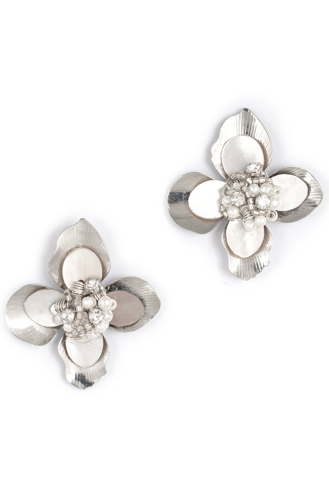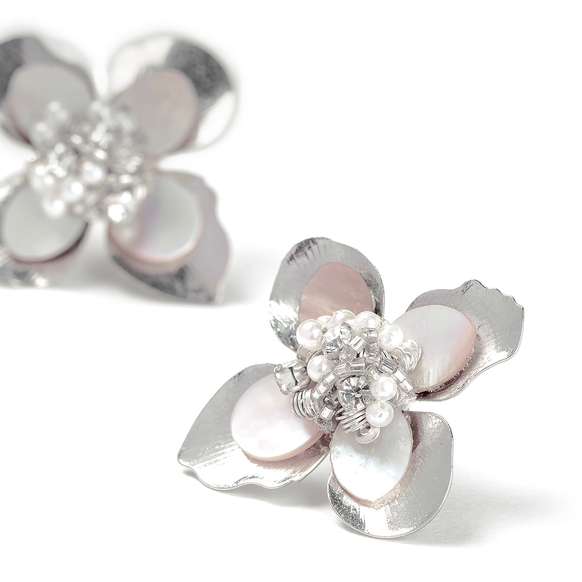 100 % COTTON WOVEN WITH GLASS BEADS, MOP, BRASS COMPONENT, GLASS STONE, COTTON THREAD, MILD STEEL POST, METALLIC THREAD, SUEDE BACKING.