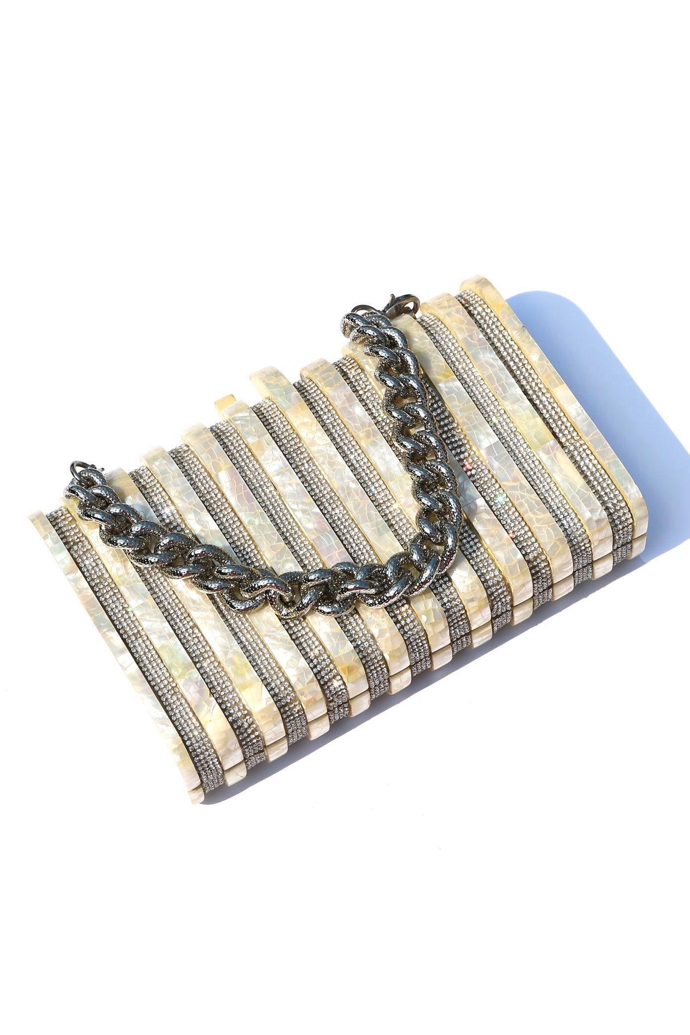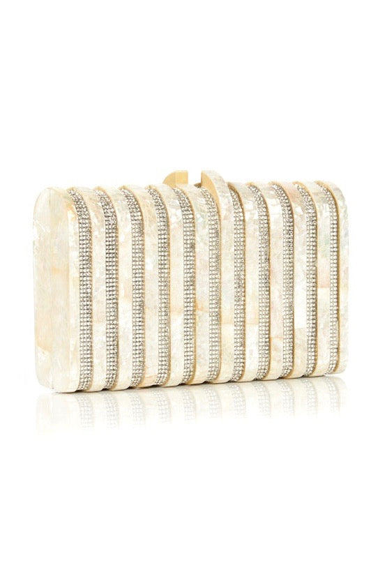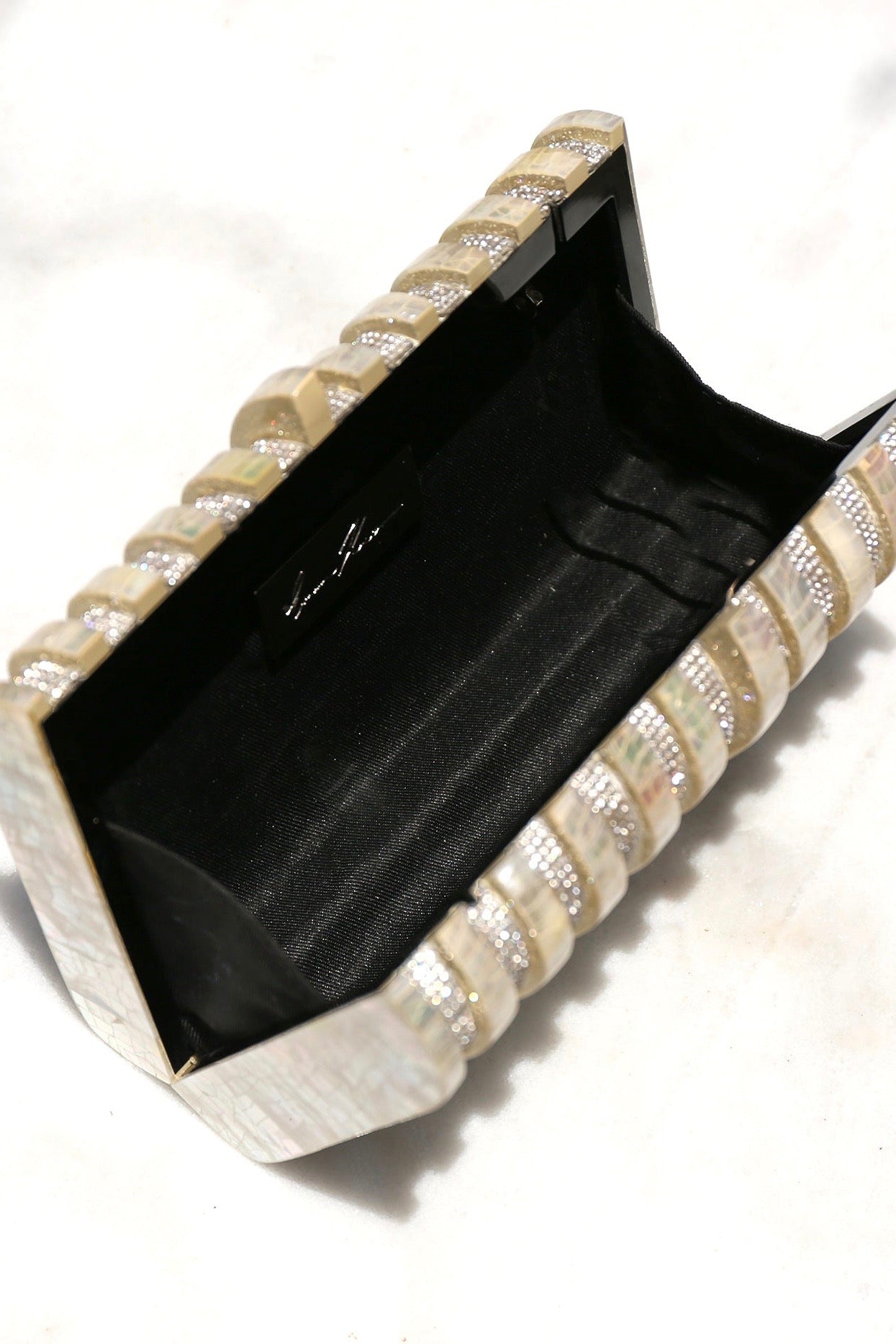 Mother of Pearl Shell Cream Resin, White Swarovski Crystals, Black Matte Satin Lining.