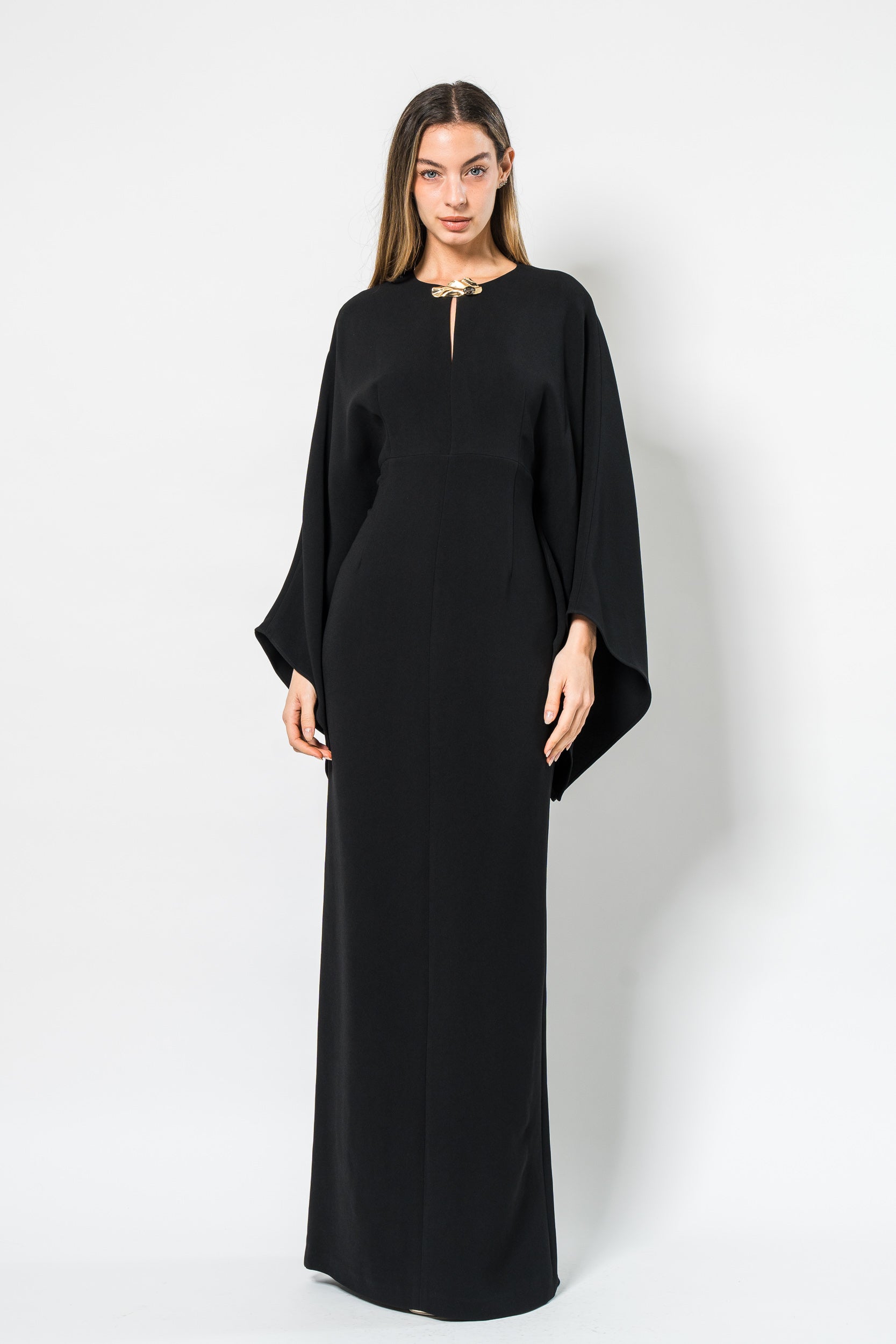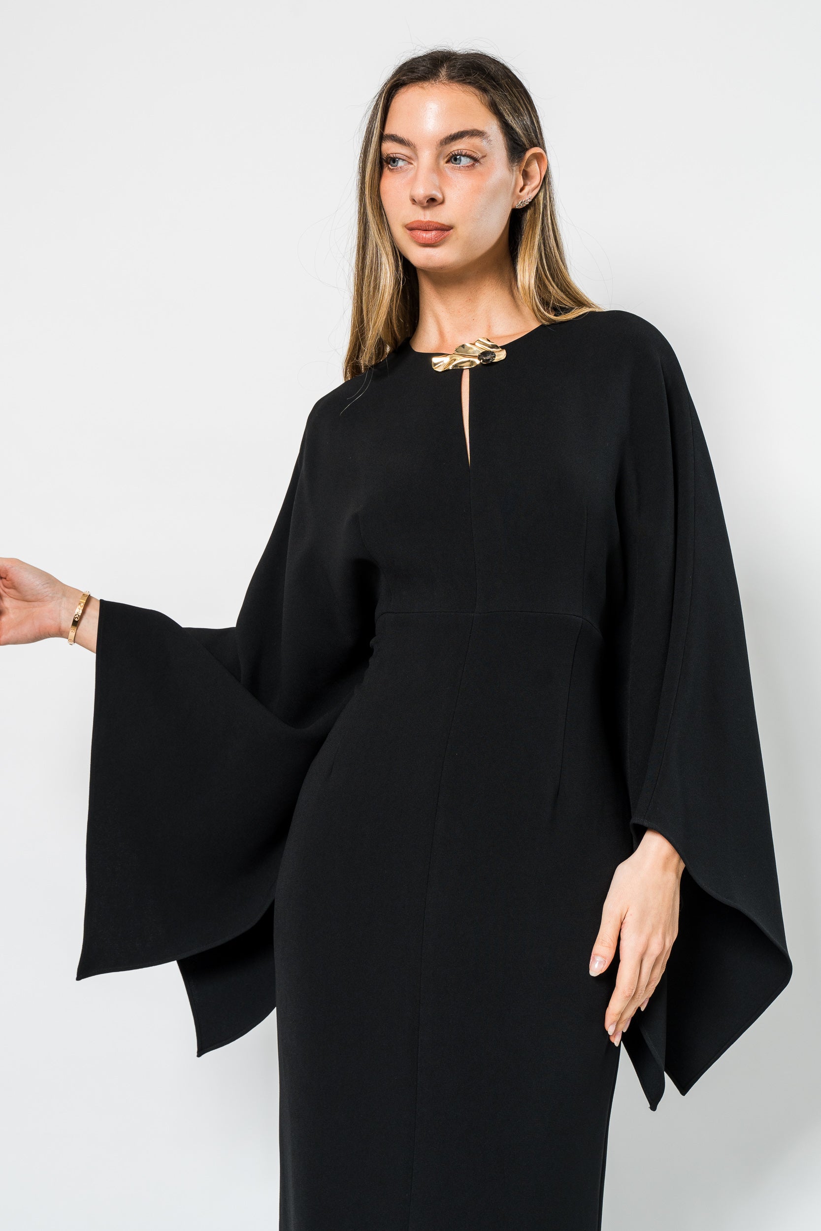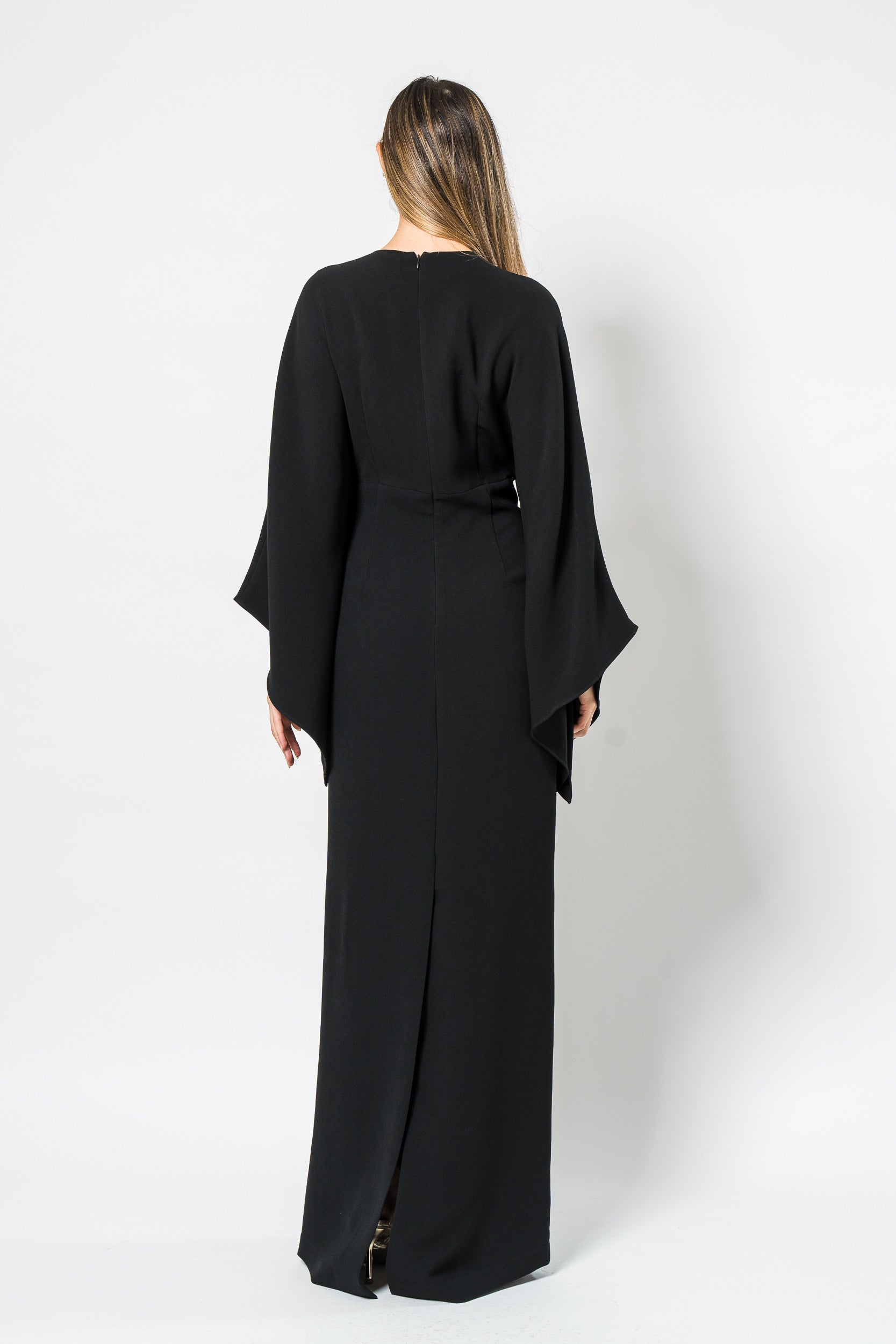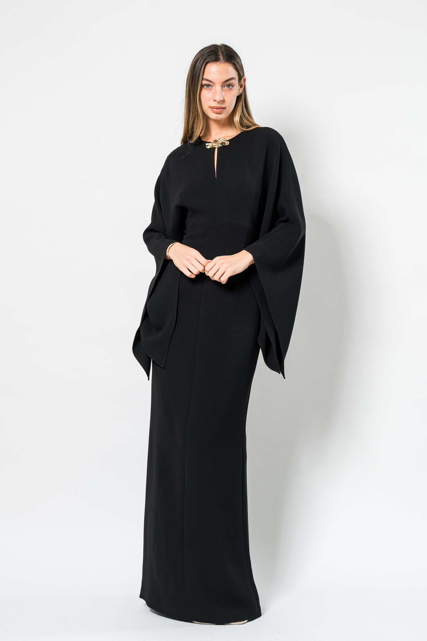 Crepe Kimono Sleeve Brooch Neck Gown in Black by Teri Jon.