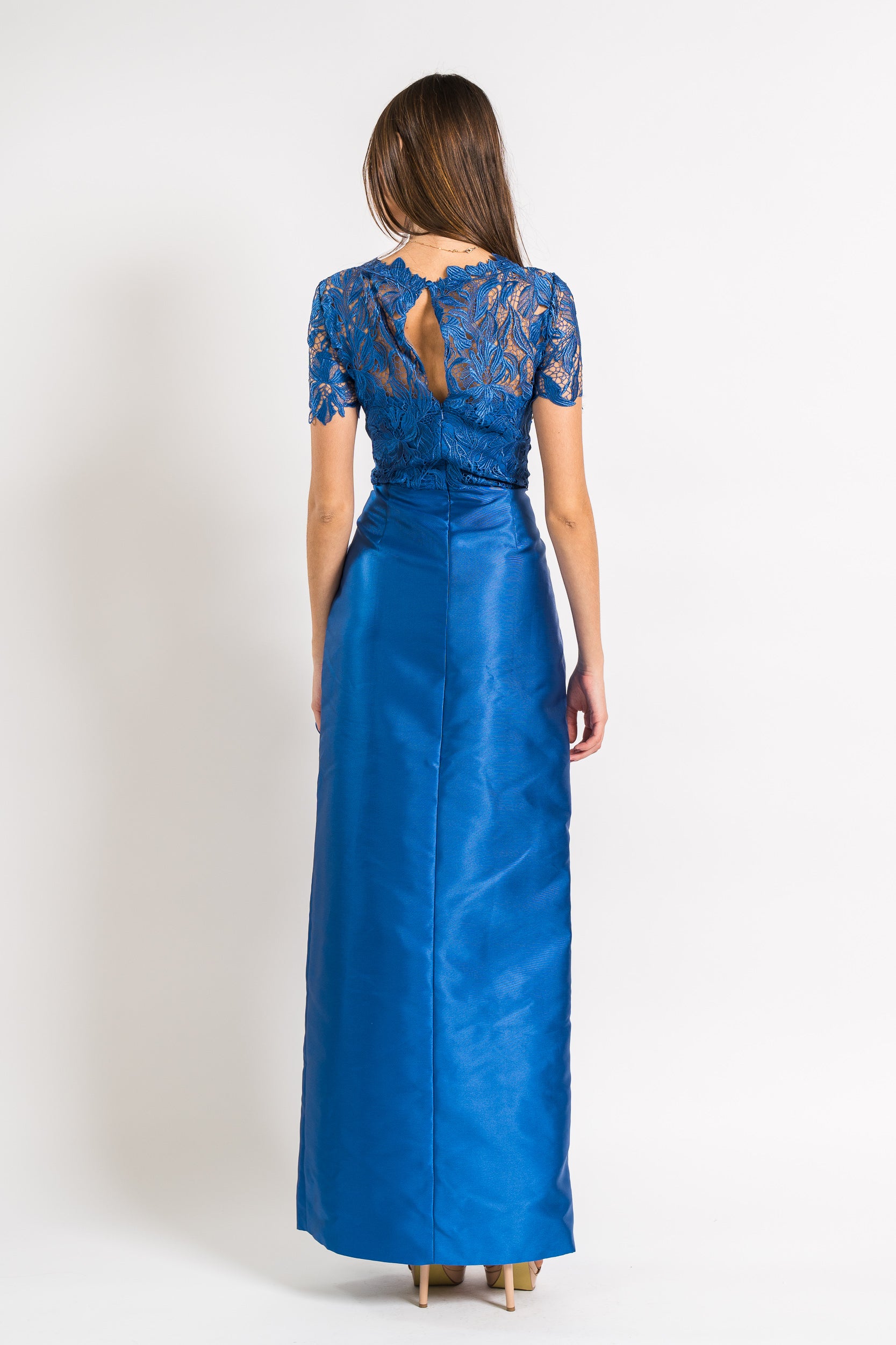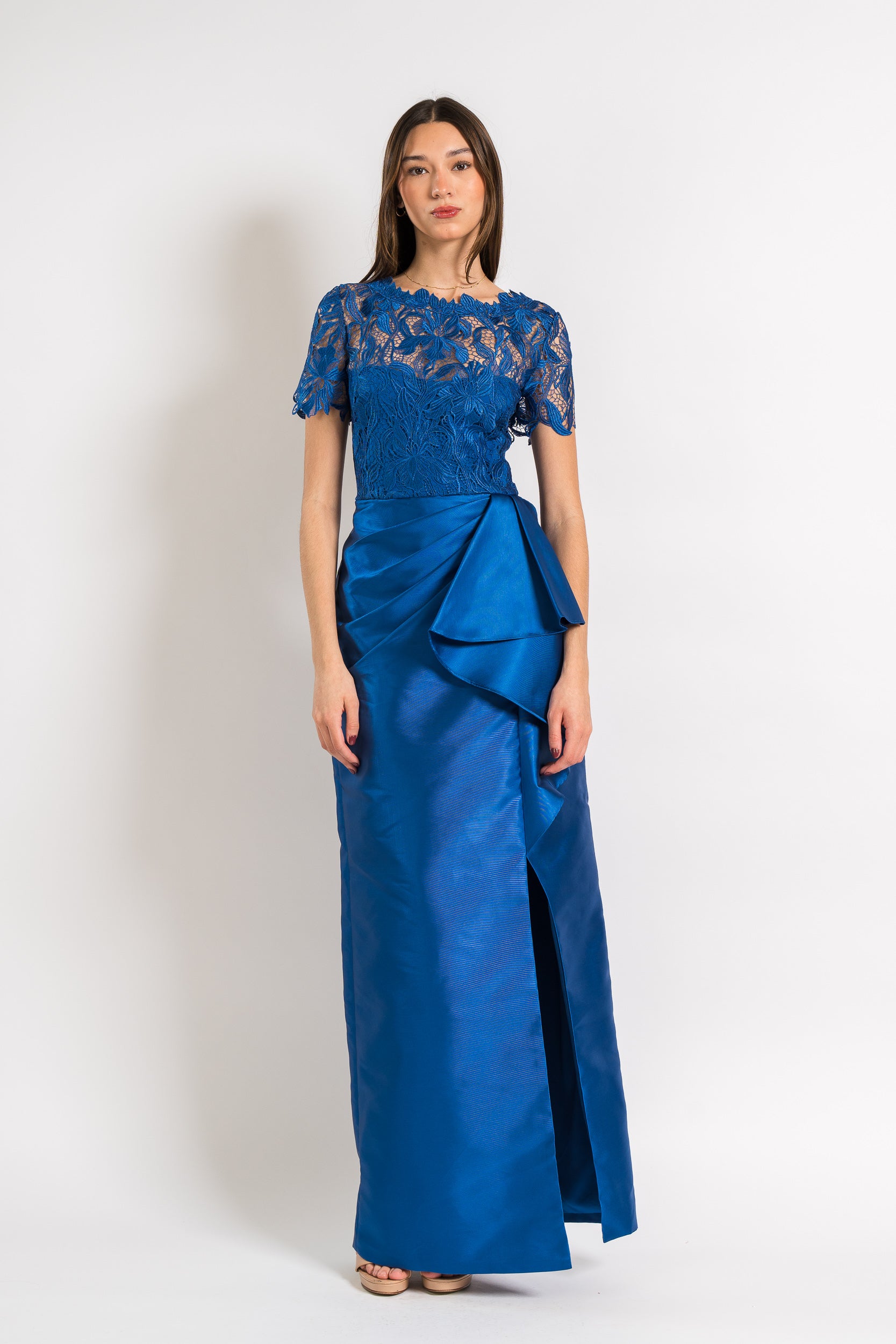 Lace Crew Neck Dress With Mikado Draped Skirt in Blue Mirage by Theia.