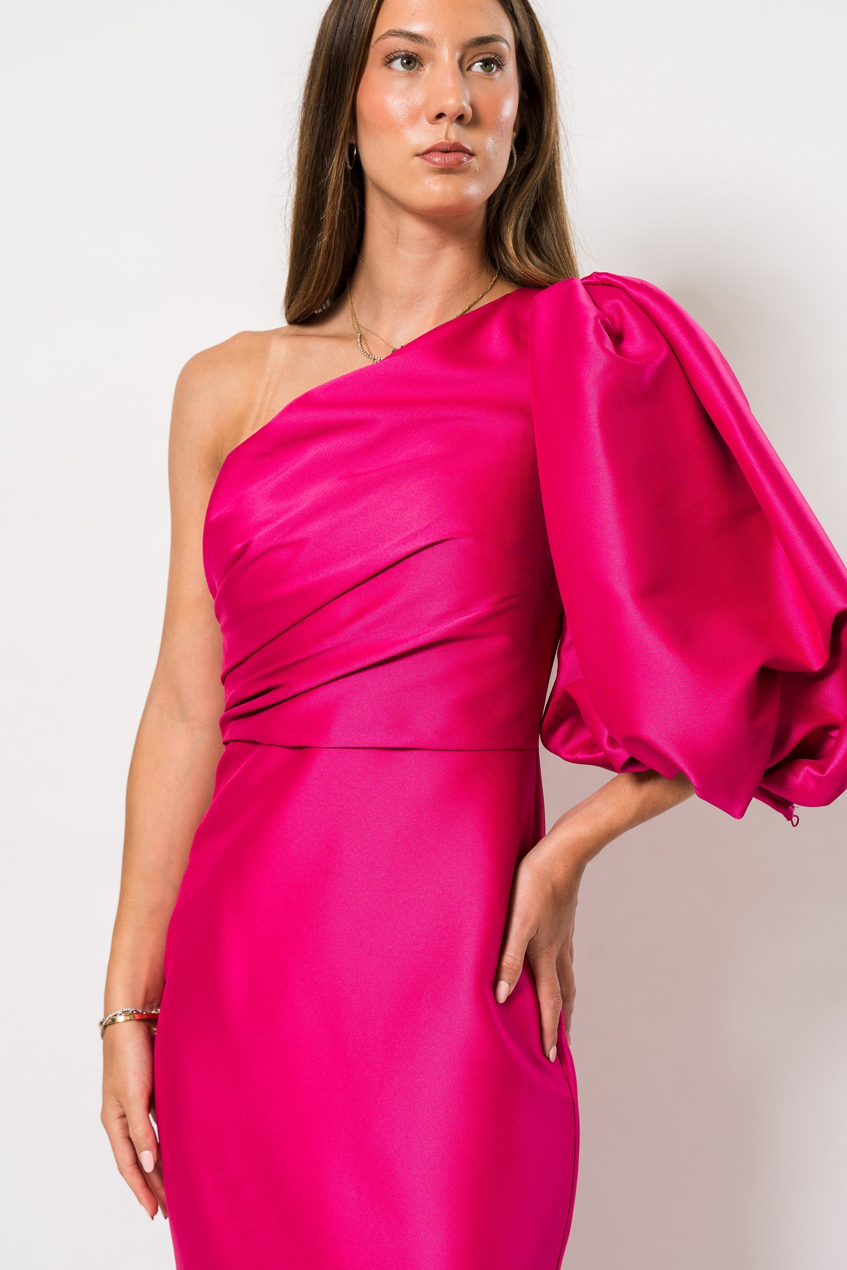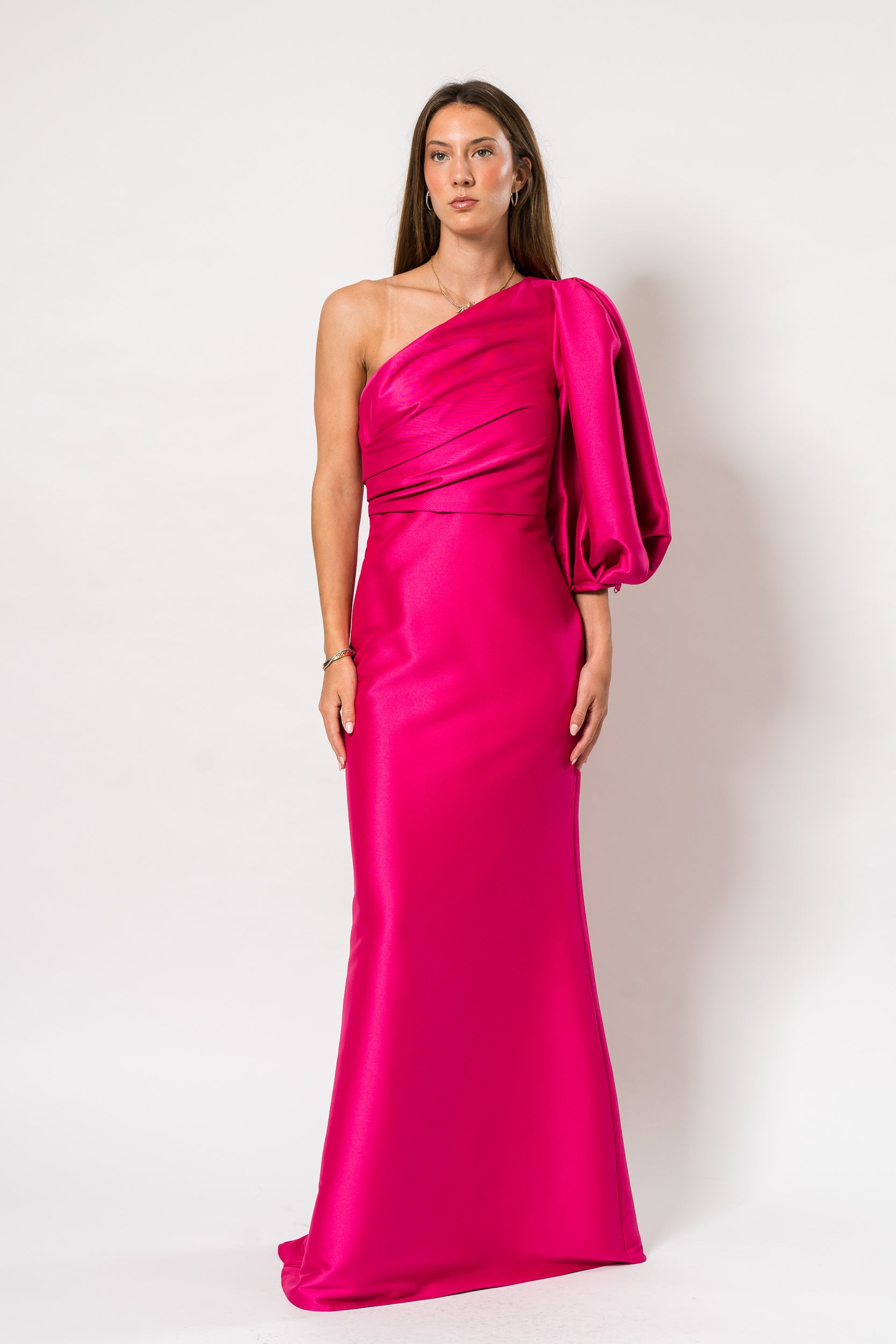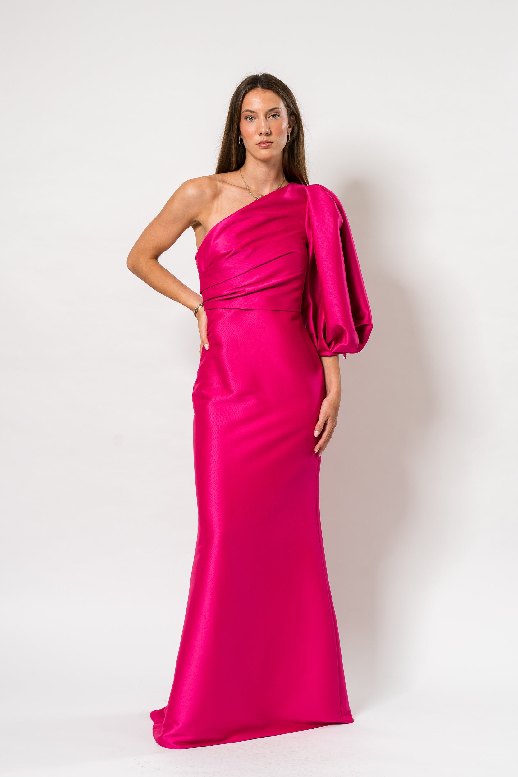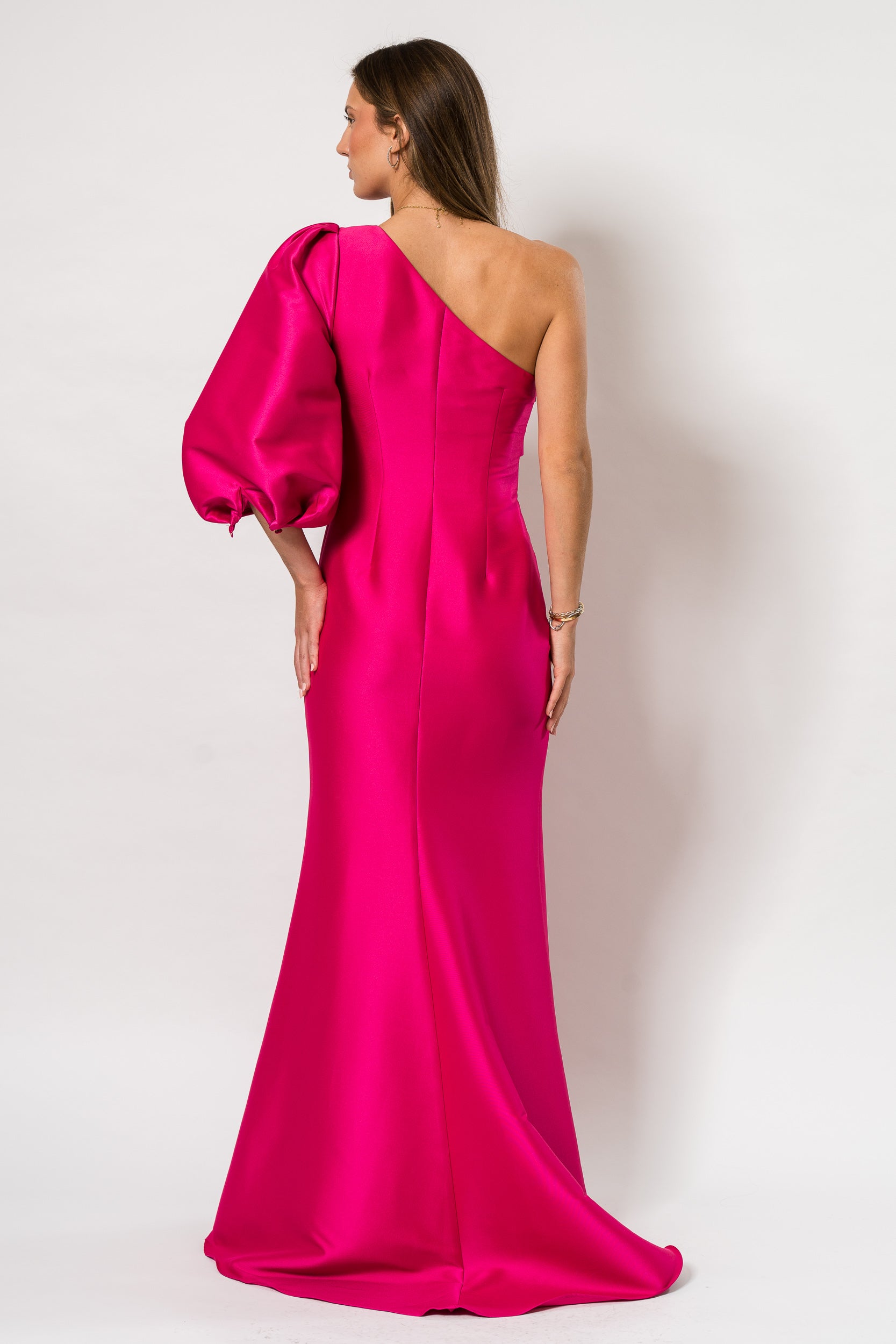 One Shoulder Ballon Sleeve Gown in Hot Fuchsia by Bagley Mischka.