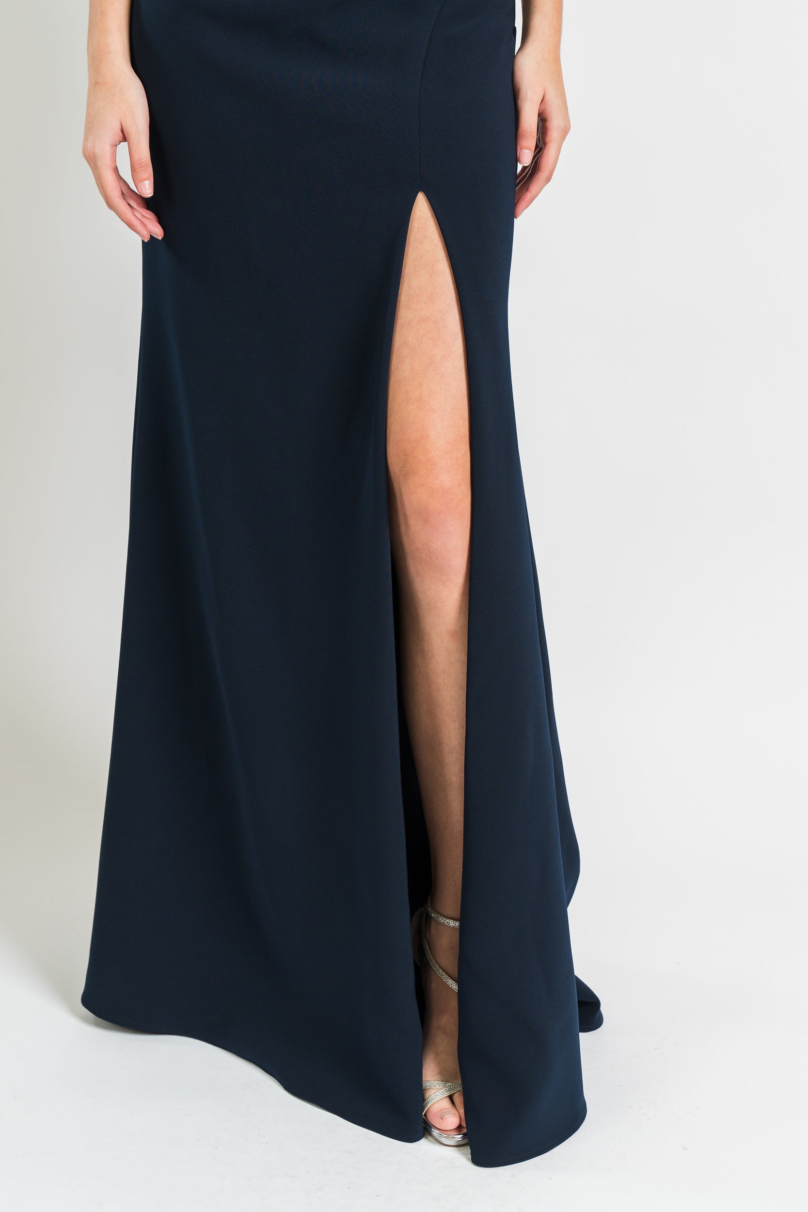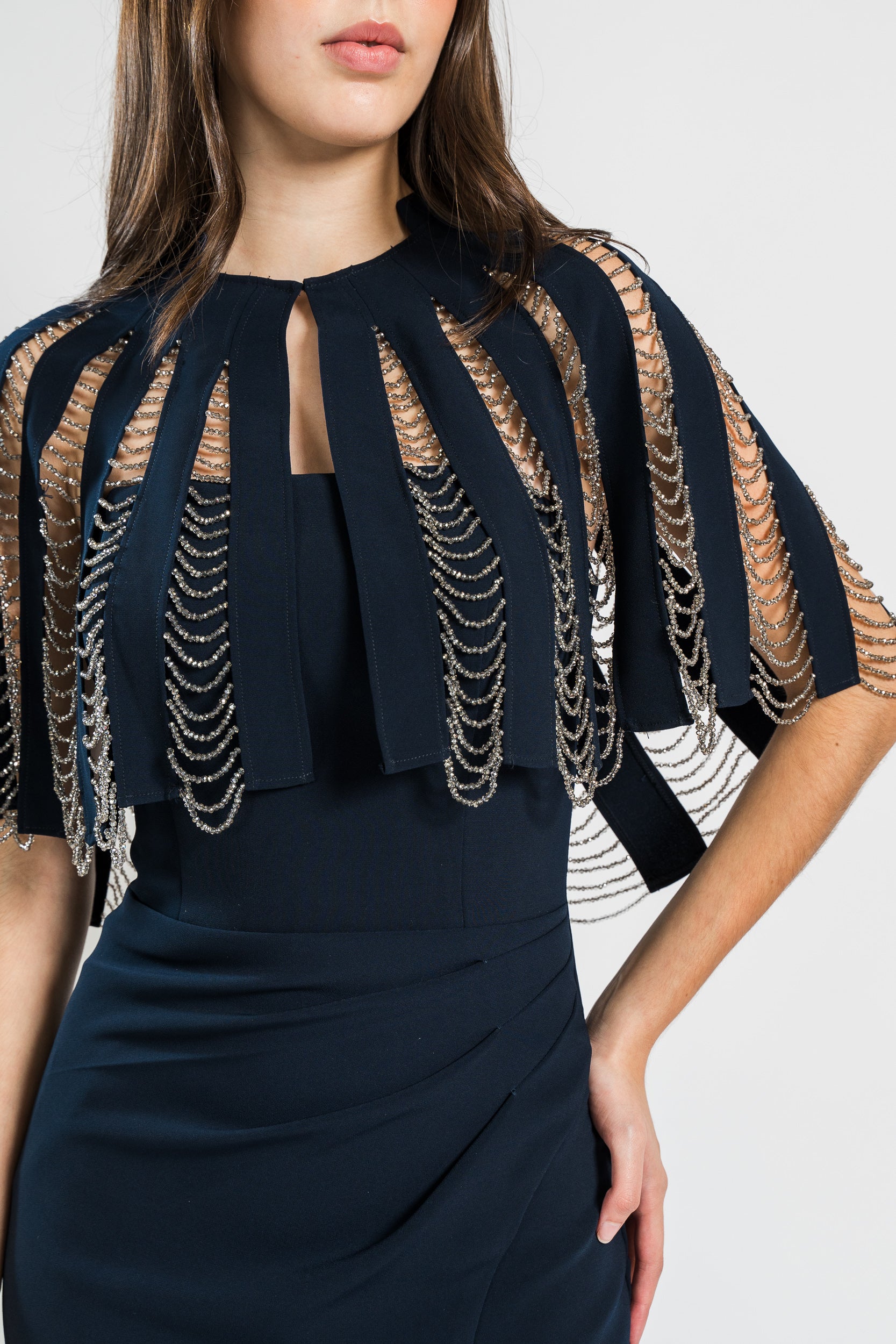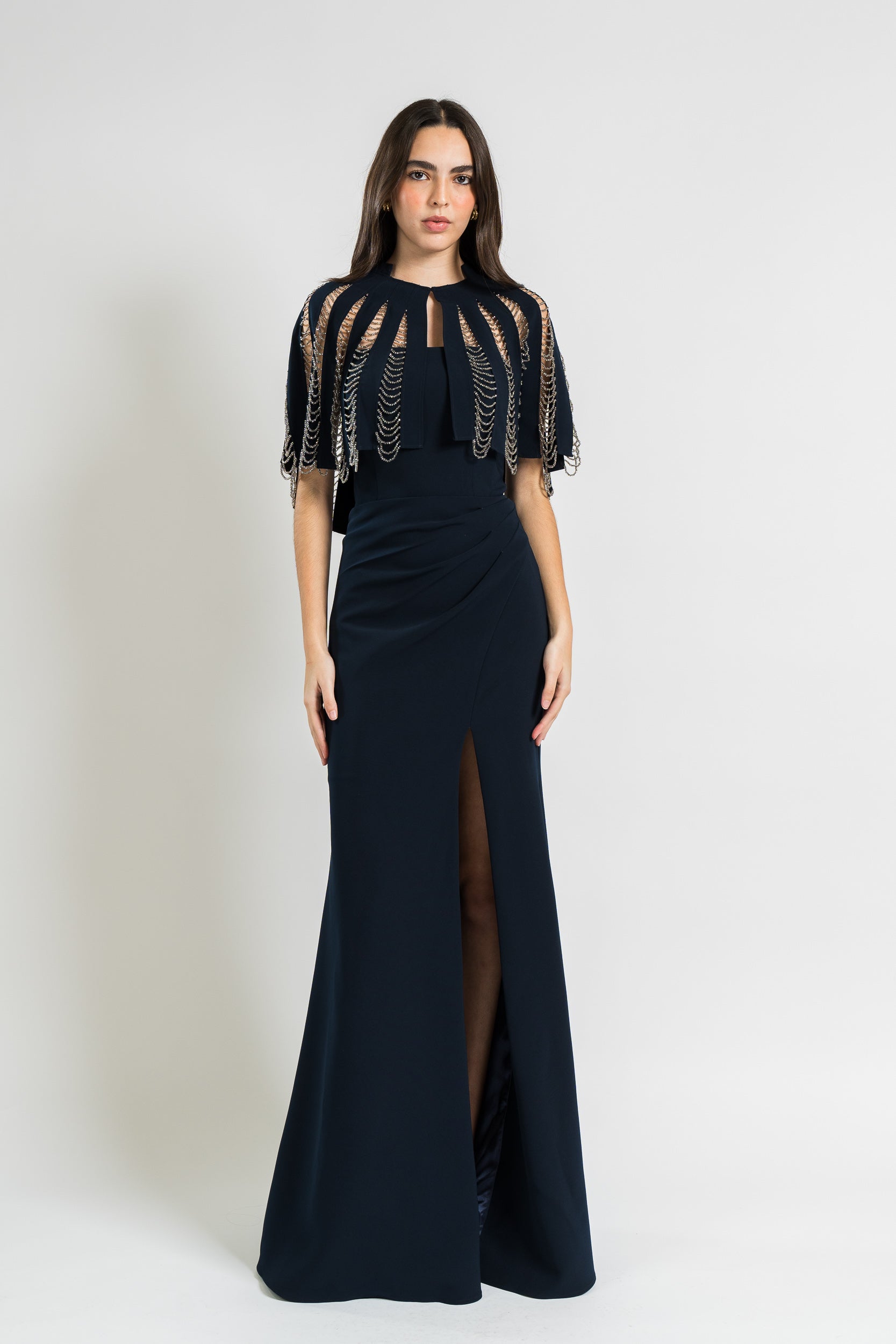 Gown with Chain Fringe Detail and Side Slit in Navy by Jovani.