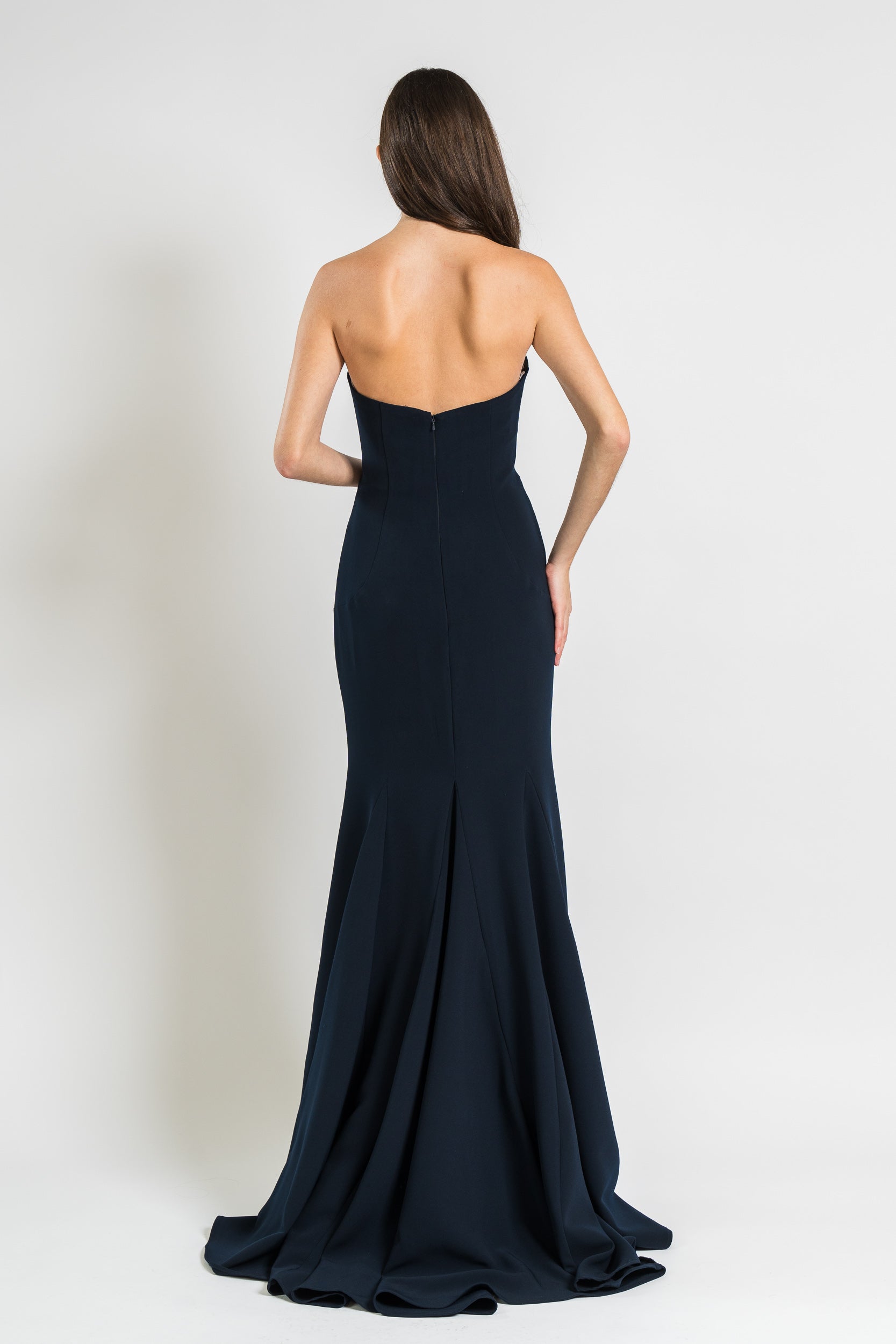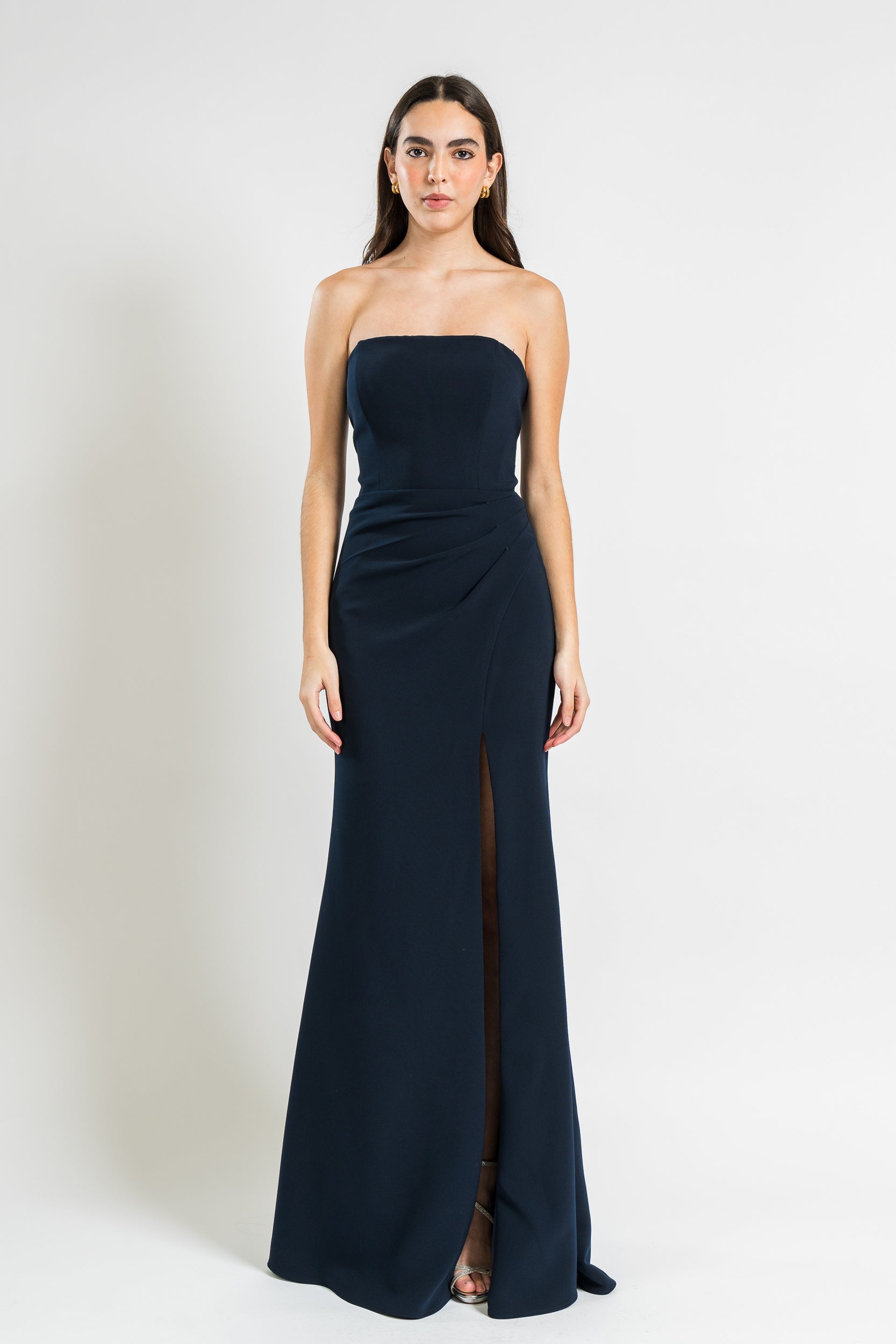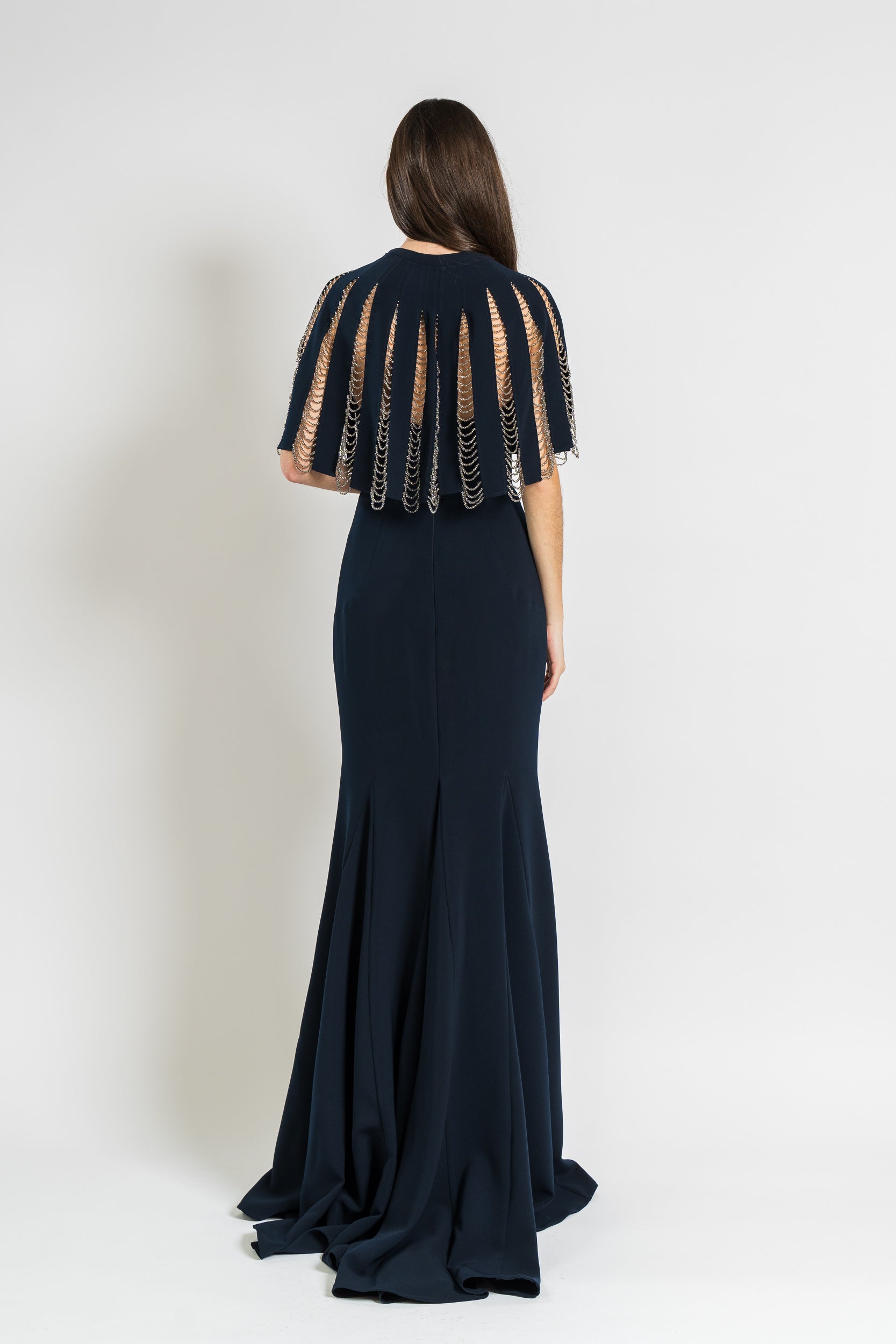 Gown with Chain Fringe Detail and Side Slit in Navy by Jovani.
