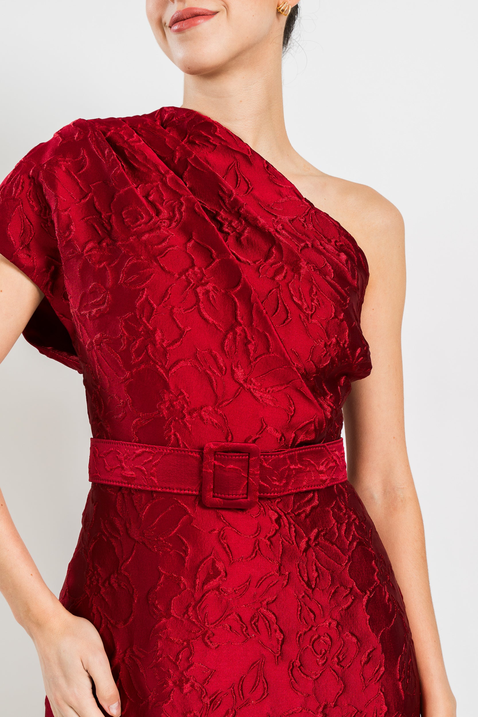 One Shoulder Jacquard Gown in Ruby by Badgley Mischka.