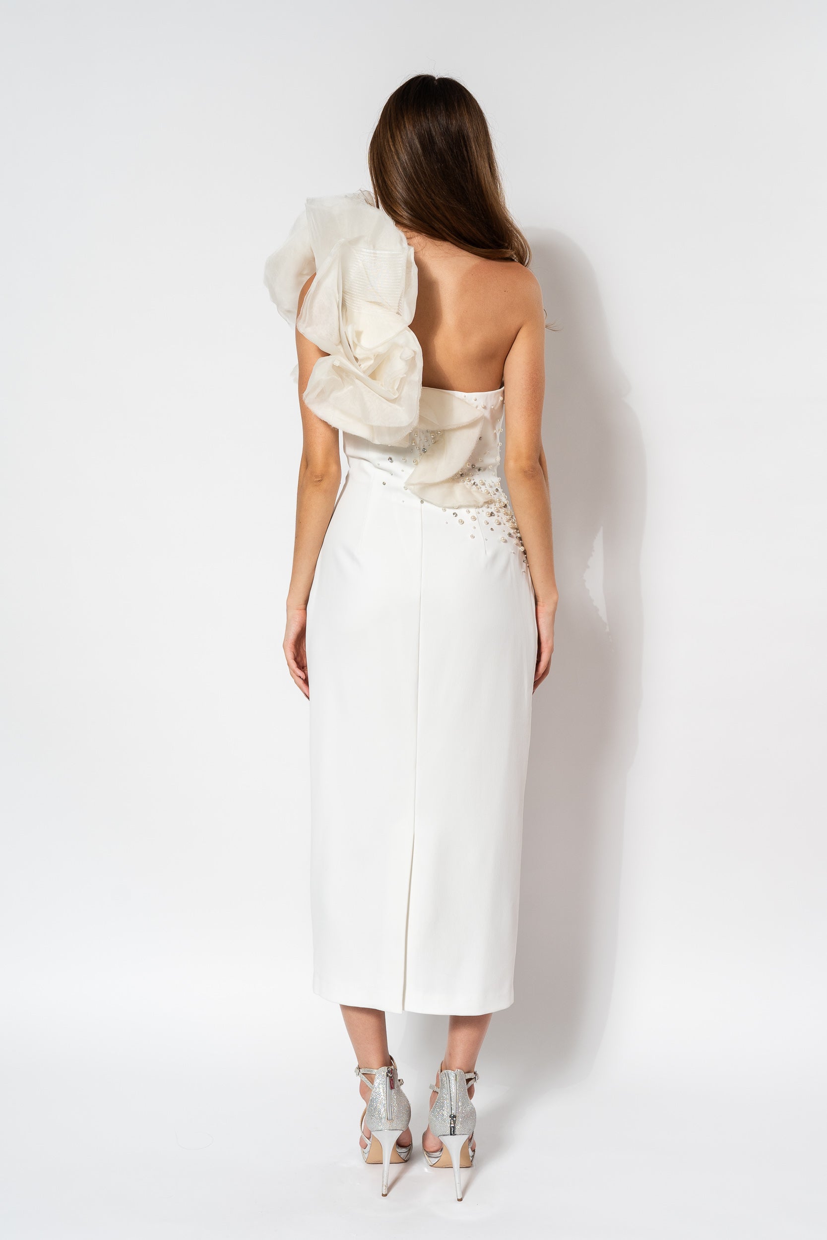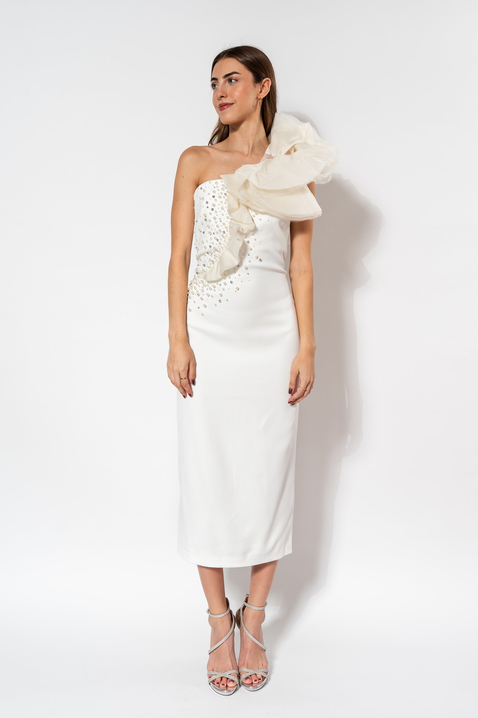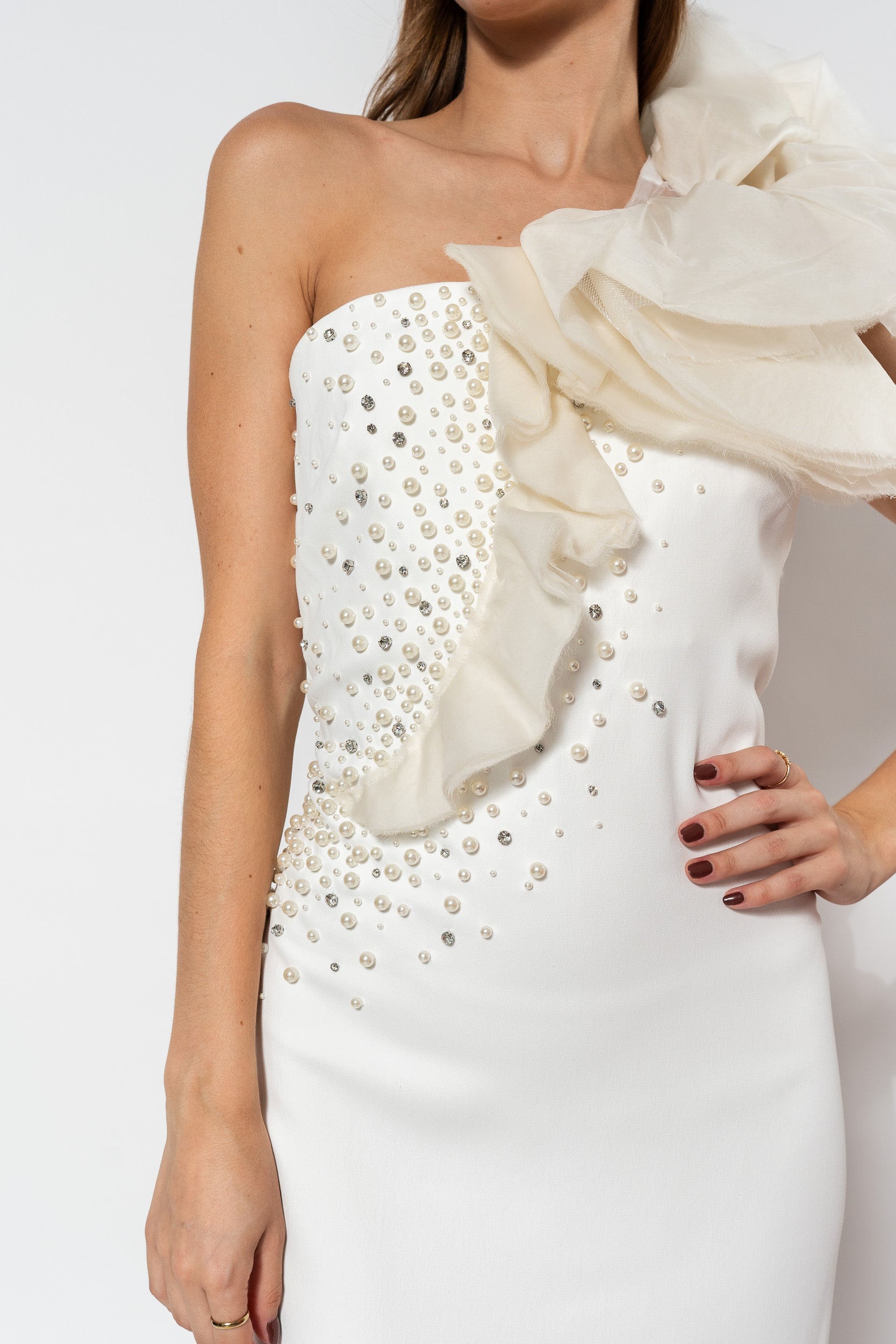 Pearl Crystal Organza Ruffle One-Shoulder Sheath Dress in Ivory by Badgley Mischka.