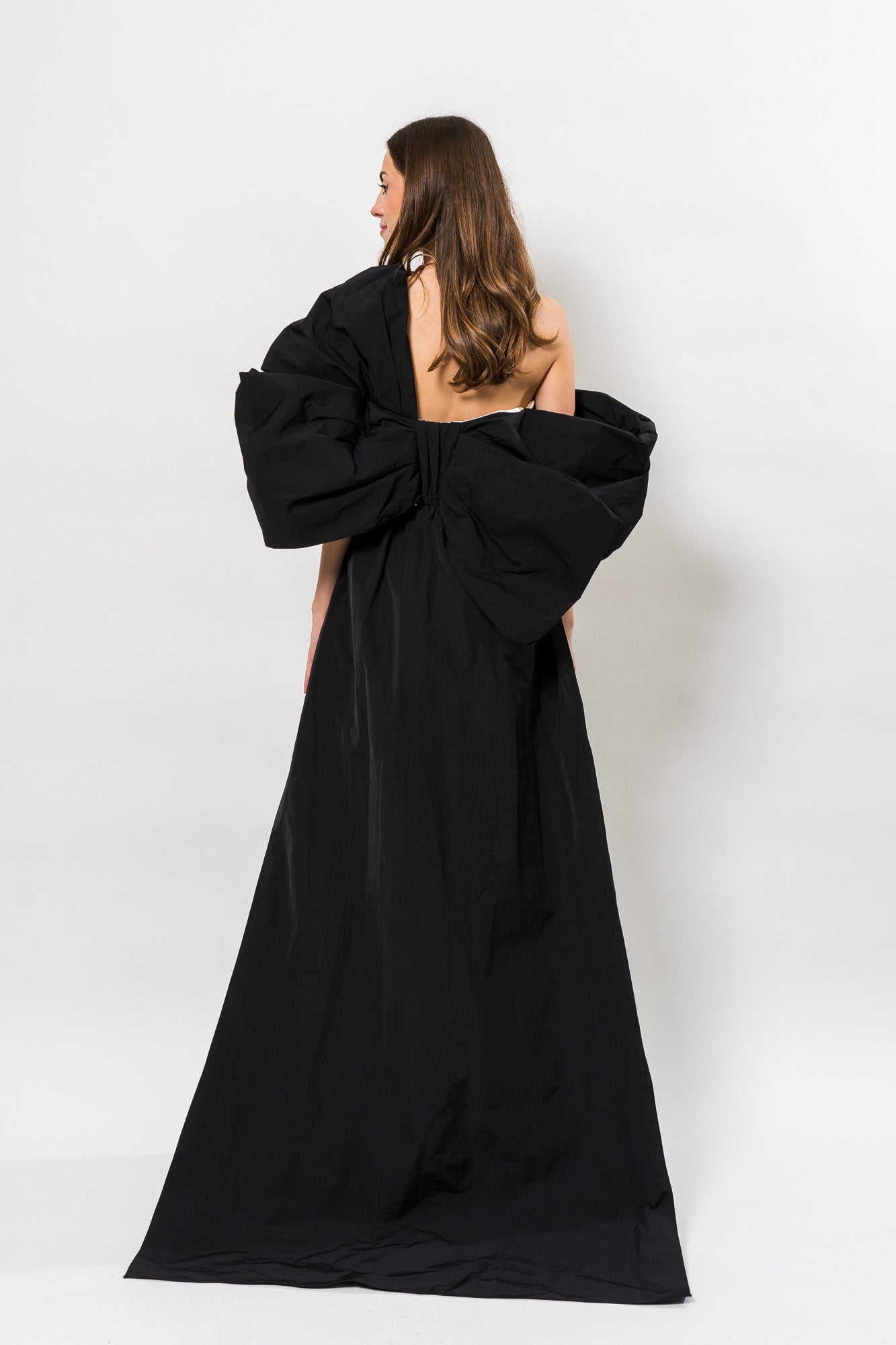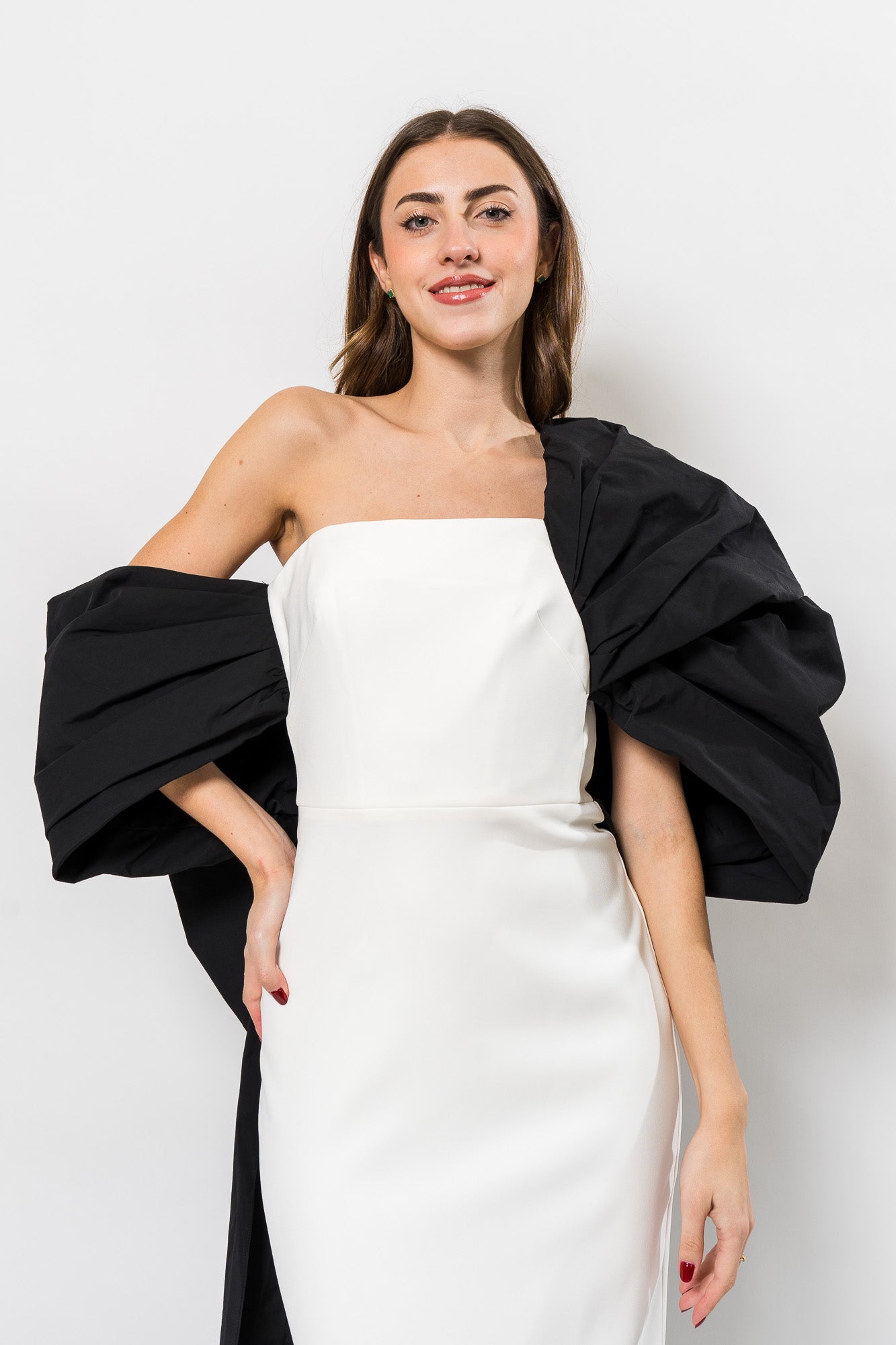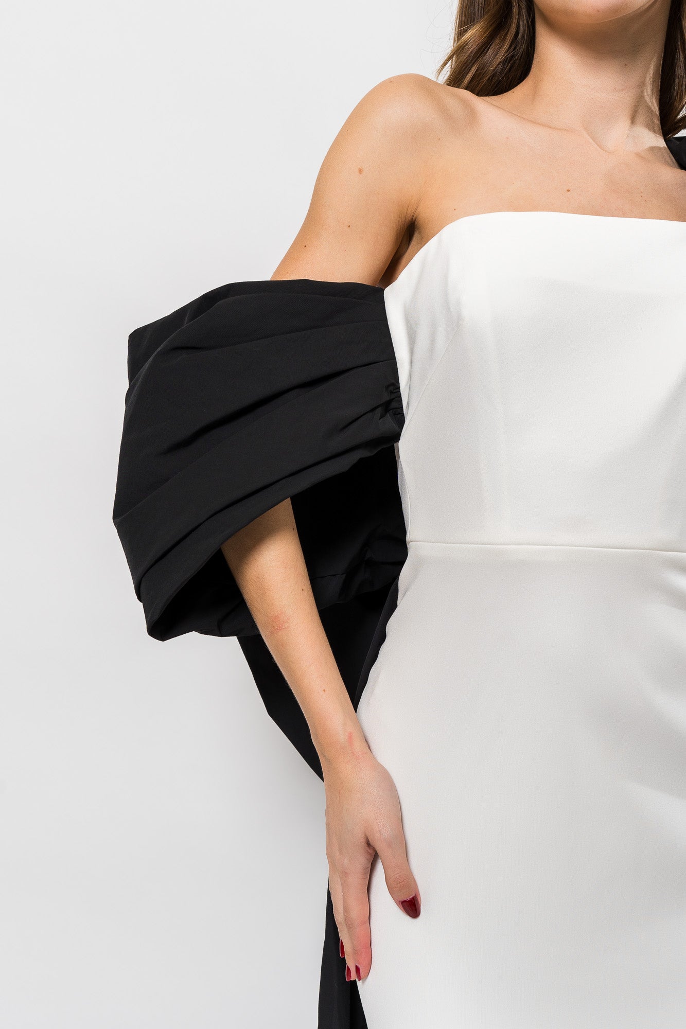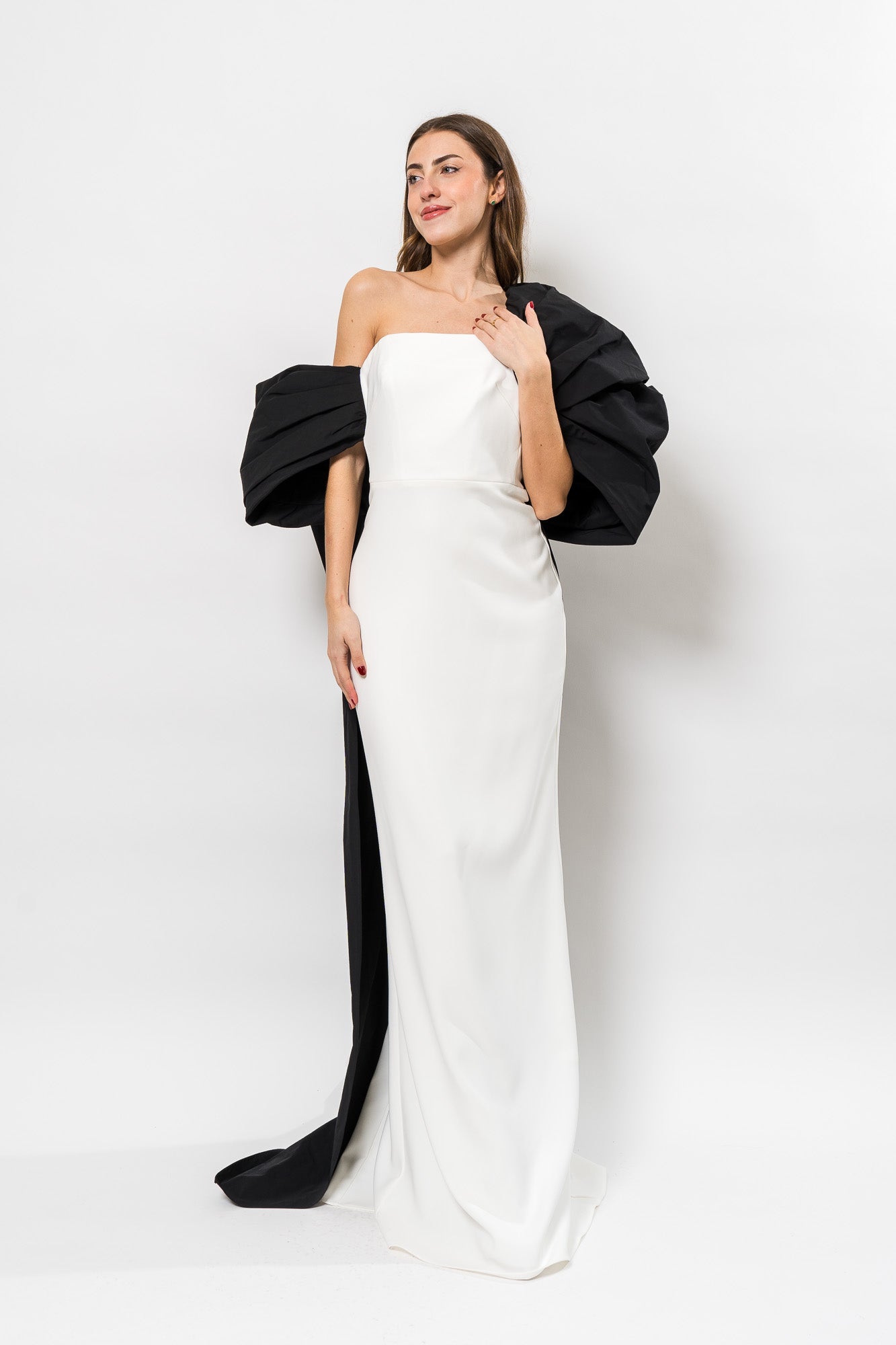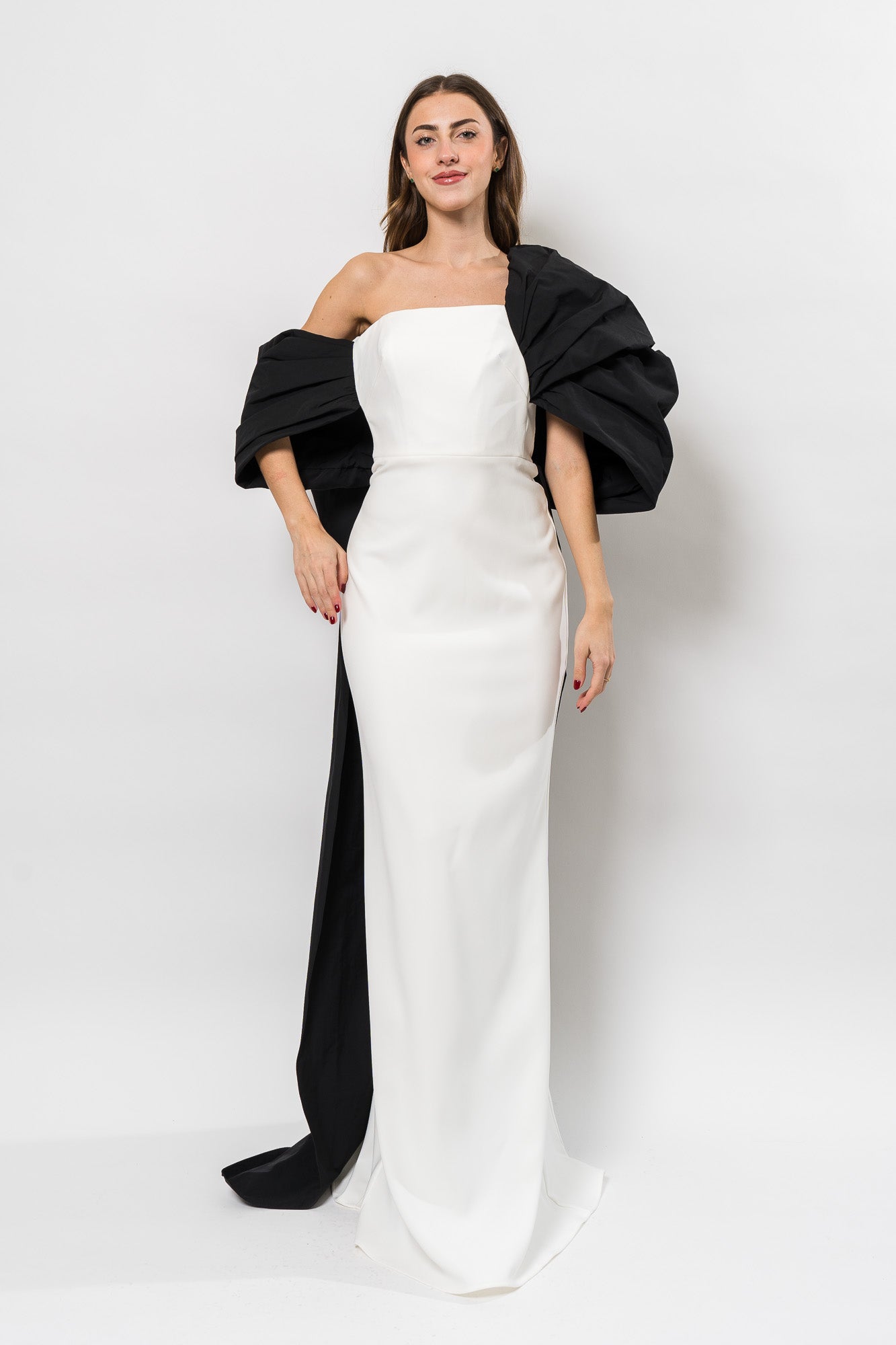 Crepe Column Gown with A-Symetrical in Ivory/Black by Marchesa Notte.