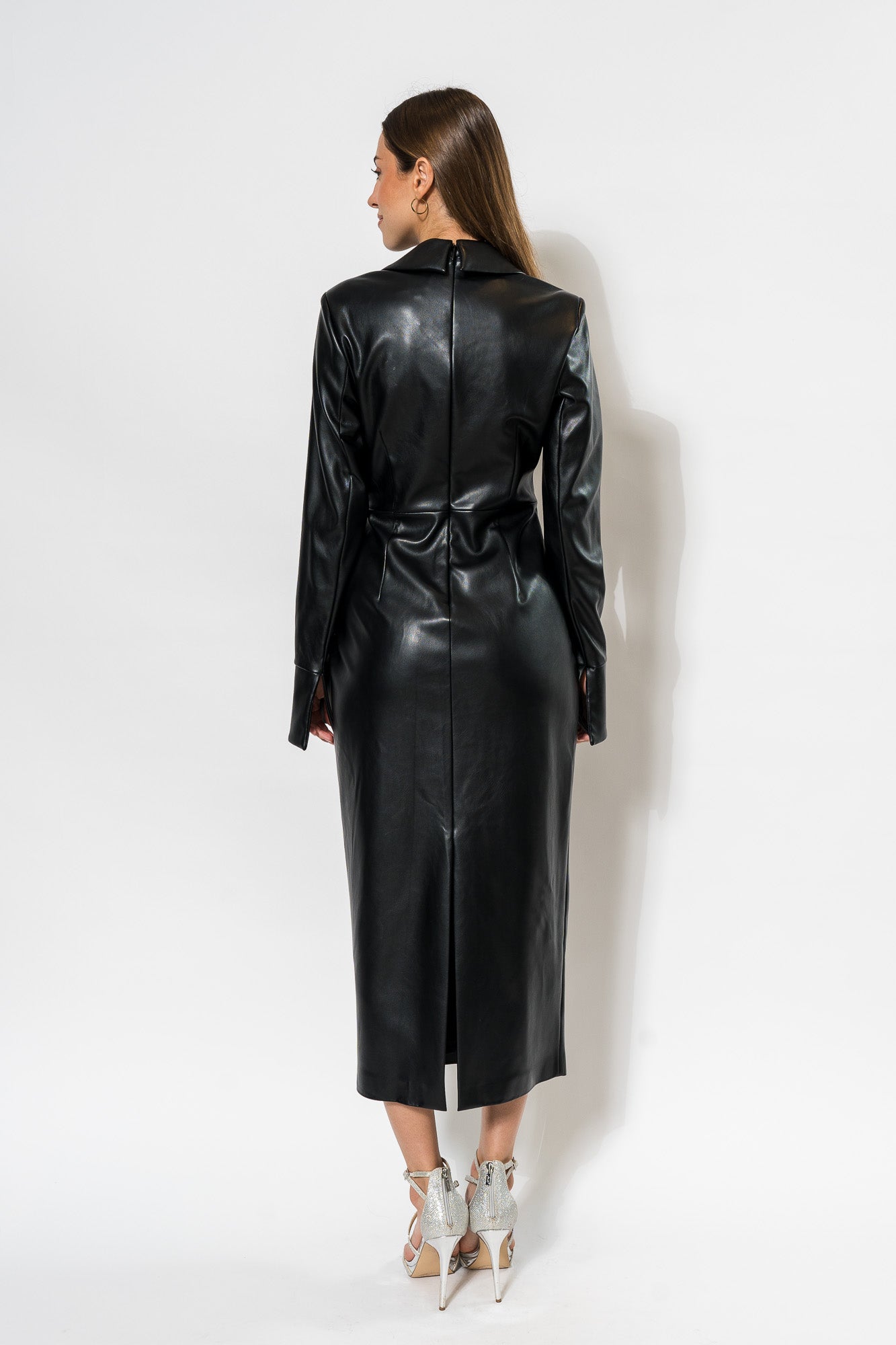 Black Twist Faux Leather Cocktail Dress in Black by Badgley Mischka.