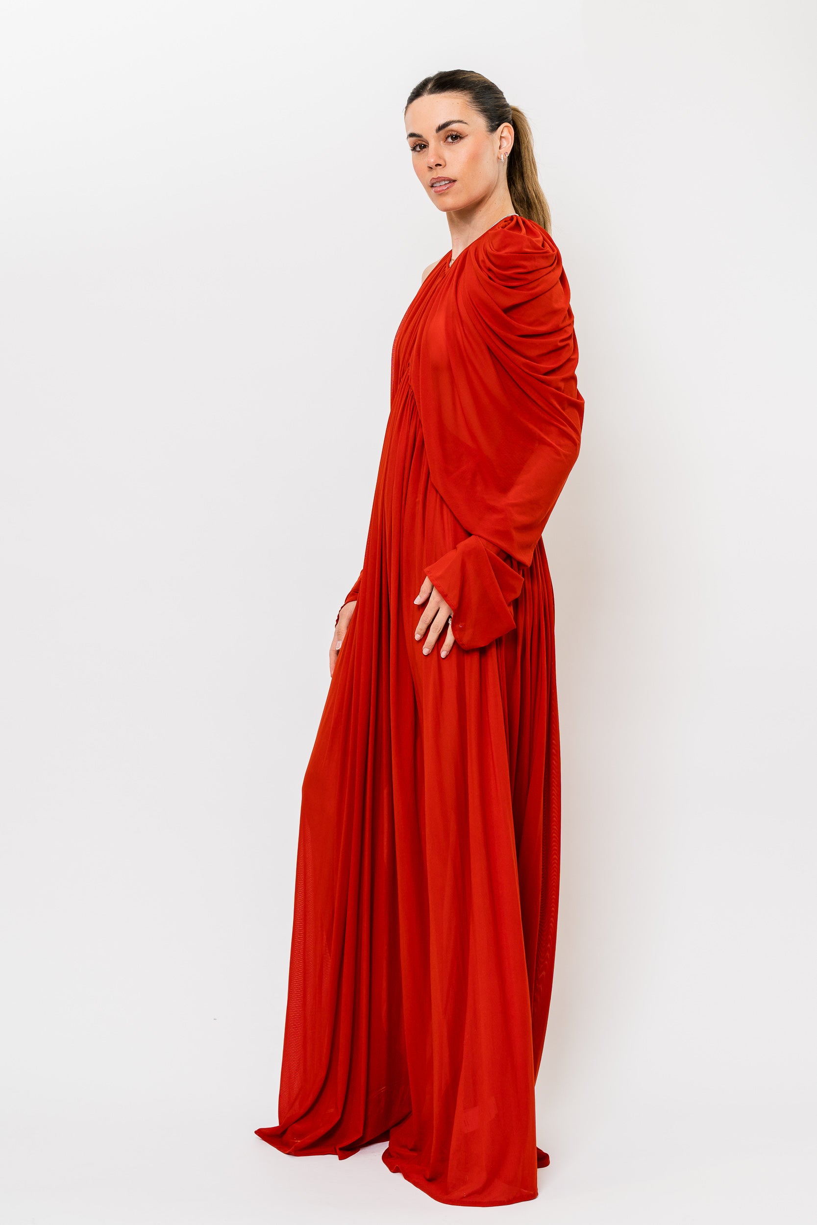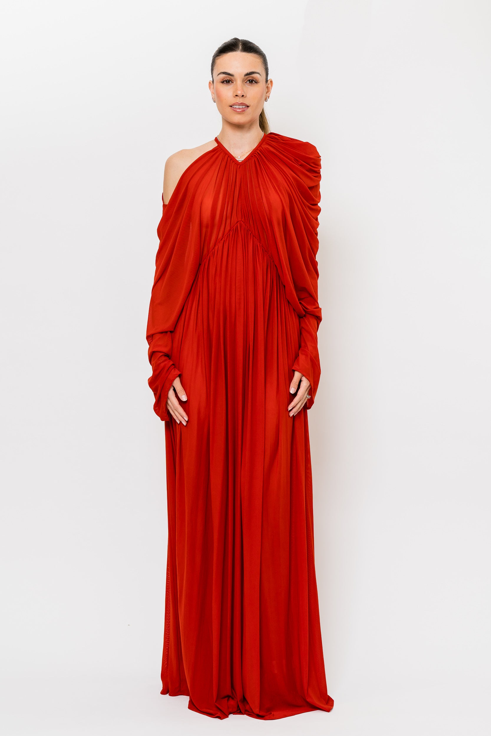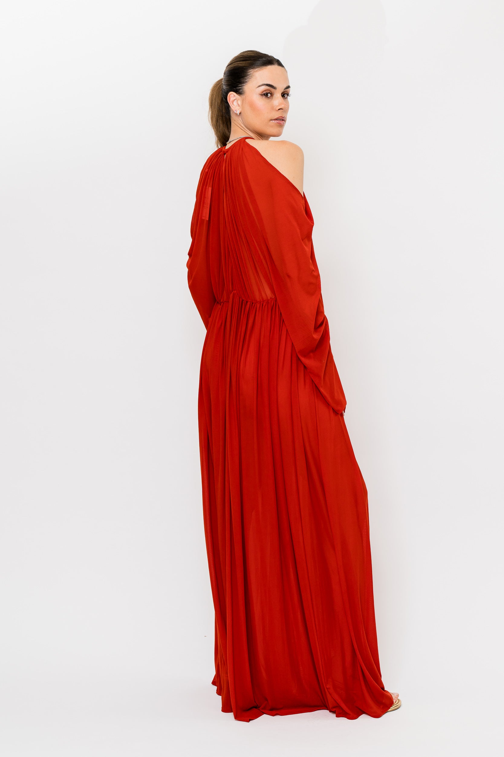 The Abigail Draped Dress is a sculptural elegance in Hibicus by Demme by Gabriella.