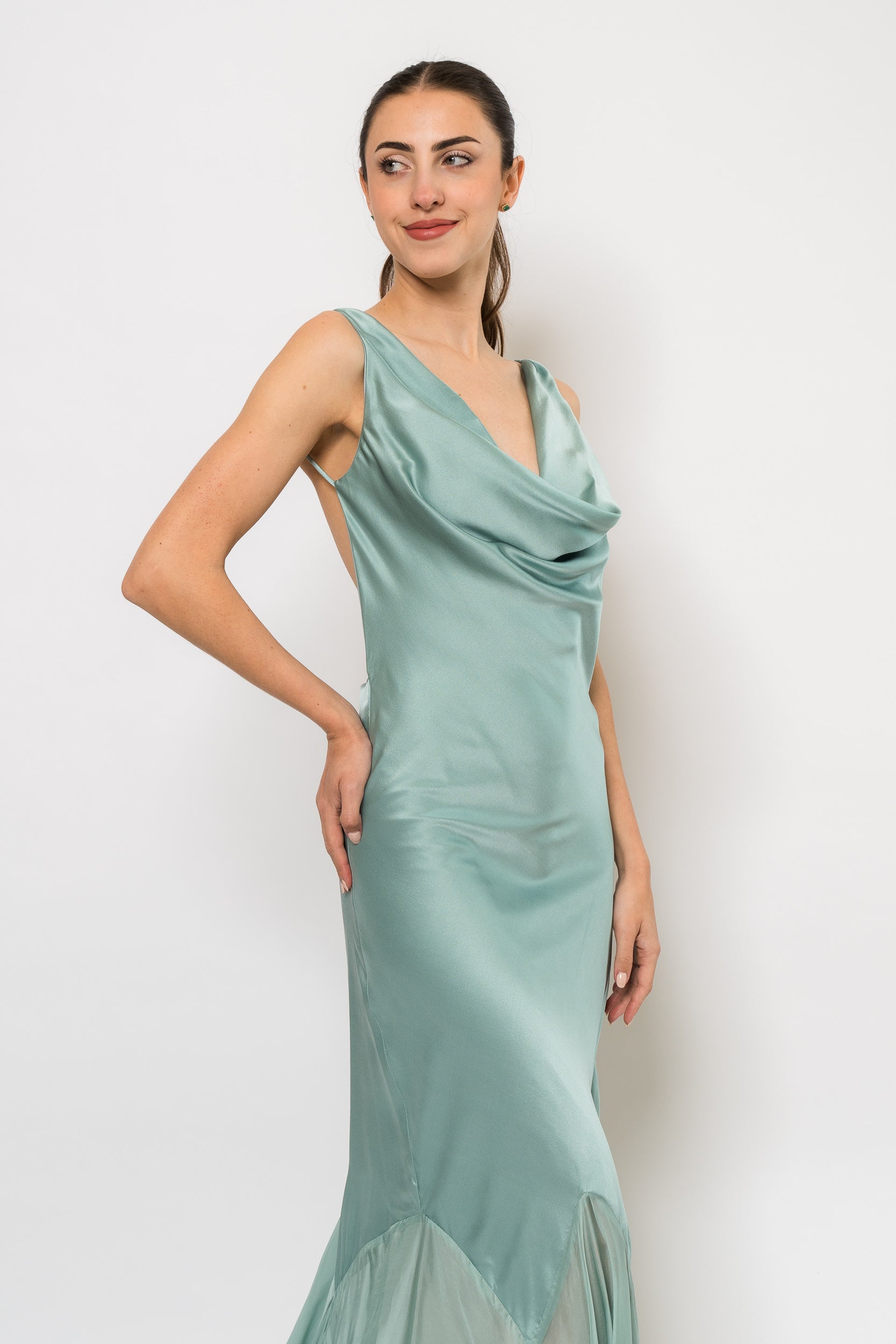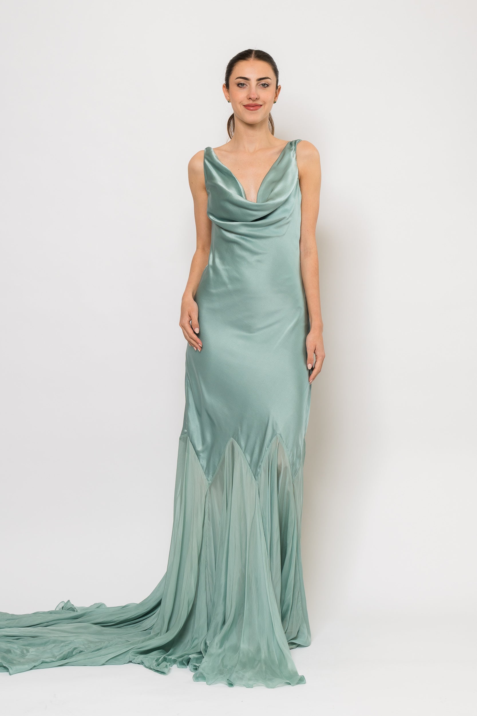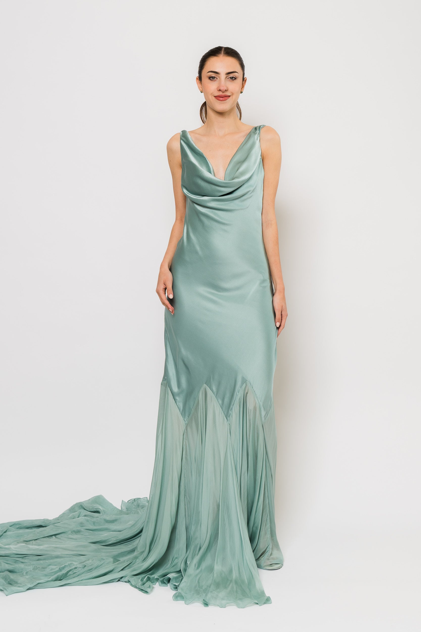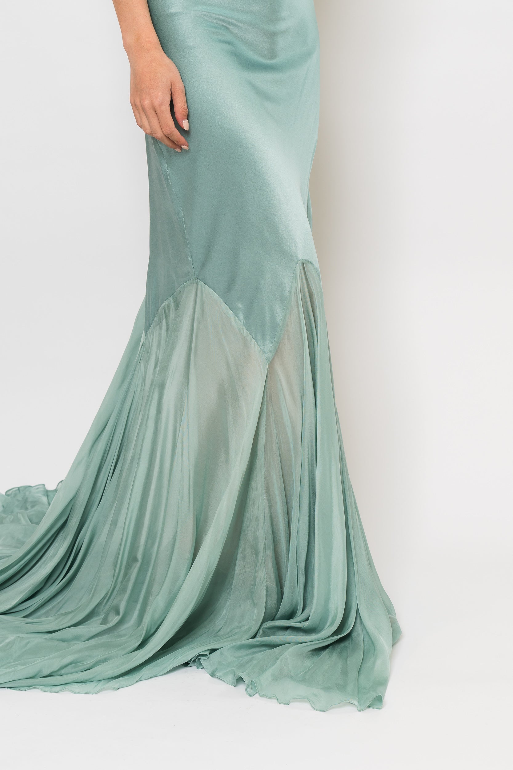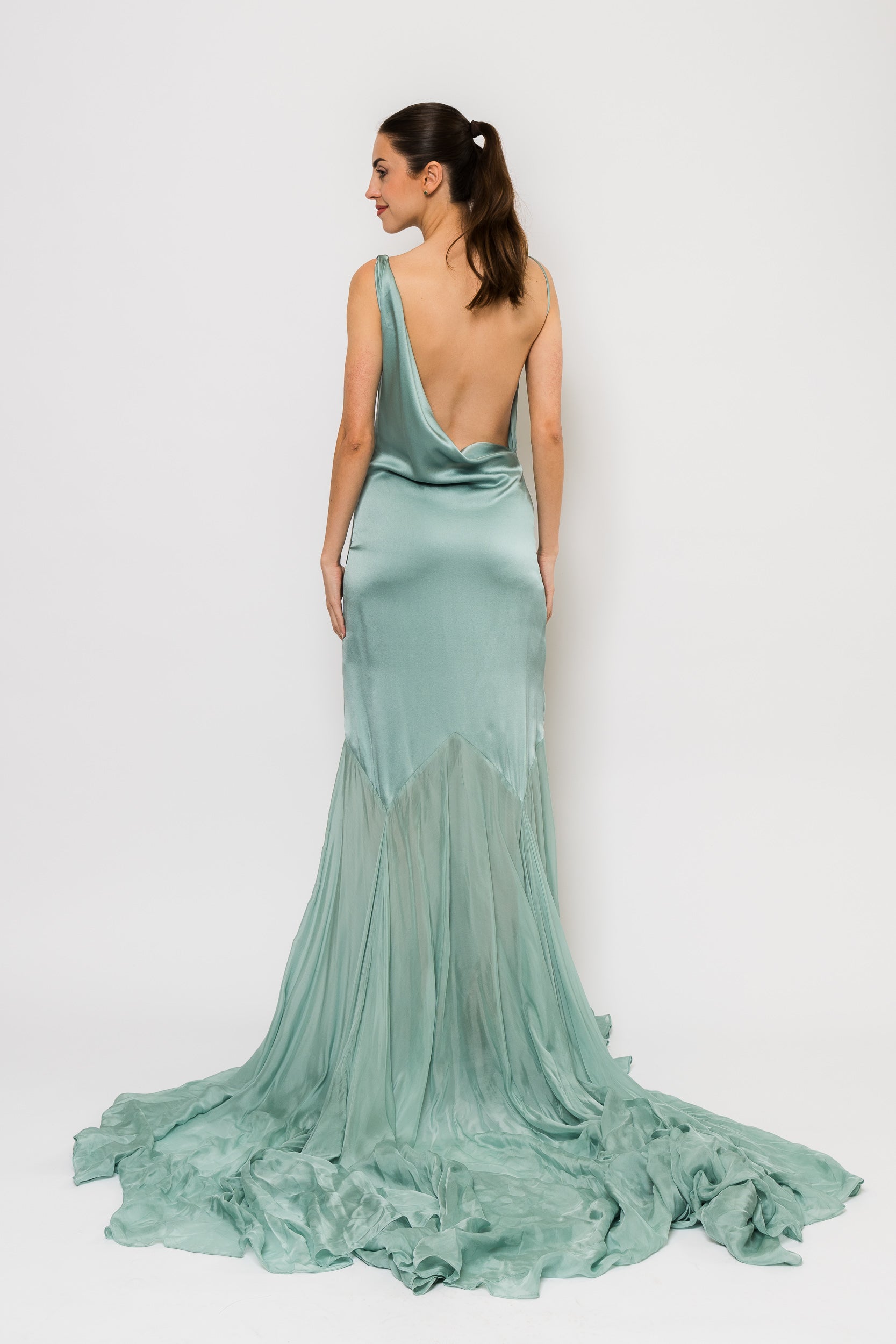 The Collen is a true statement piece elegant, elevated, and designed for special occasions where timeless glamour is essential in Pale Teal by Demme by Gabiella.