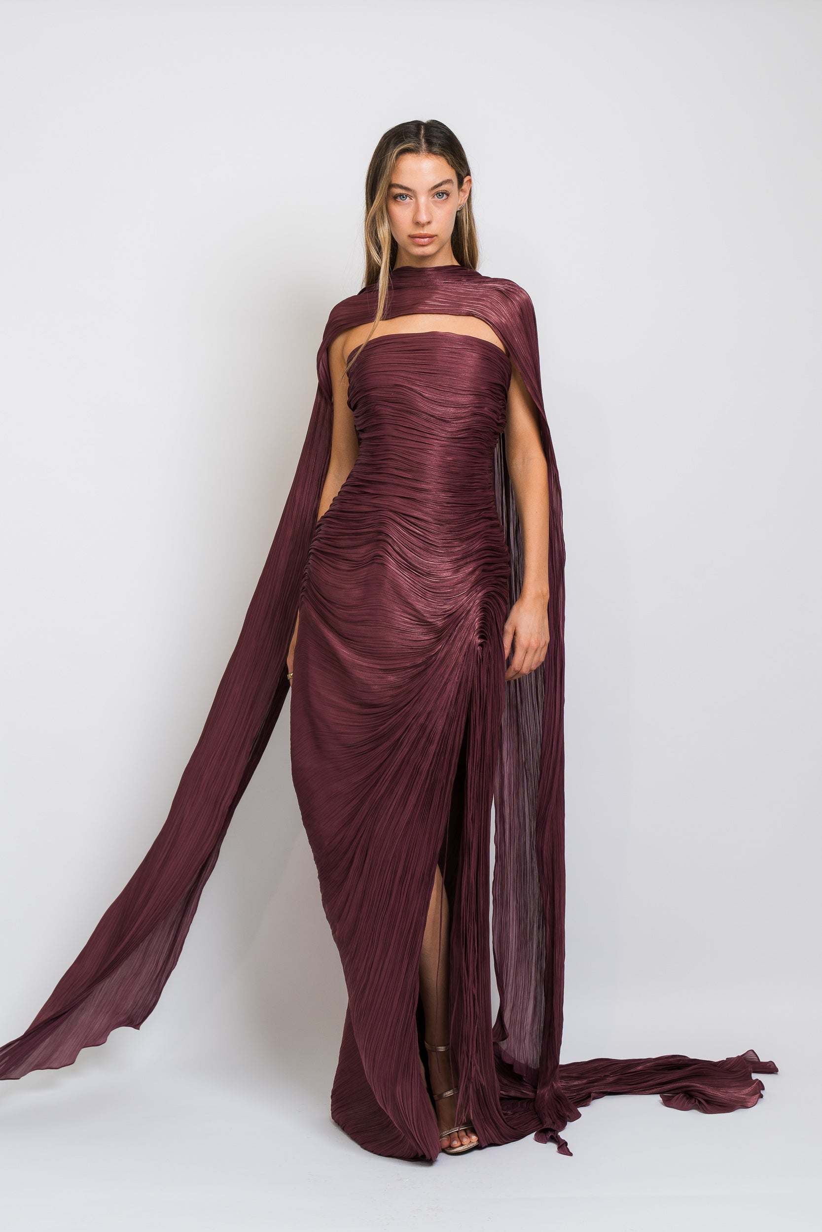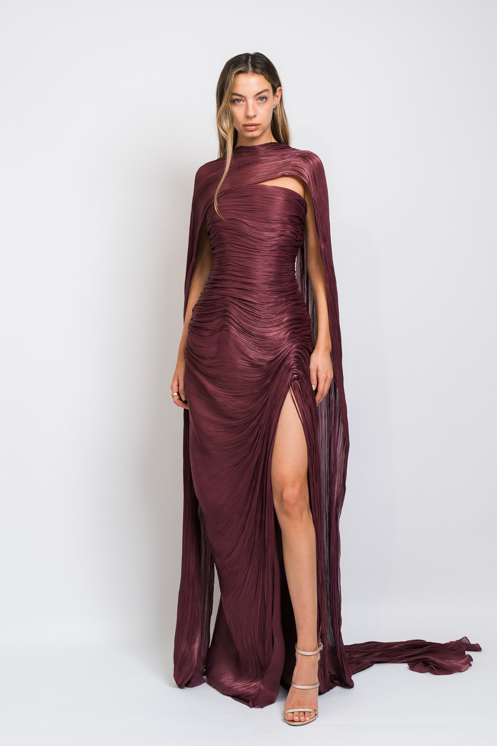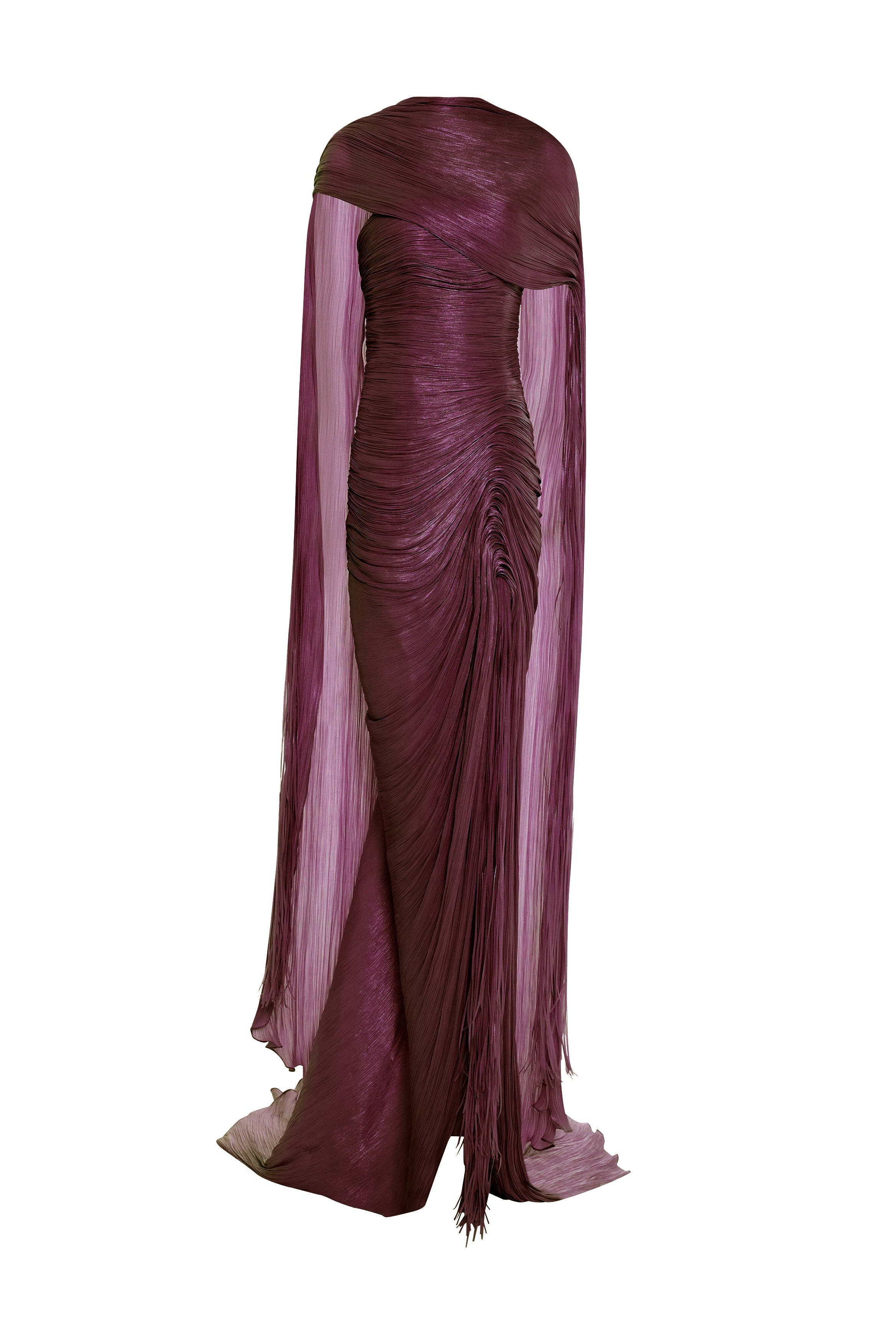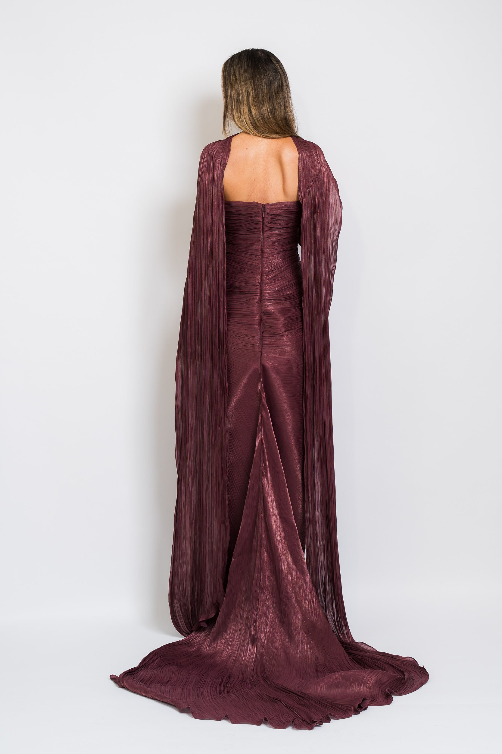 Tatiana Strapless Pleated Silk Gown With Slit, Fringes, Corset and Cape in Burgundy by Marmar Halim.