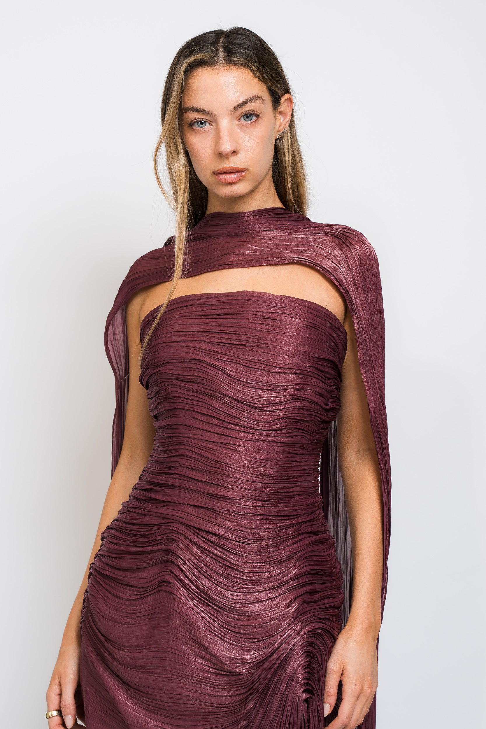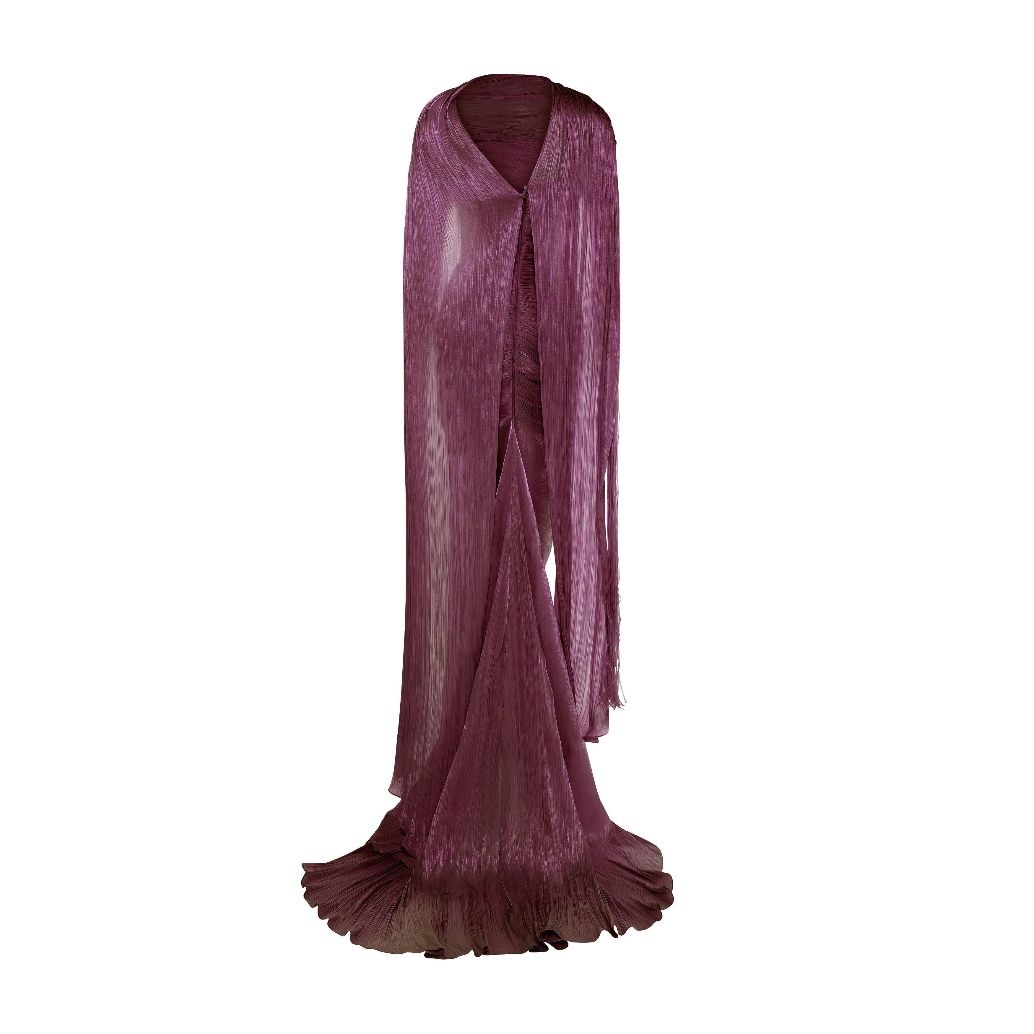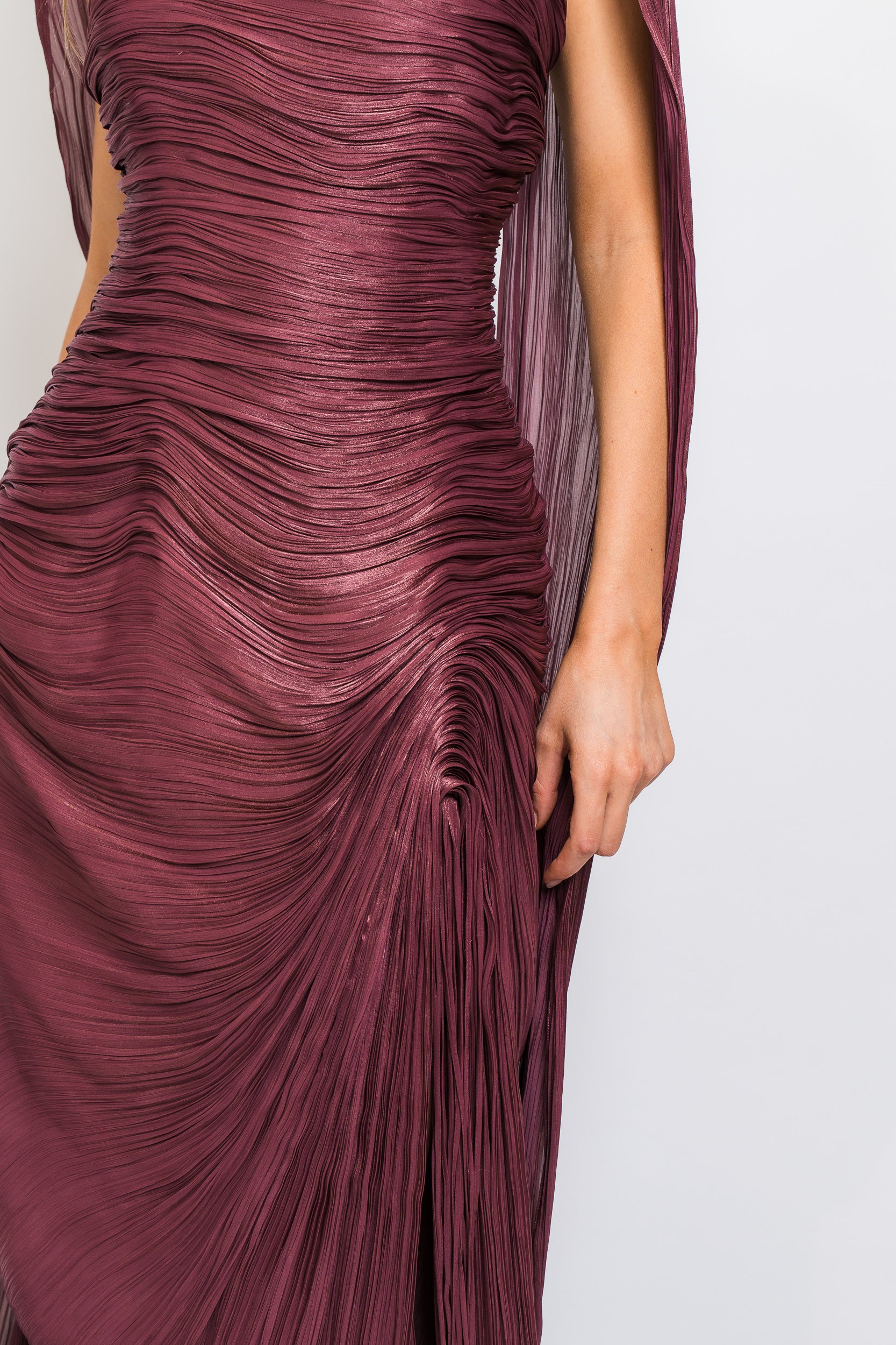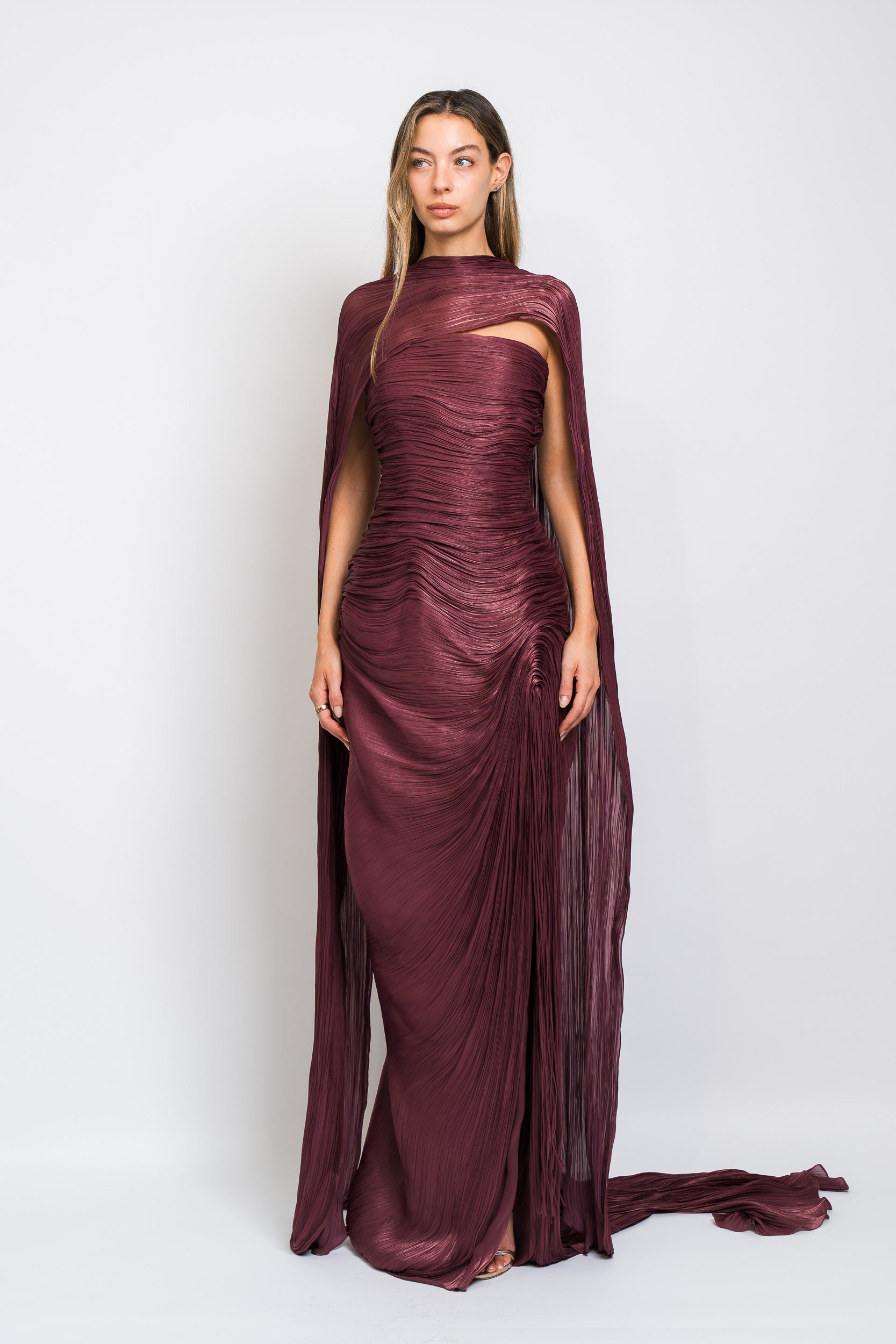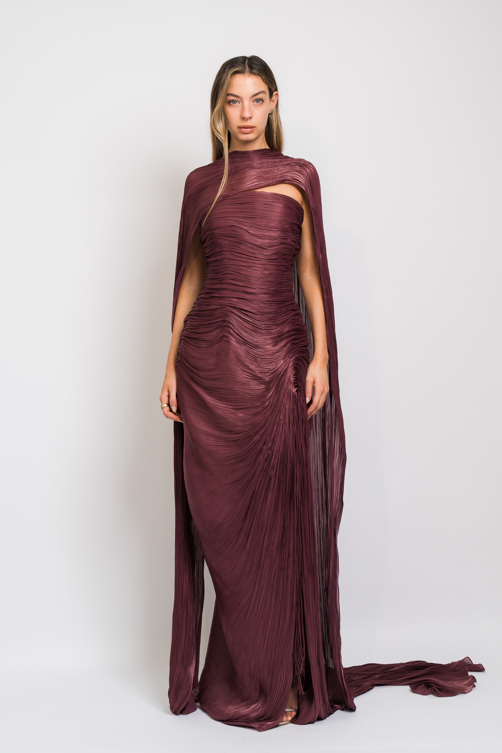 Tatiana Strapless Pleated Silk Gown With Slit, Fringes, Corset and Cape in Burgundy by Marmar Halim.