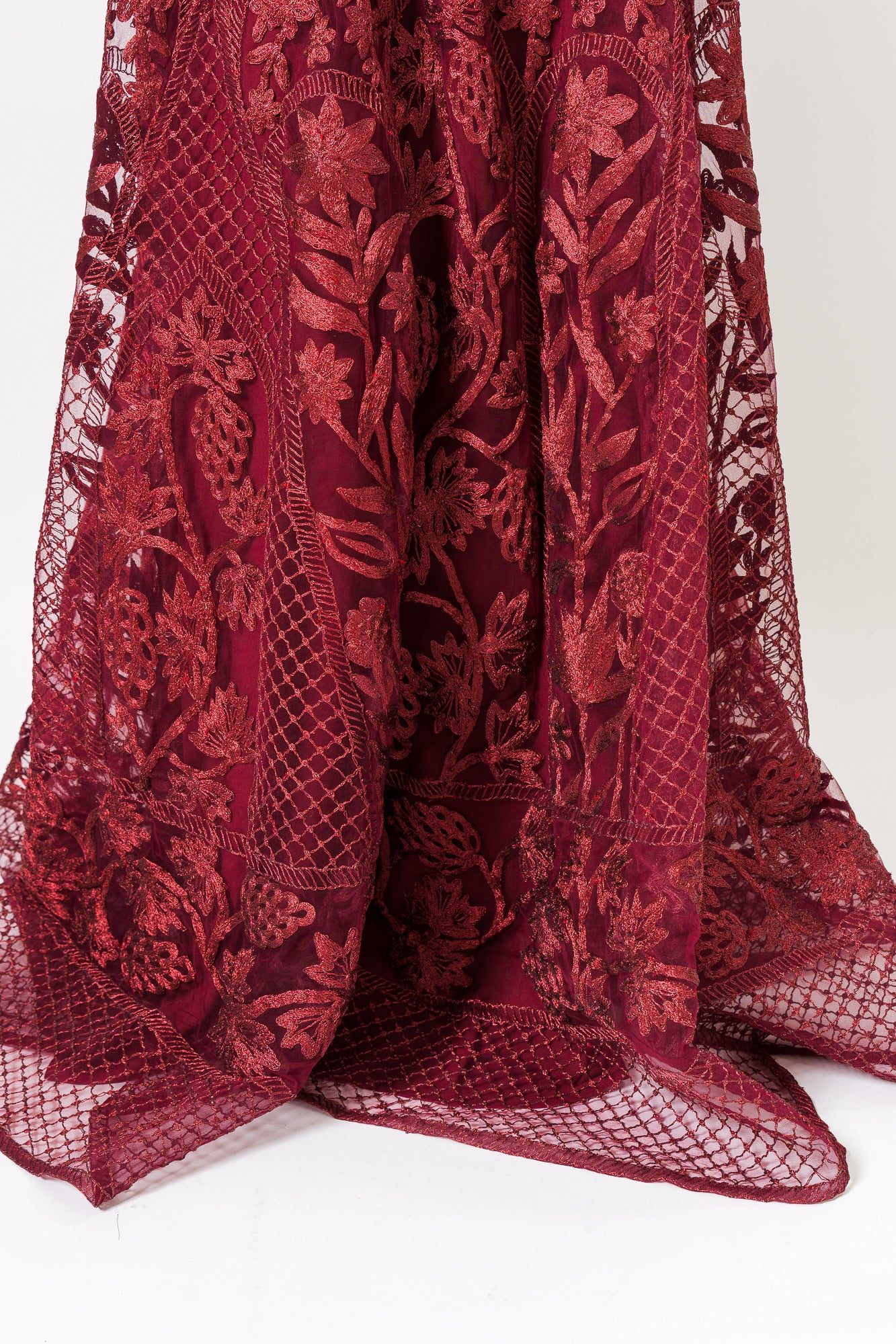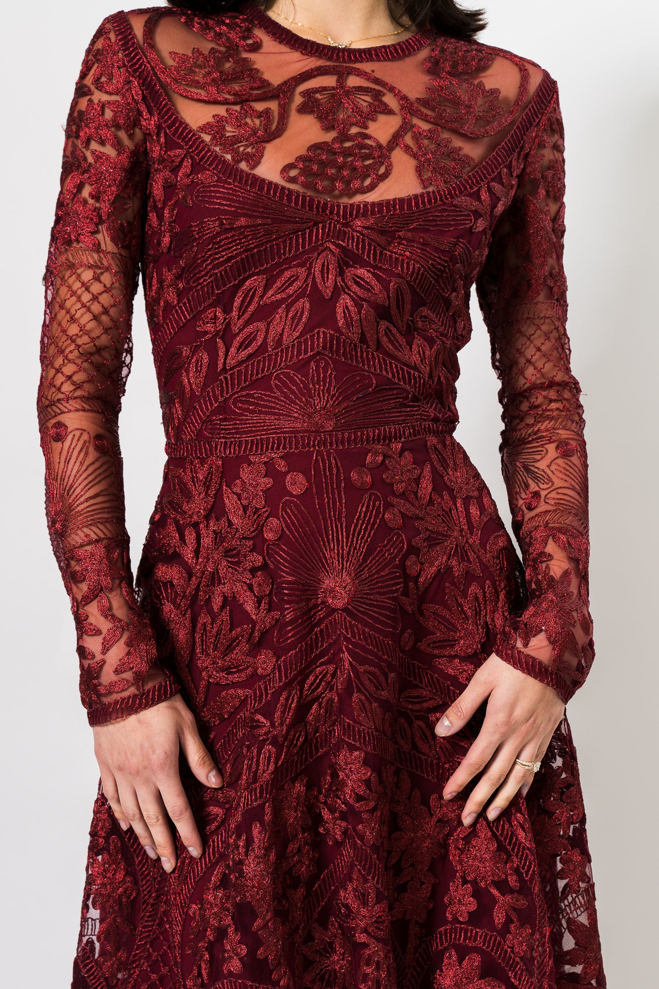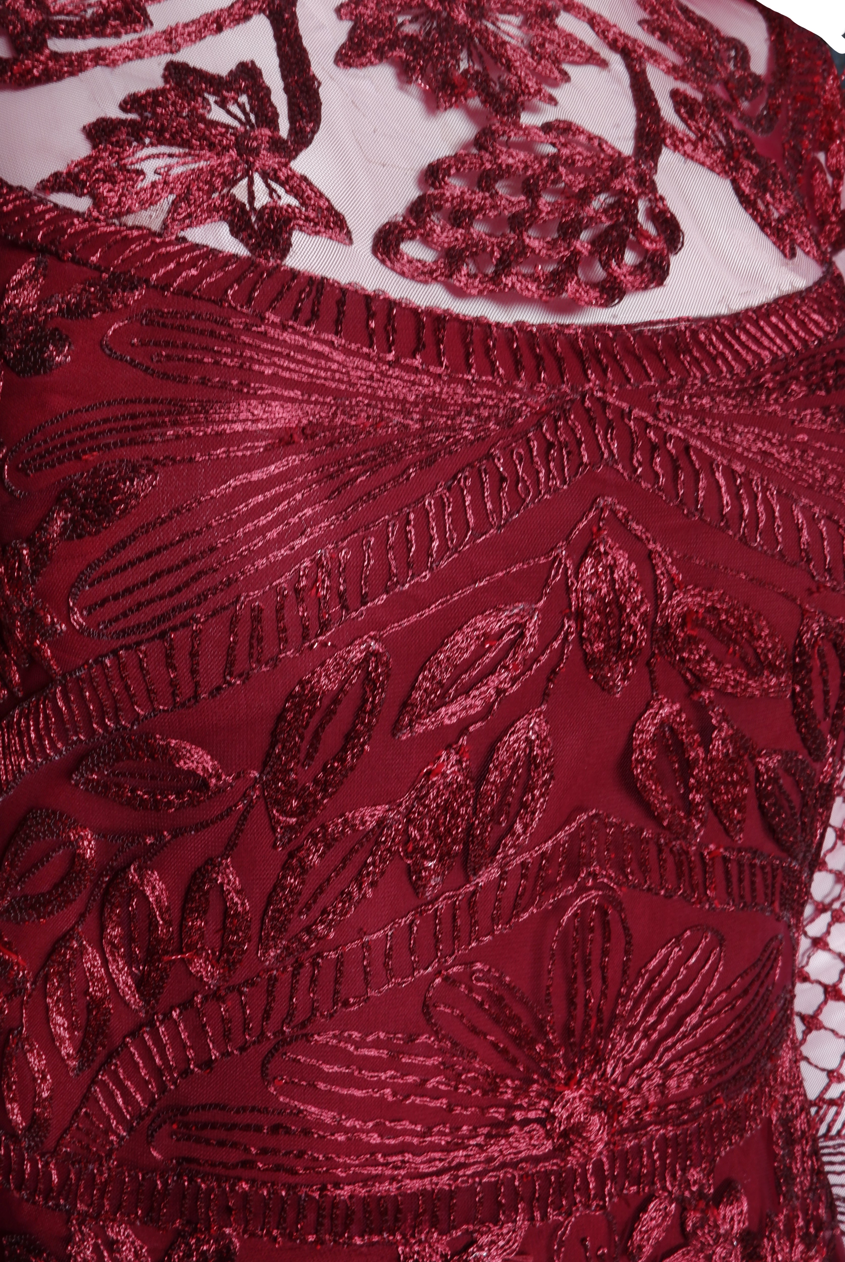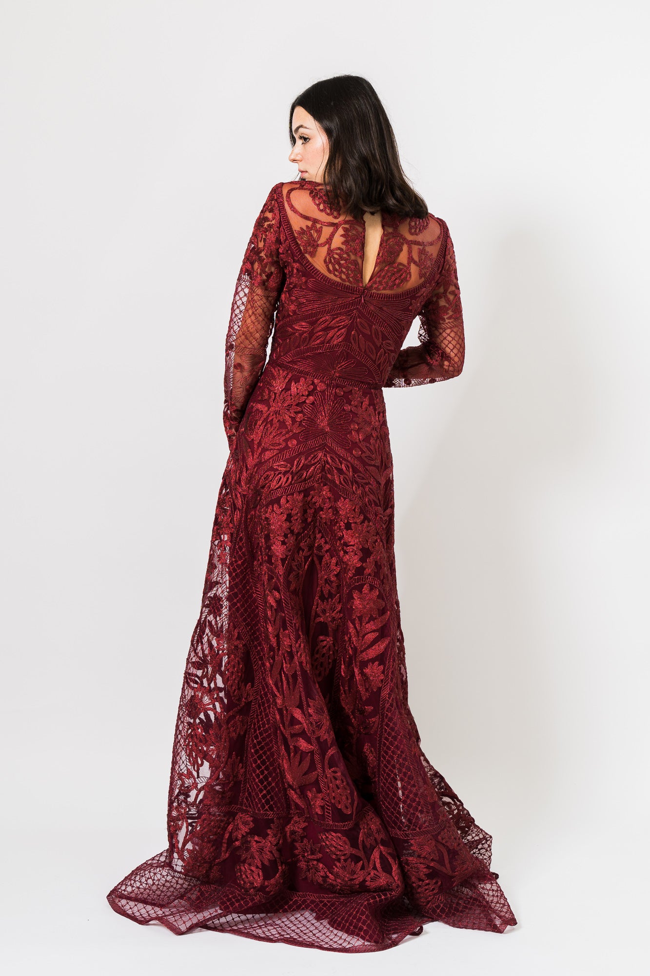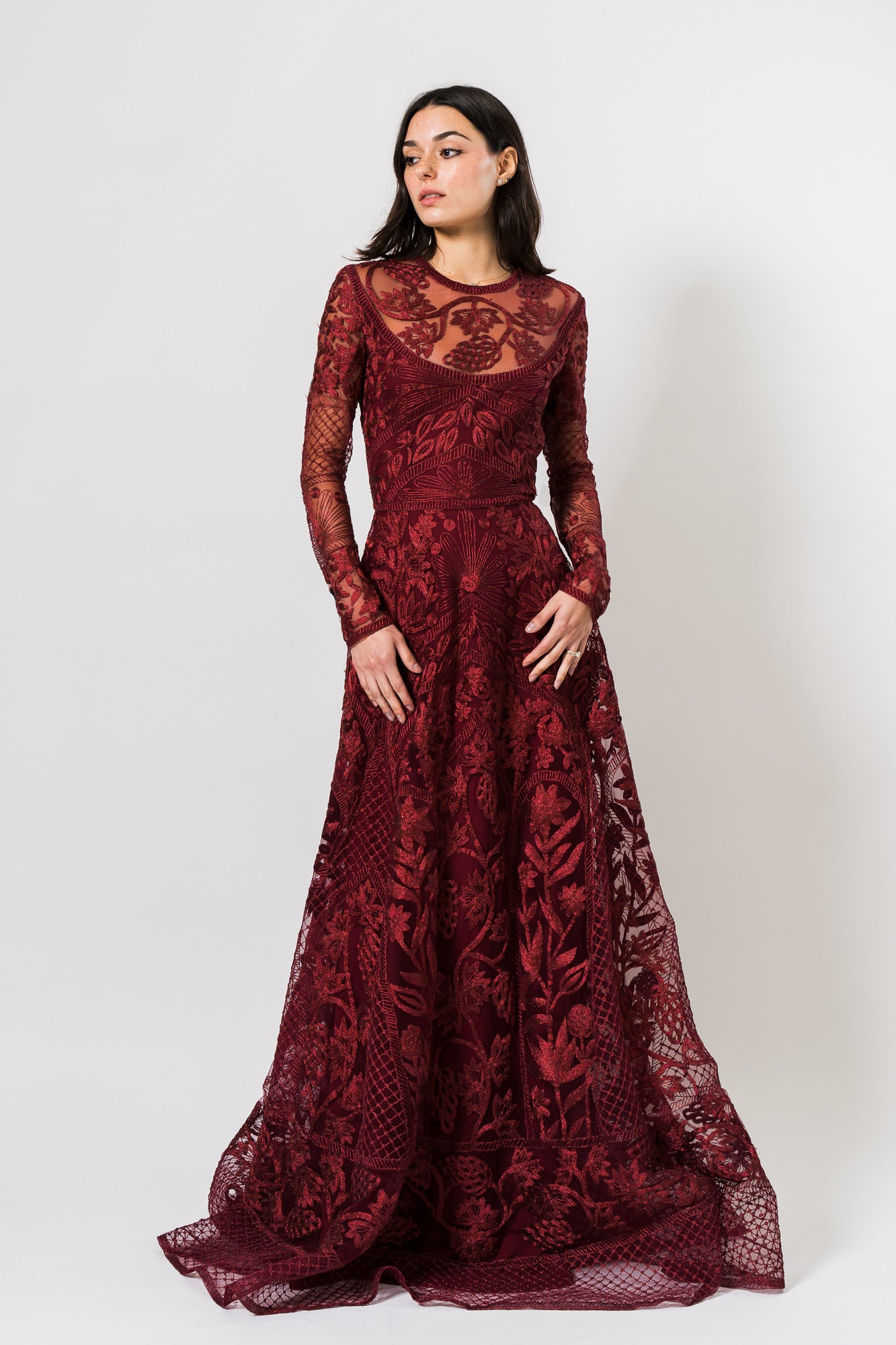 Metallic Threadwork Jewel Neck Long Sleeve Gown in Burgundy by Naeem Khan.