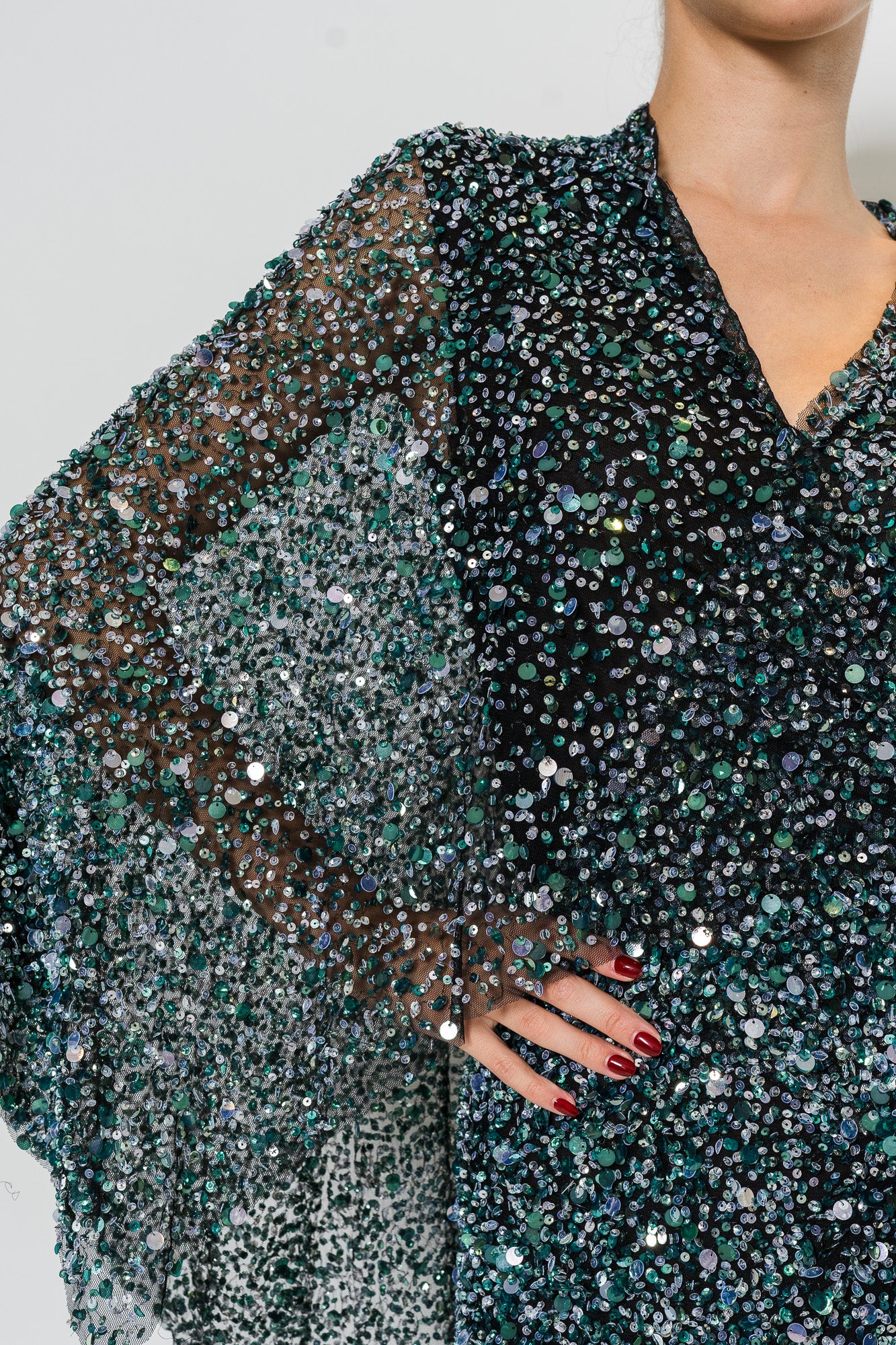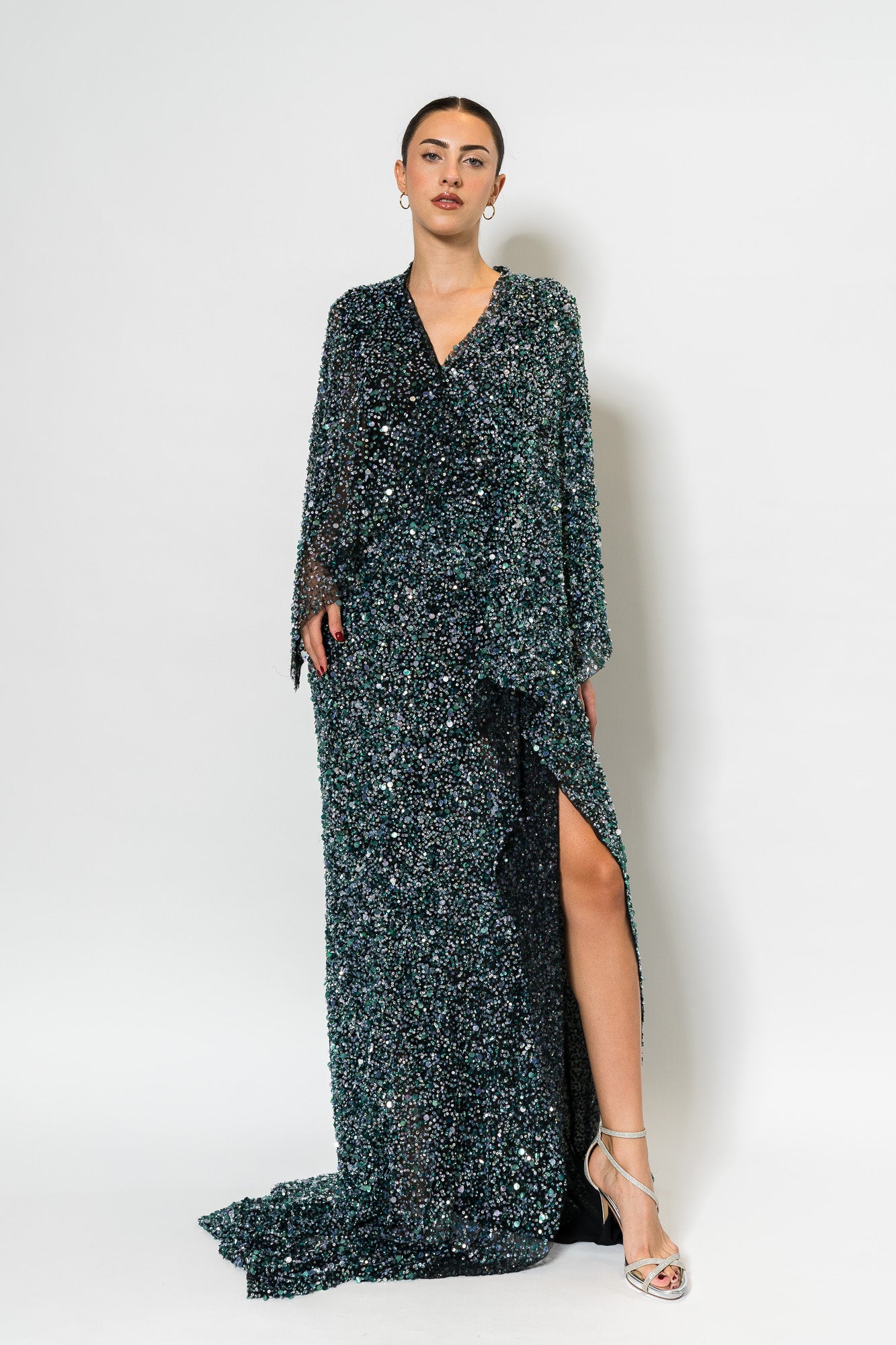 Sequin Wrap Gown in Emerald / Silver by Reem Acra.