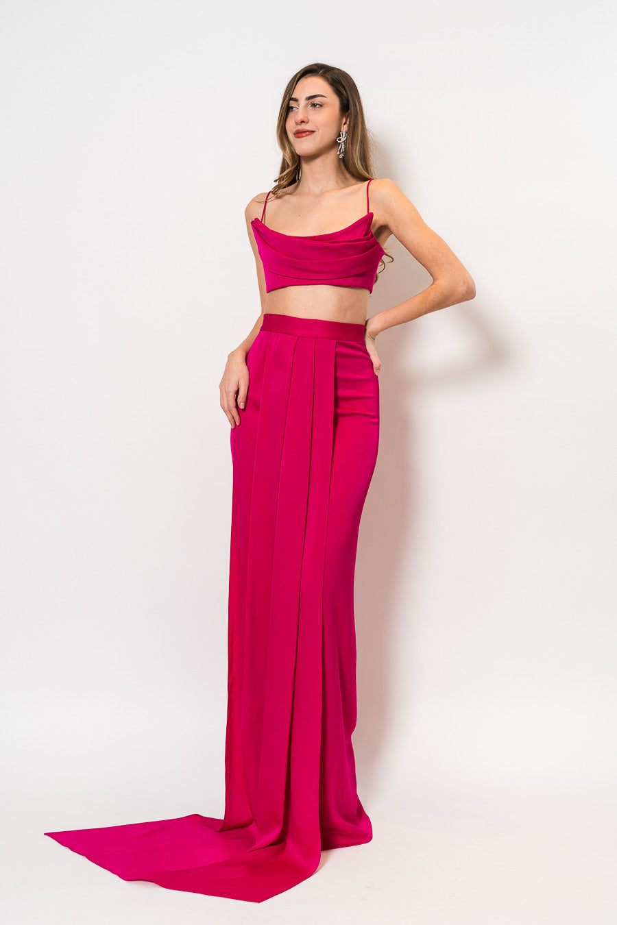 Satin Crepe Drape Crop Top & Satin Crepe Column Skirt with Sash in Raspberry by Alex Perry.