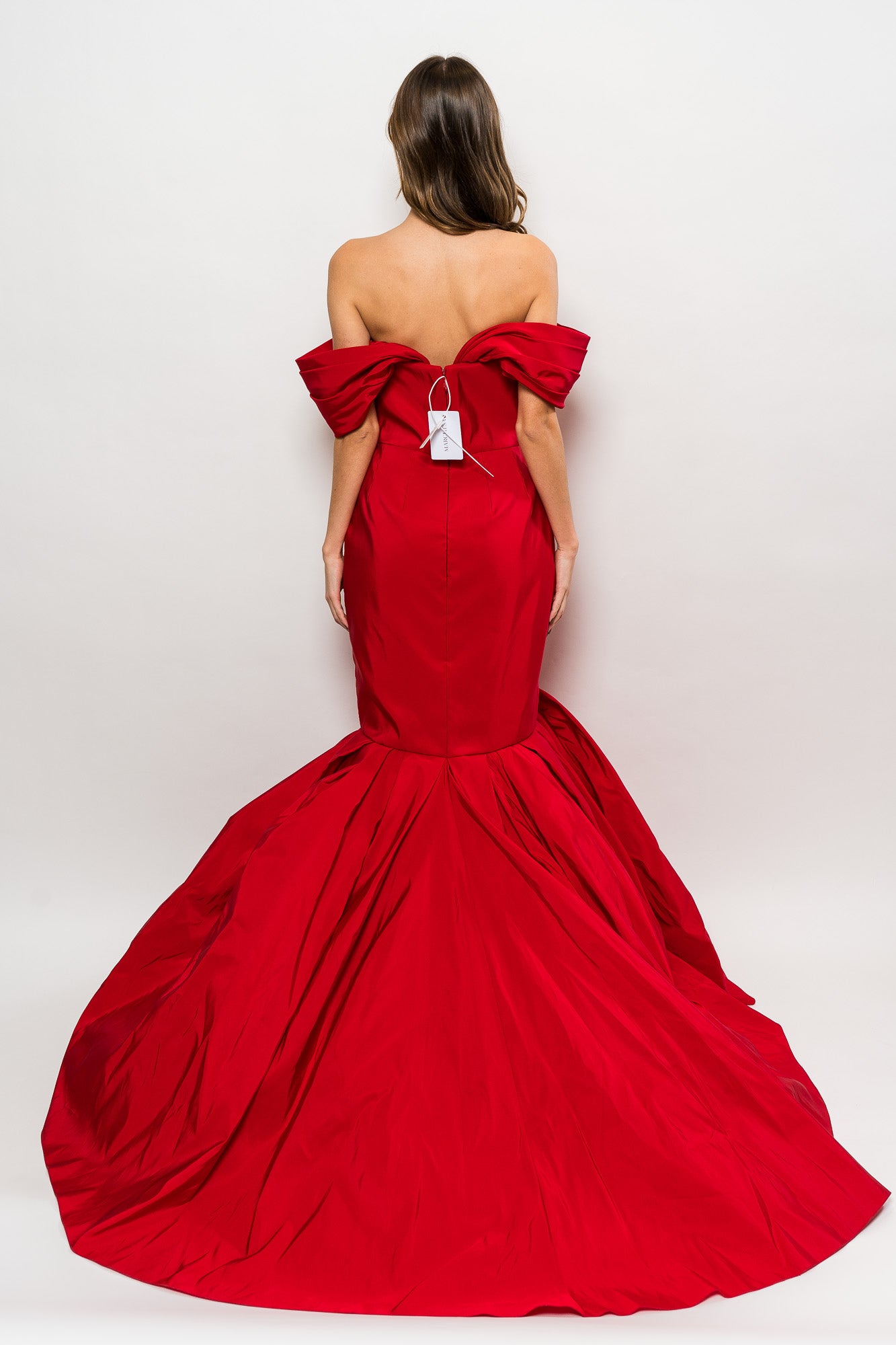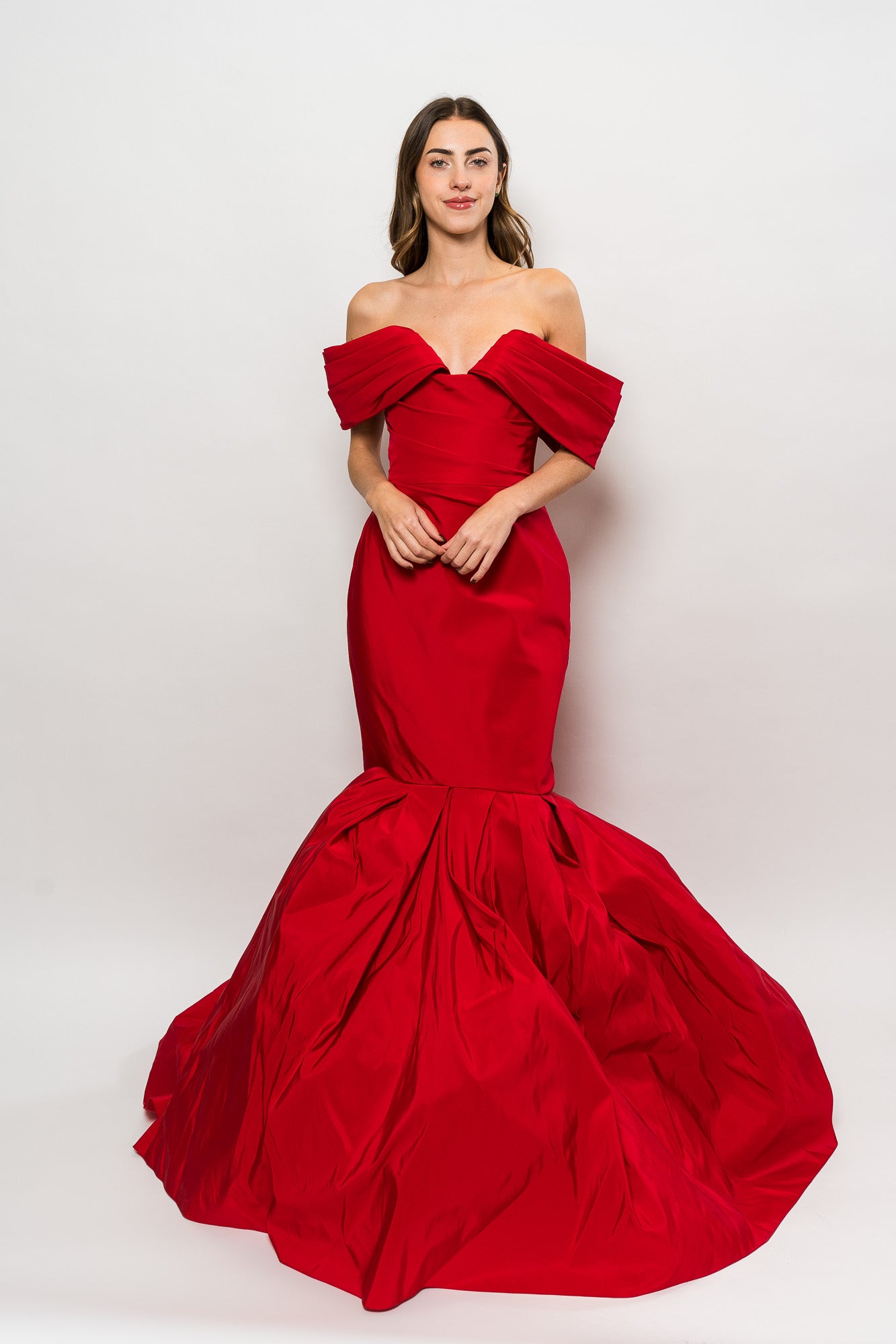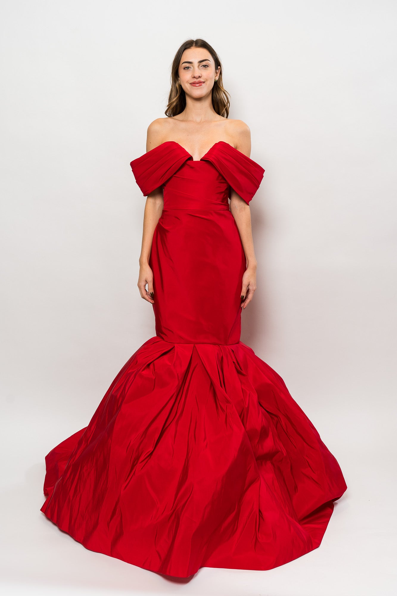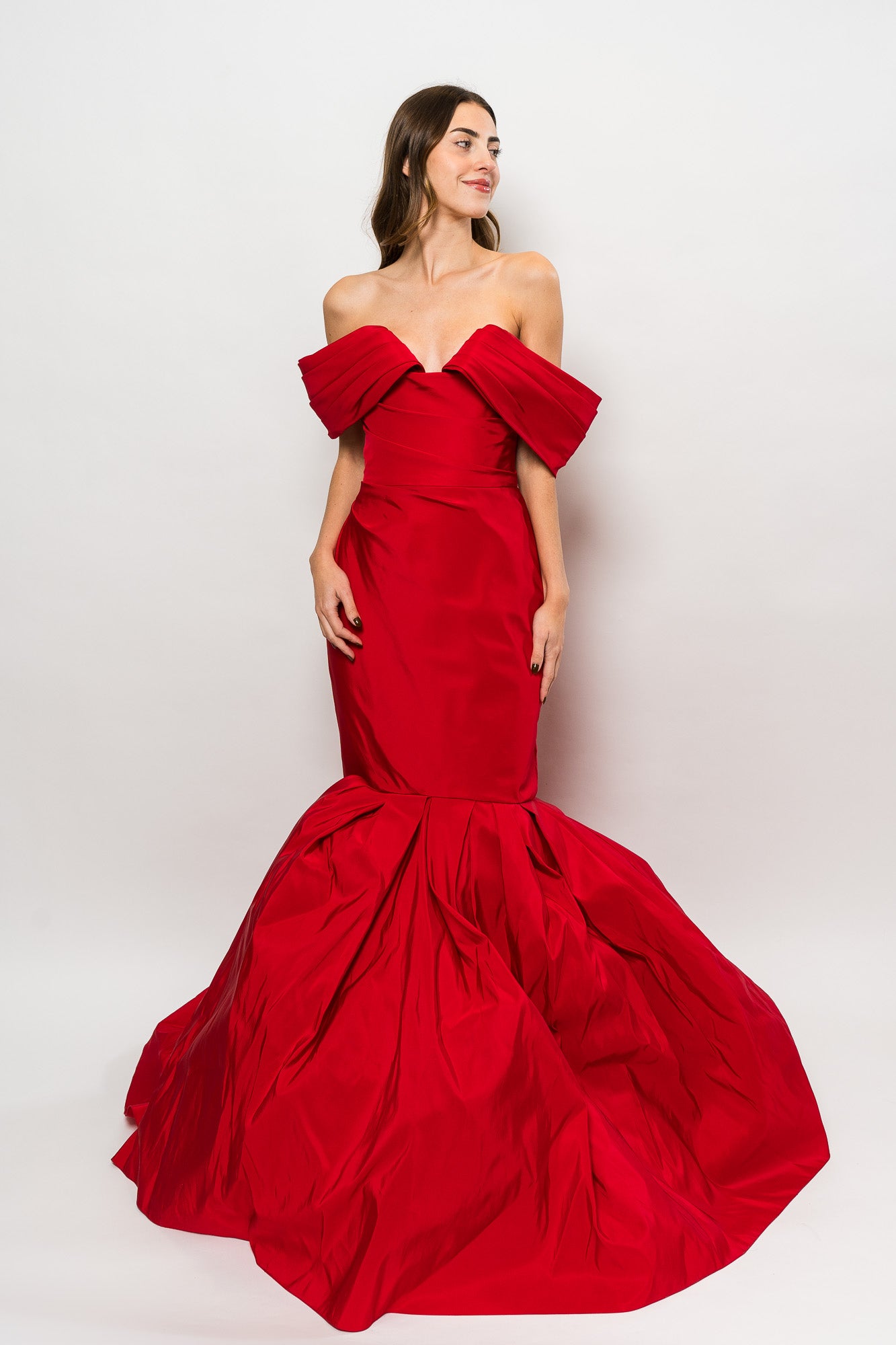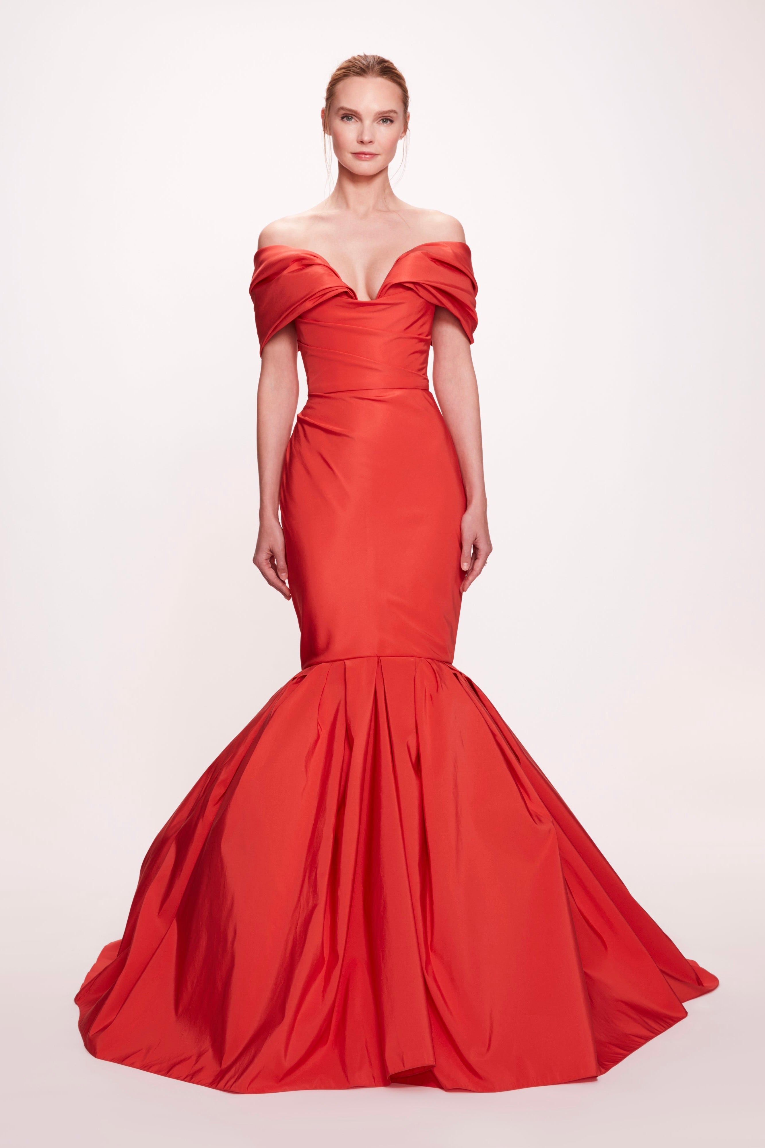Silk Faille Fishtail Gown With Draped Sleeve in Red by Marchesa.