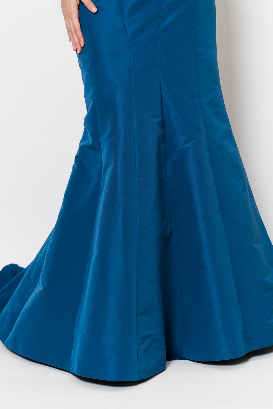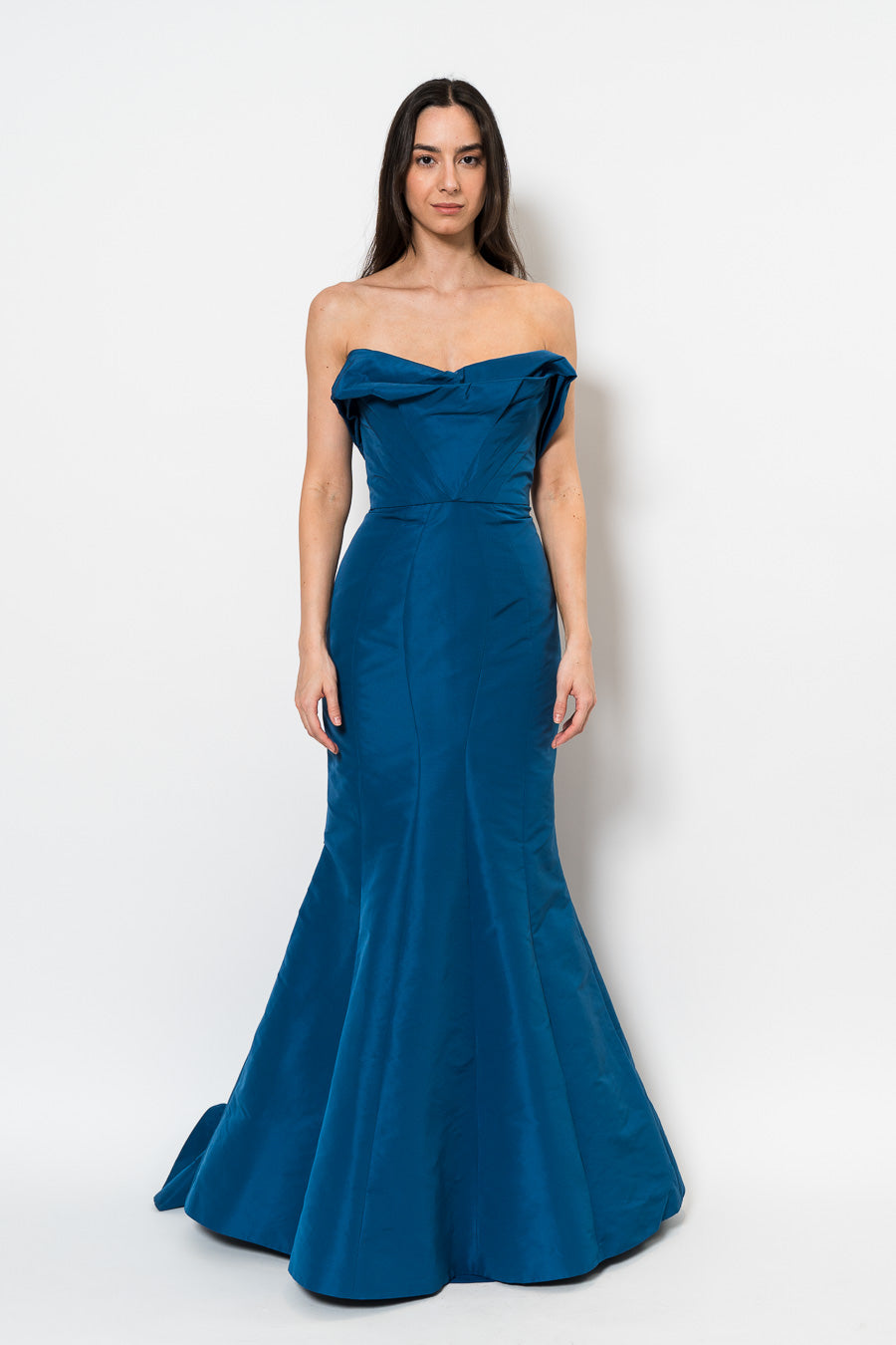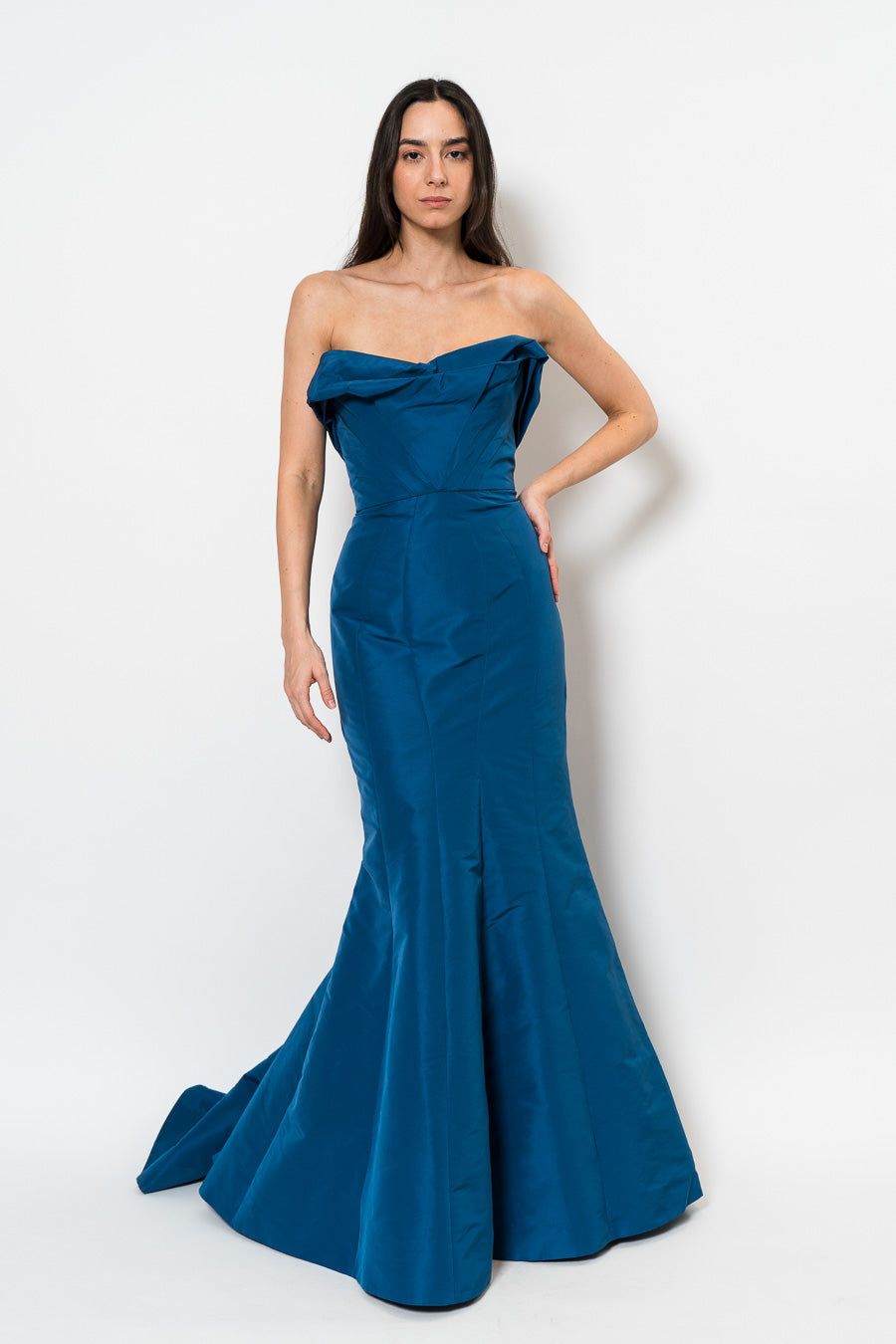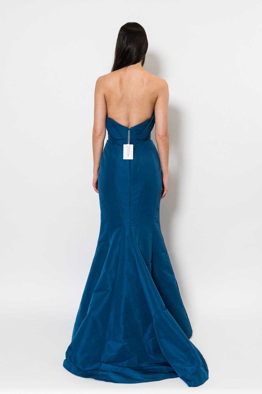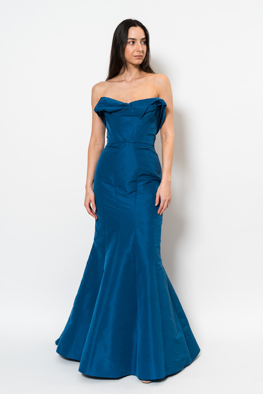 Strapless Faille Fit to Flare Gown with Organic Drape at Neckline in Midnight by Marchesa.
