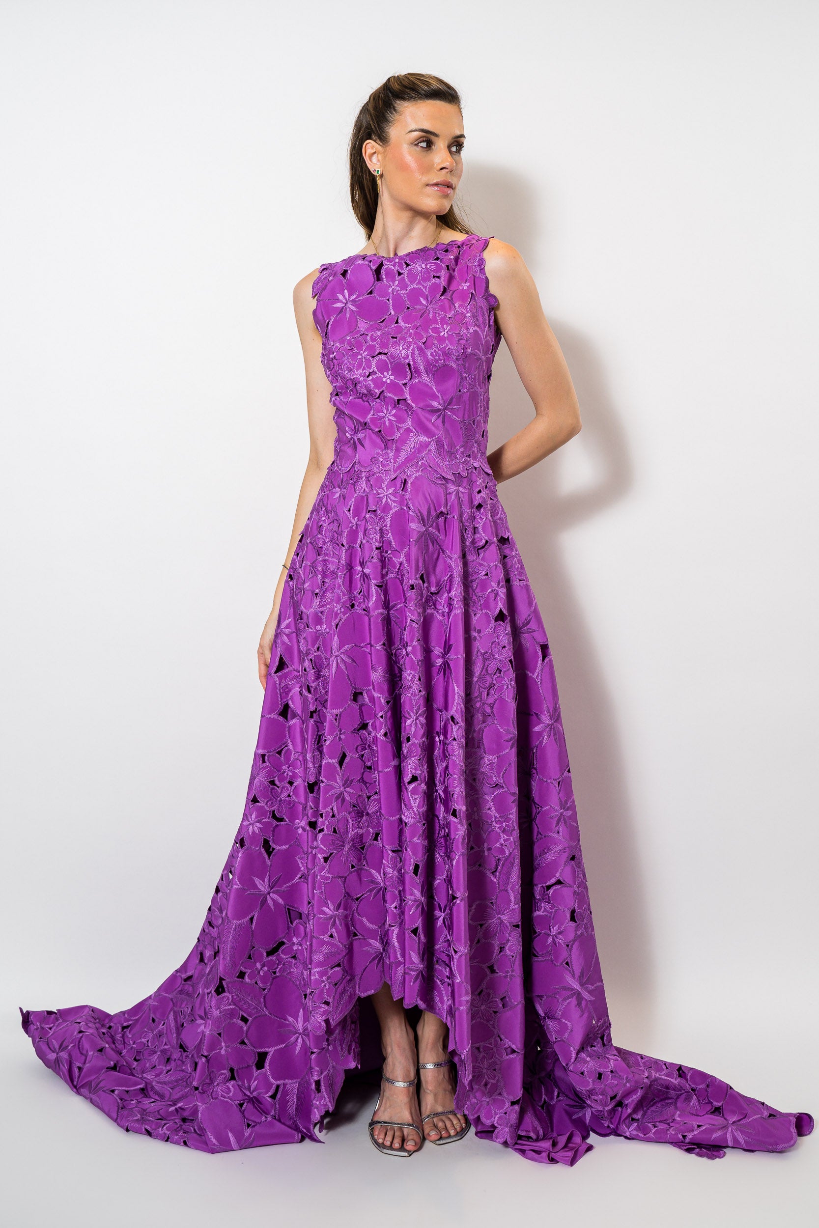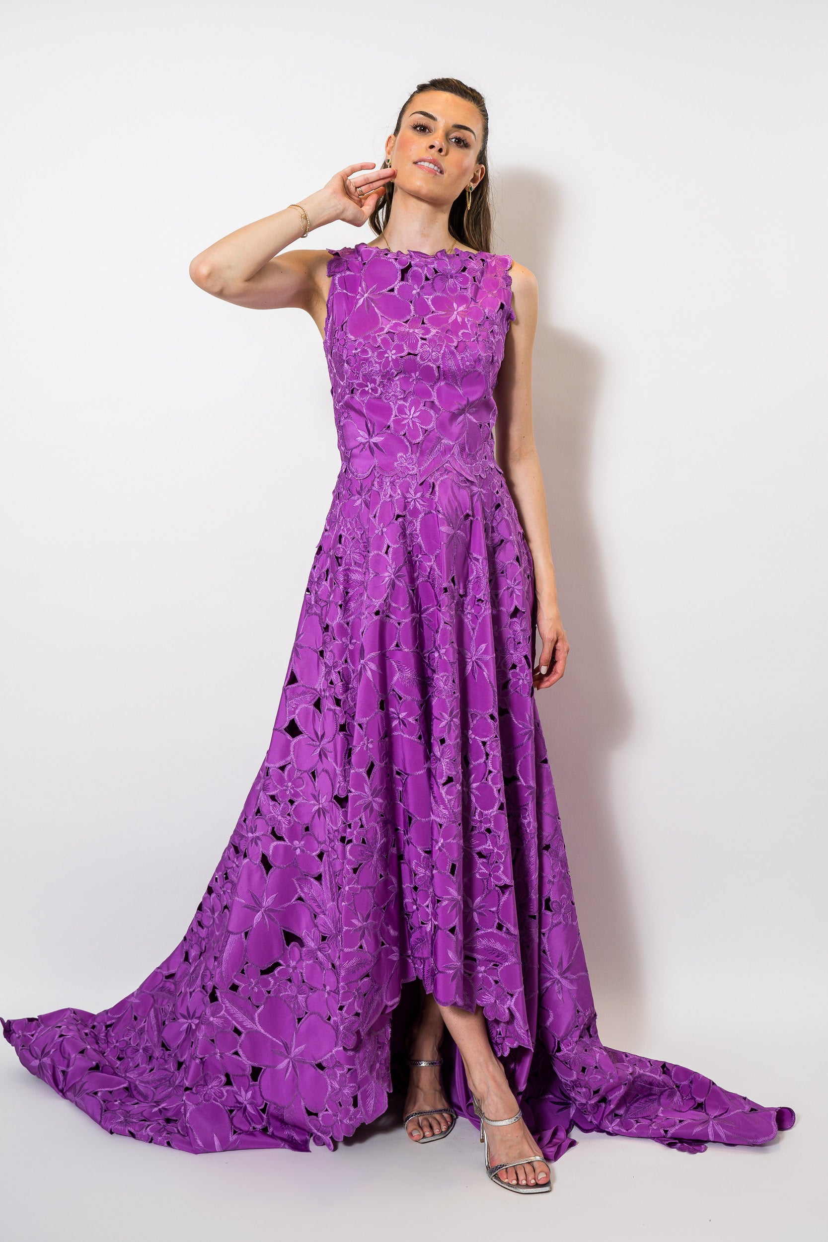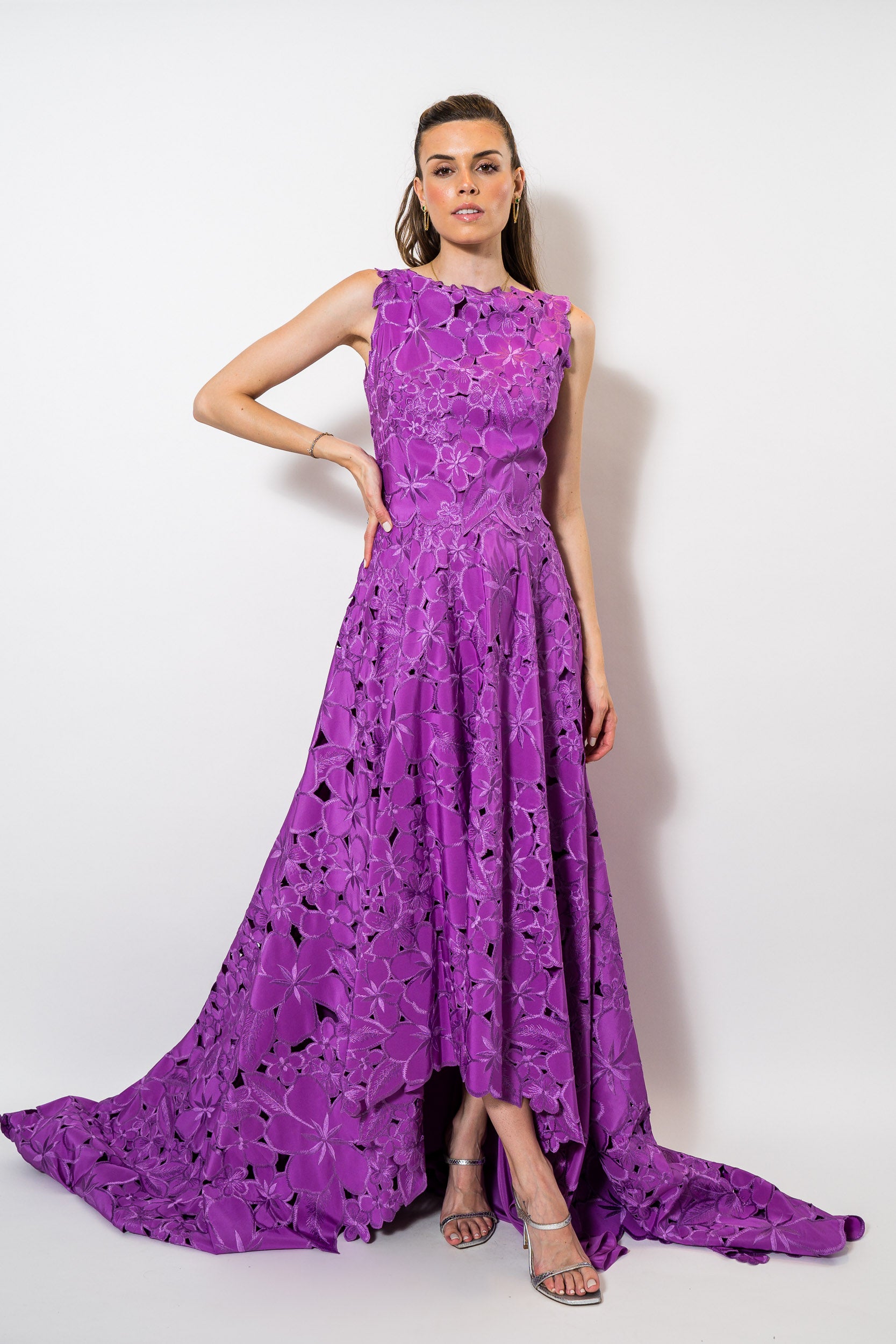 Silk Faille Floral Lasercut Hi-Low Gown in Purple by Naeem Khan.