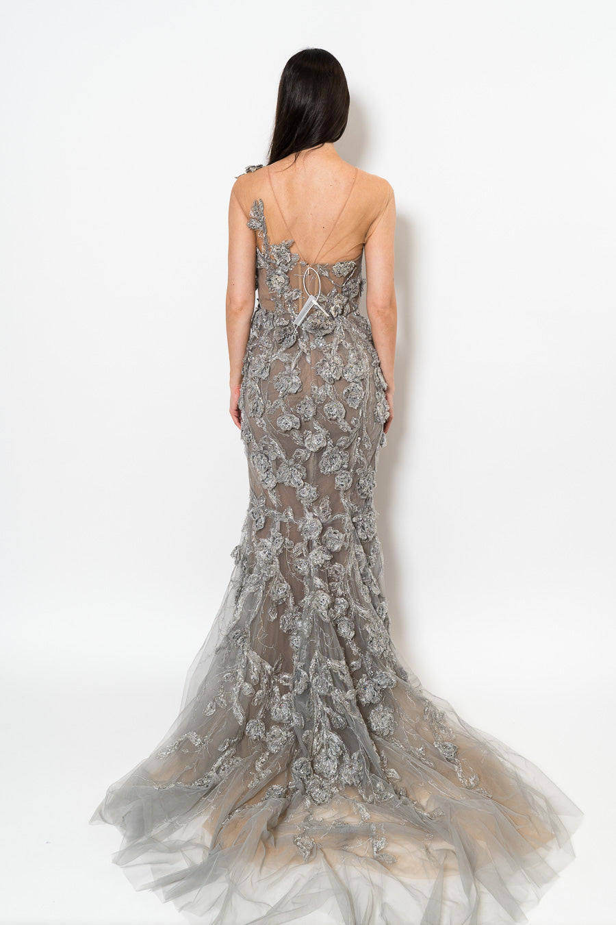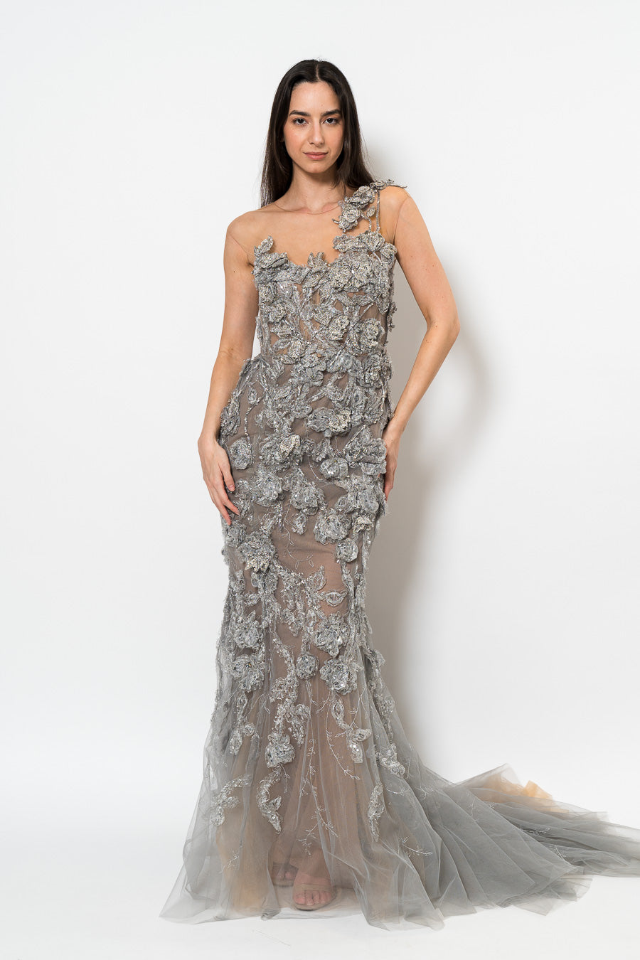 One-shoulder Illusion Tulle Fishtail Gown in Silver by Marchesa.
