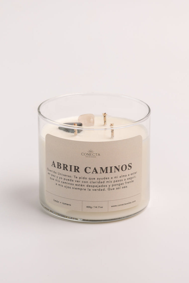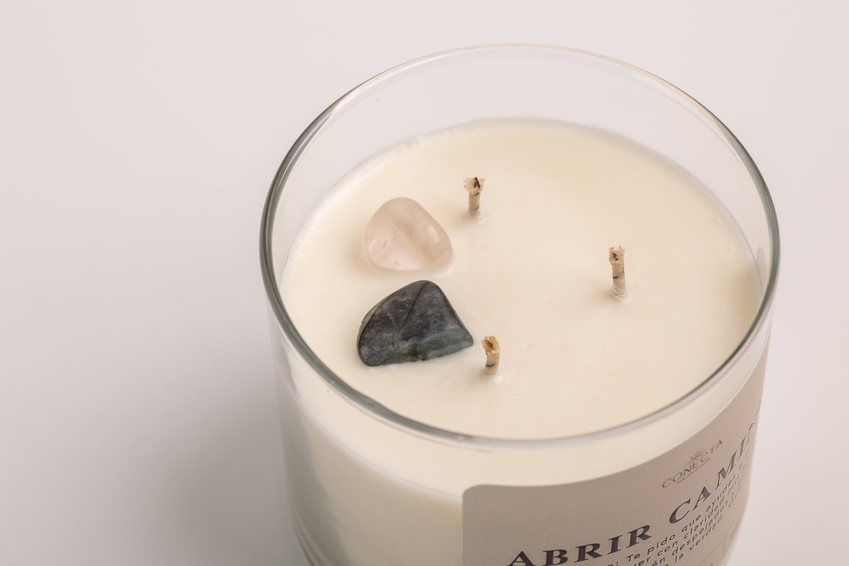 Vela de Cera de Soya Vertida a Mano 400g / 14.11 oz, Piedra Labradorita + Cuarzo Transparente, Conecta Velas.