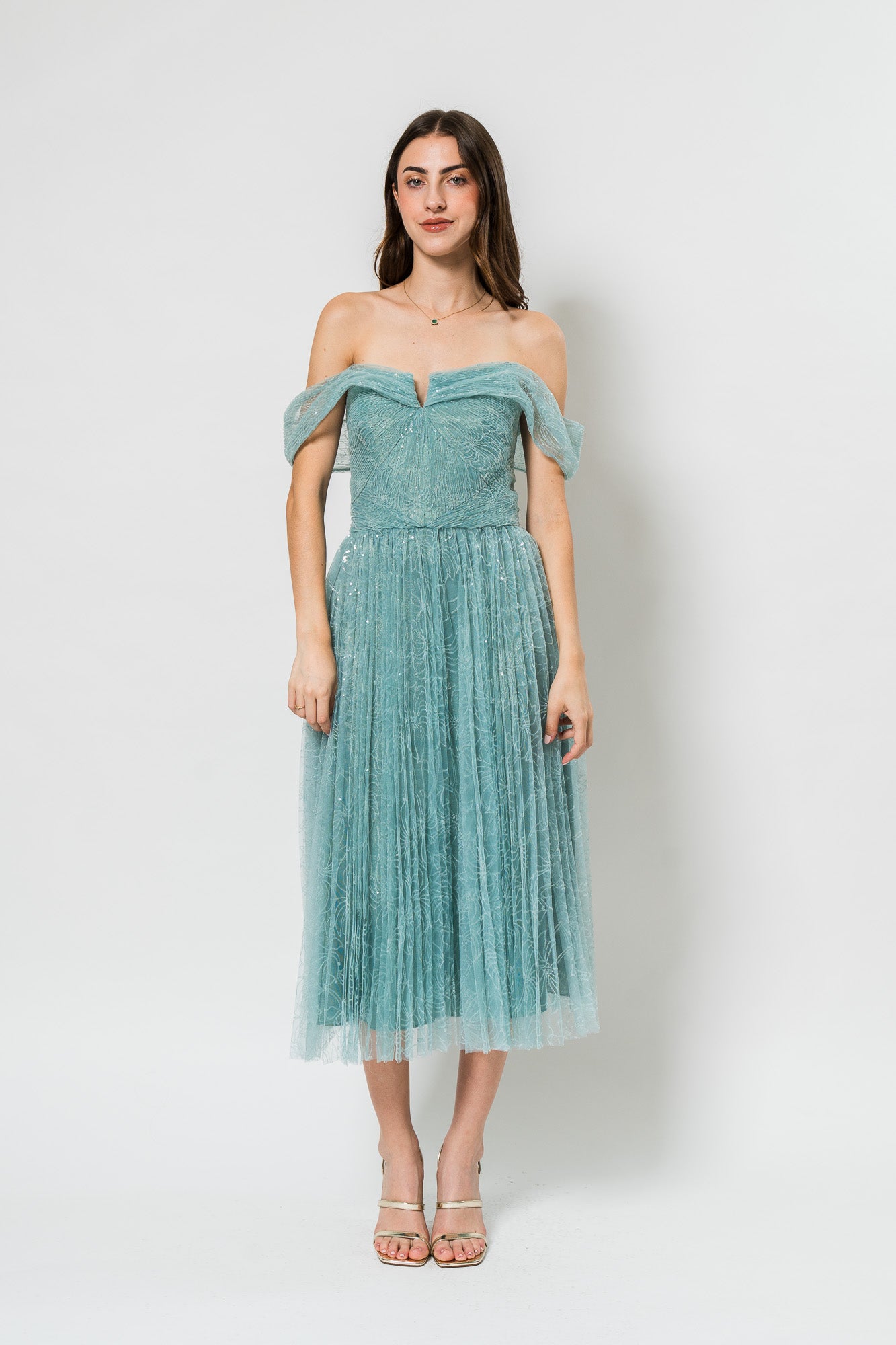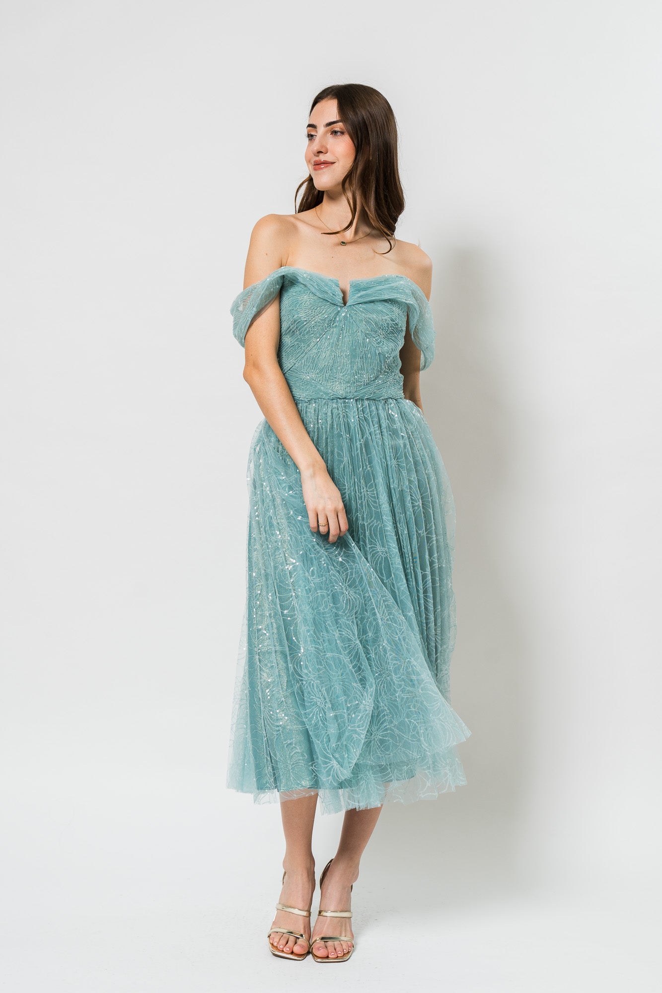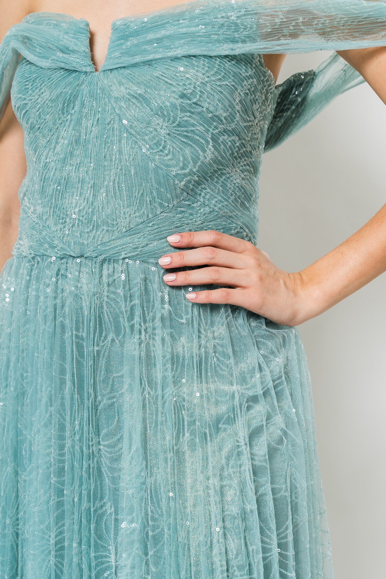 Devin Off Shoulder Dress in Aqua Mist by Theia.