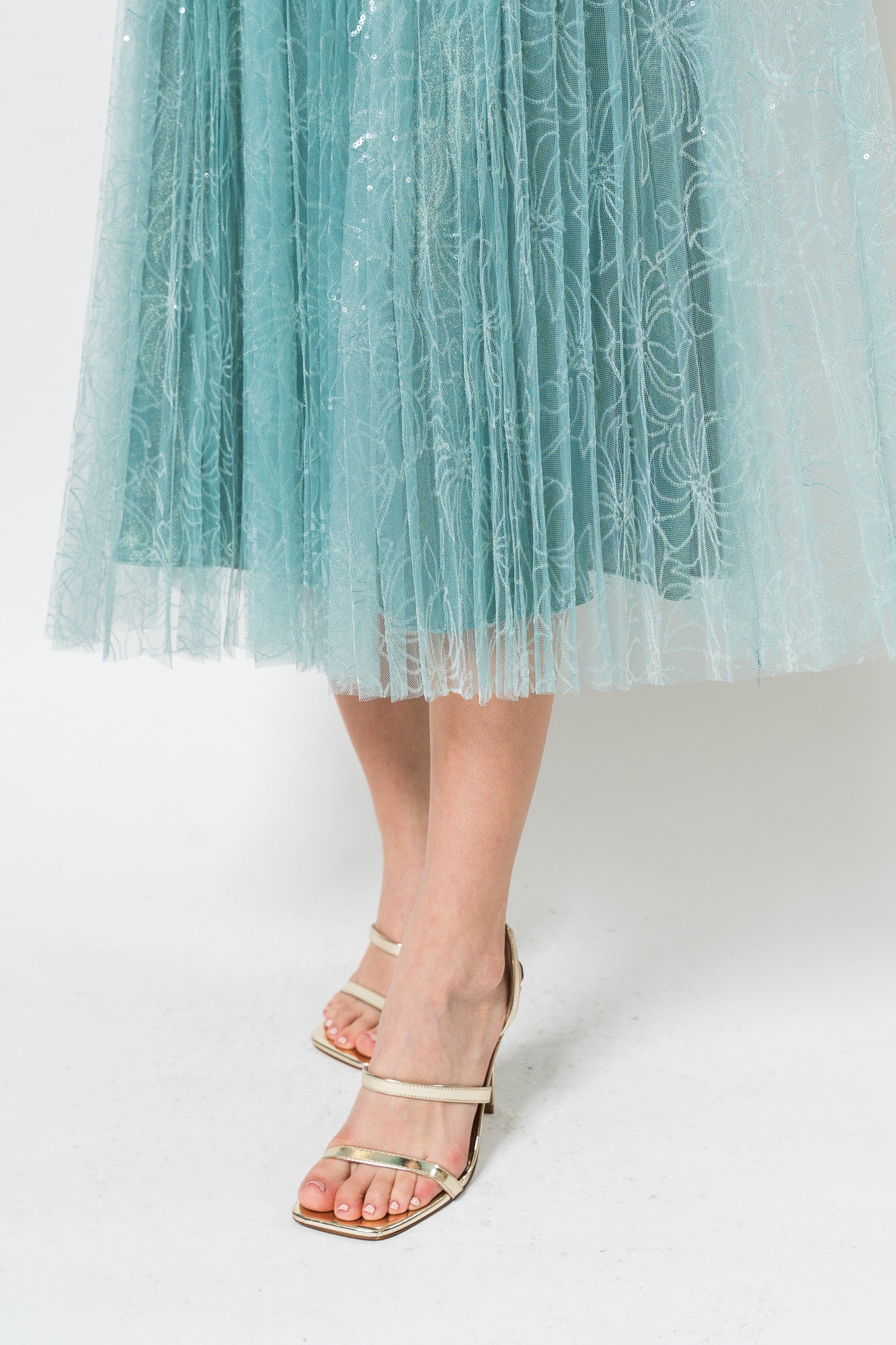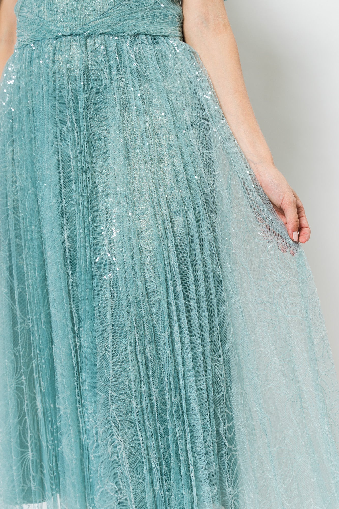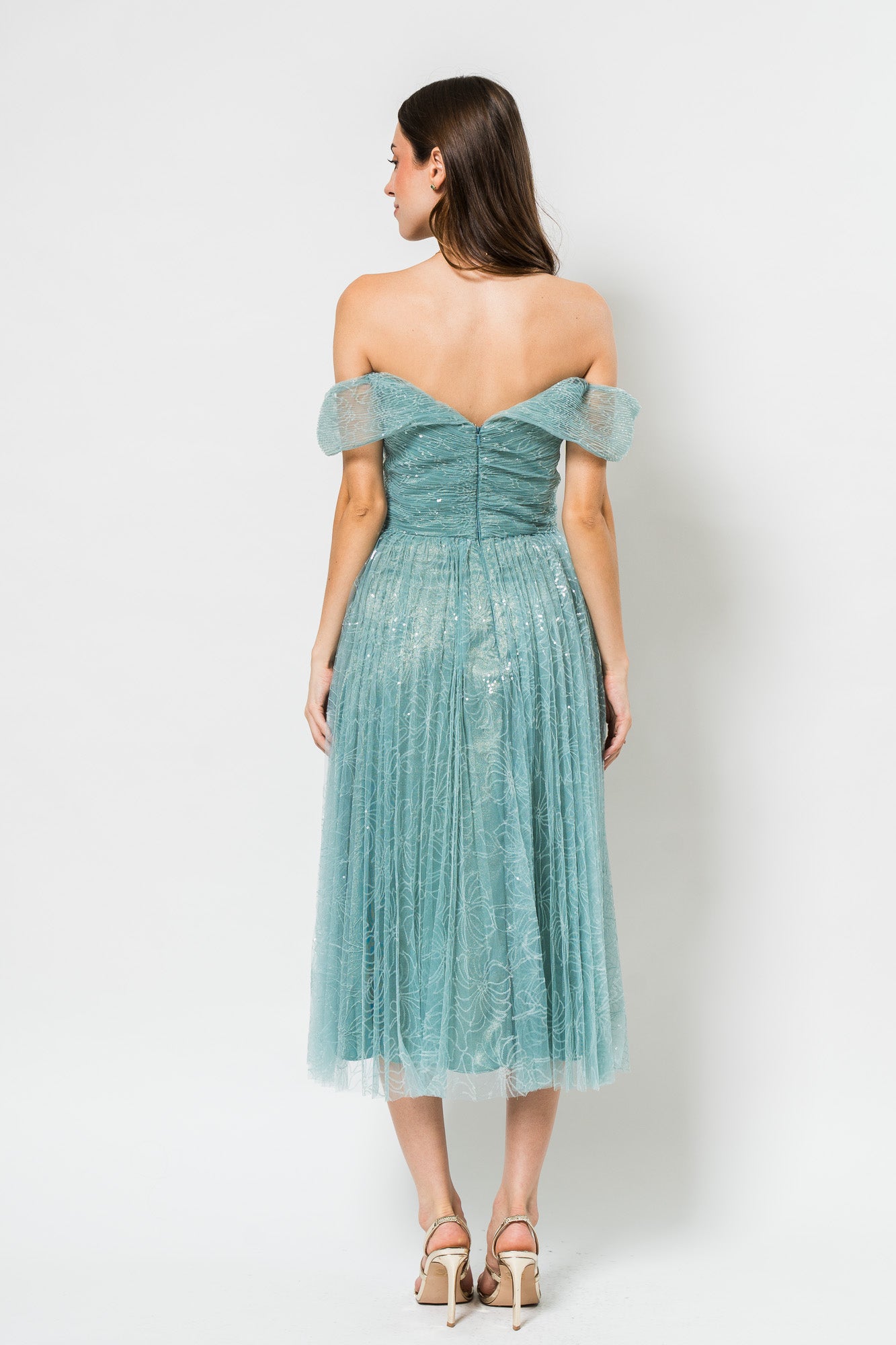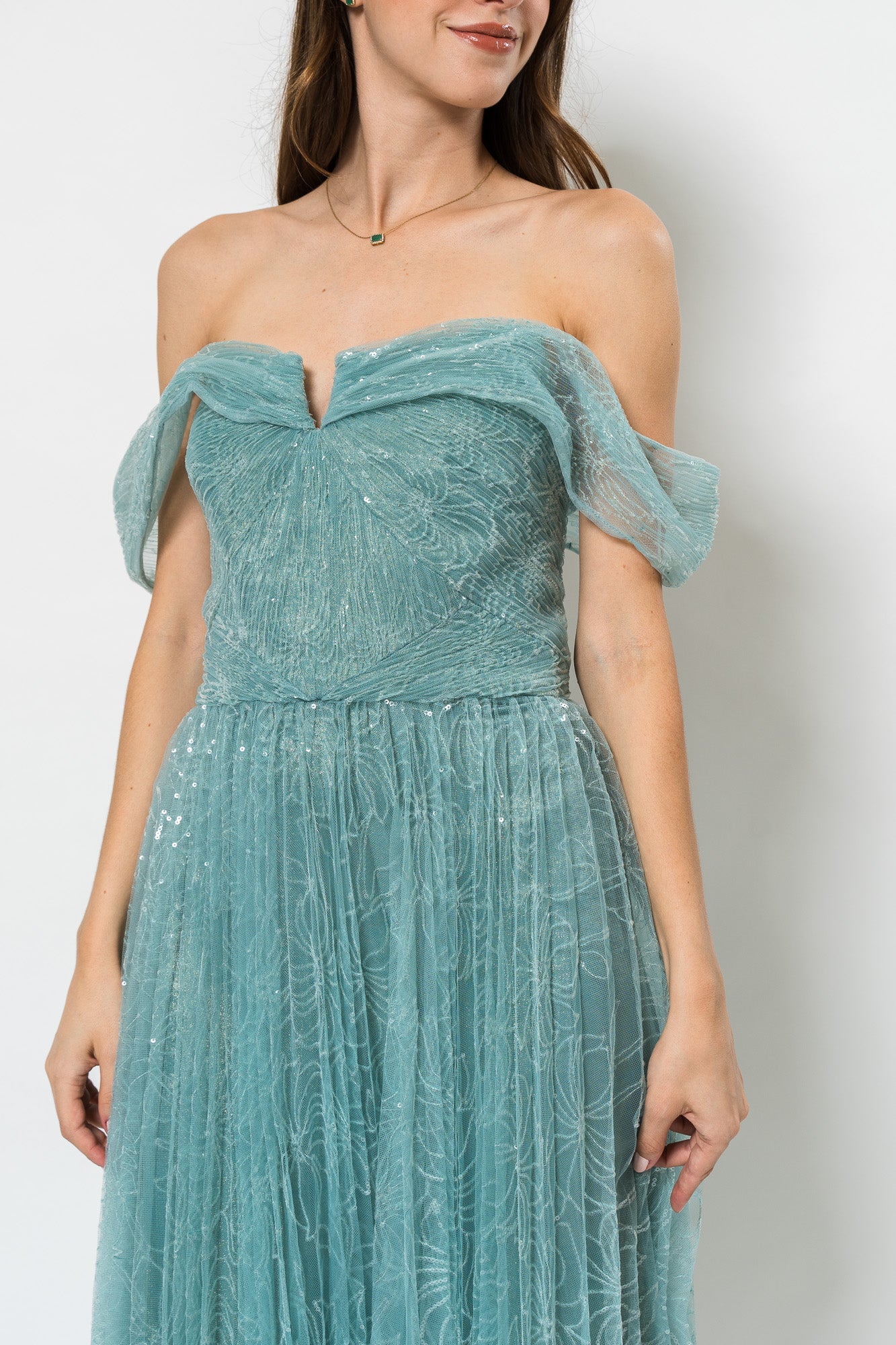 Devin Off Shoulder Dress in Aqua Mist by Theia.