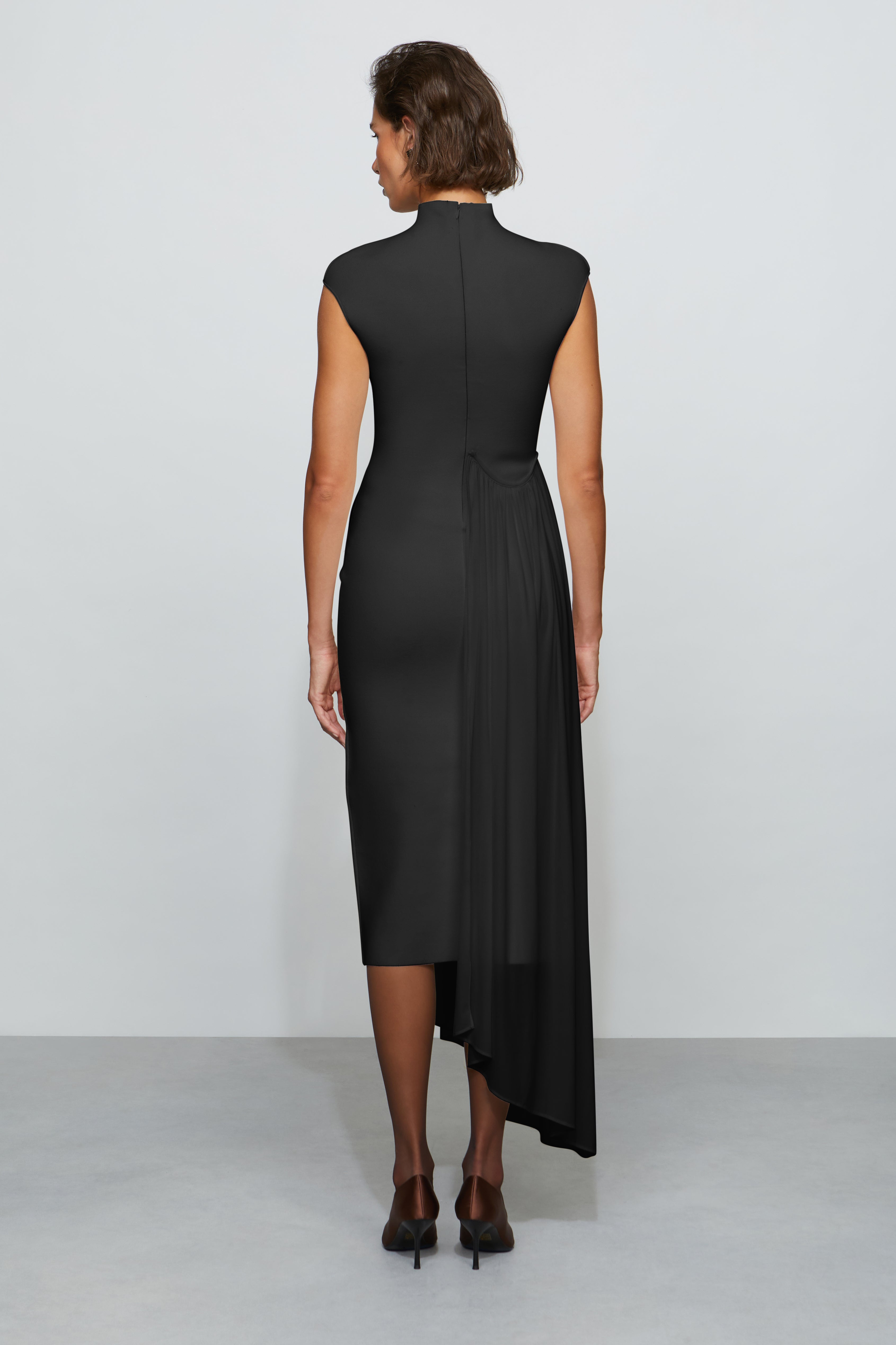 Sleeveless Midi Dress with Asymmetrical Drape in Compact Knit and Lightweight Jersey in Black by Et Ochs.