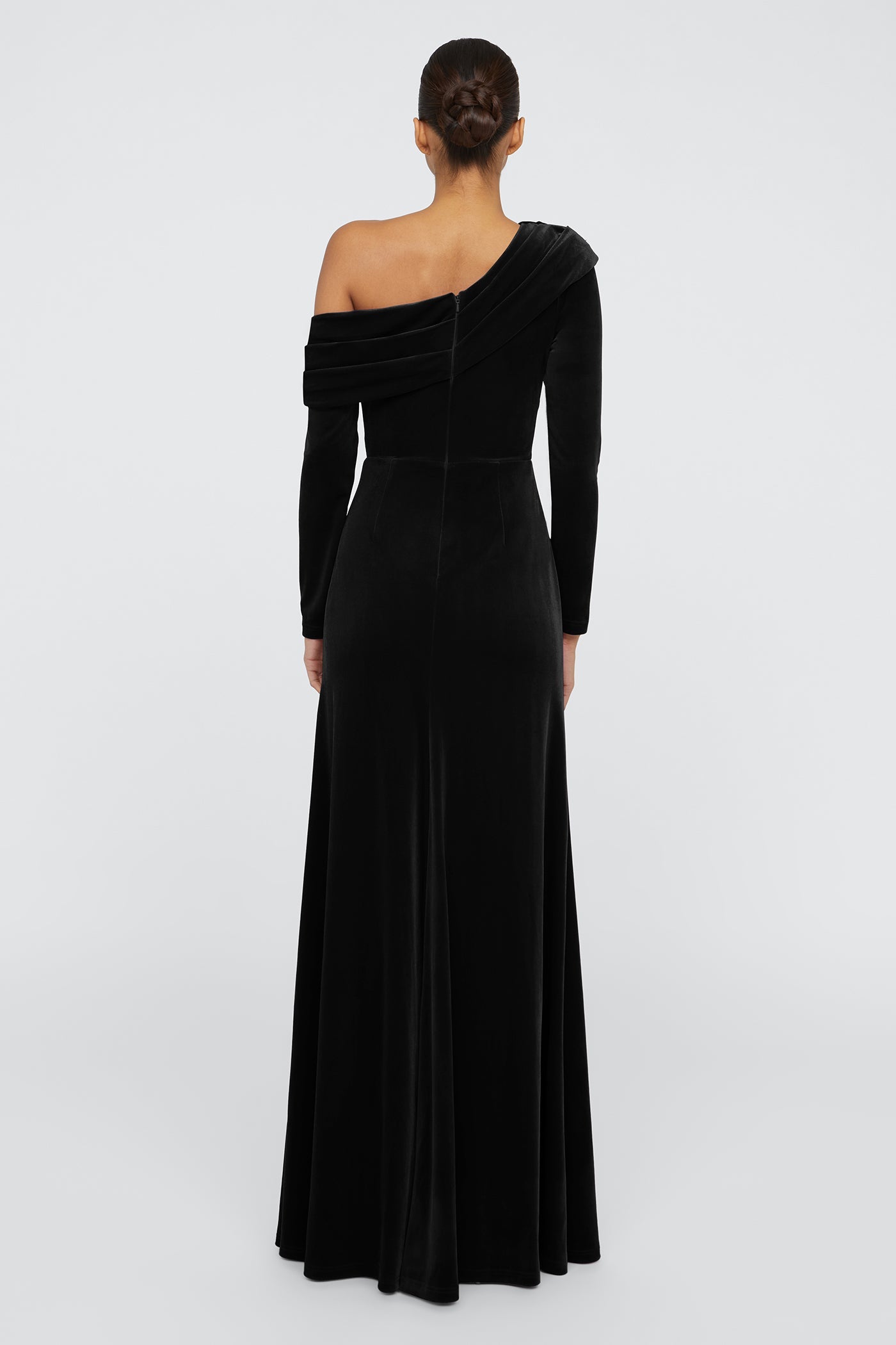 Stretch Velvet One Shoulder Draped Gown With Long Sleeve and Fit and Flare kirt in Black by Theia.
