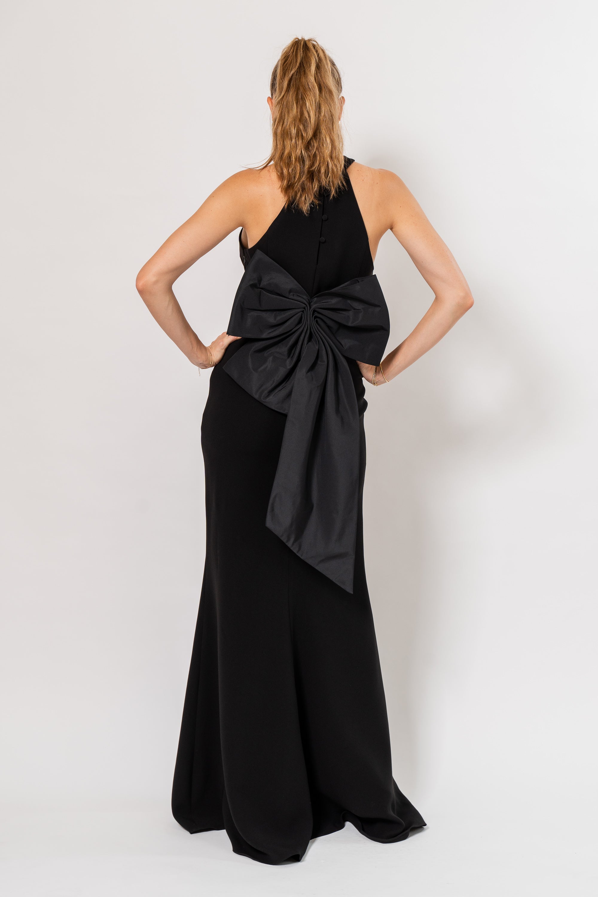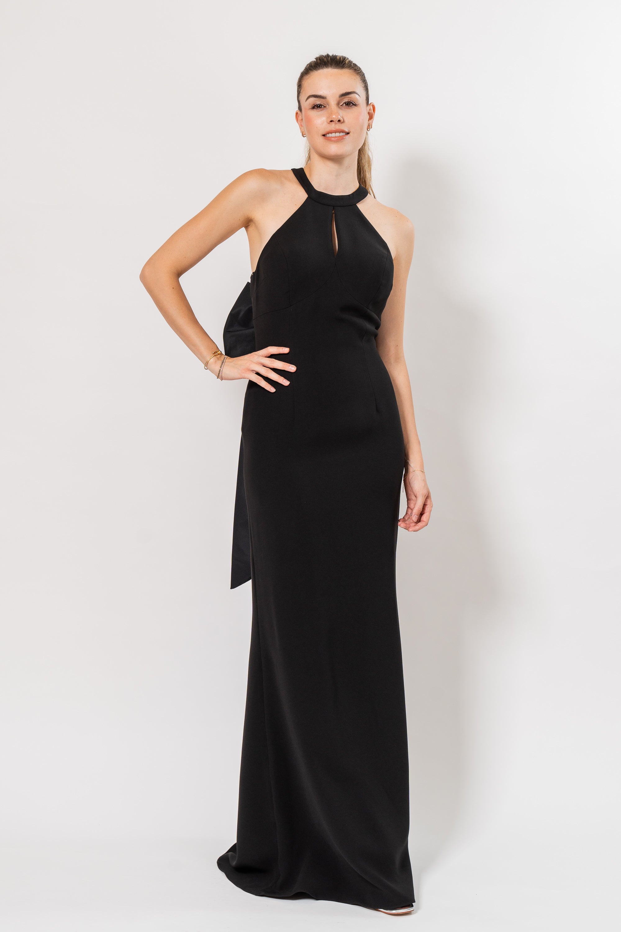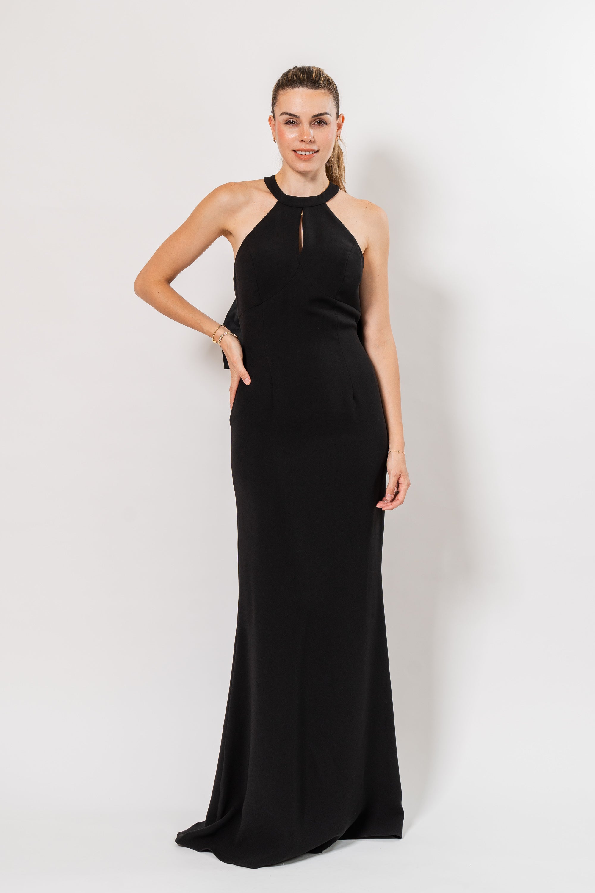 Crepe Taffeta Bow Key Hole Halter Gown in Black in Teri Jon.