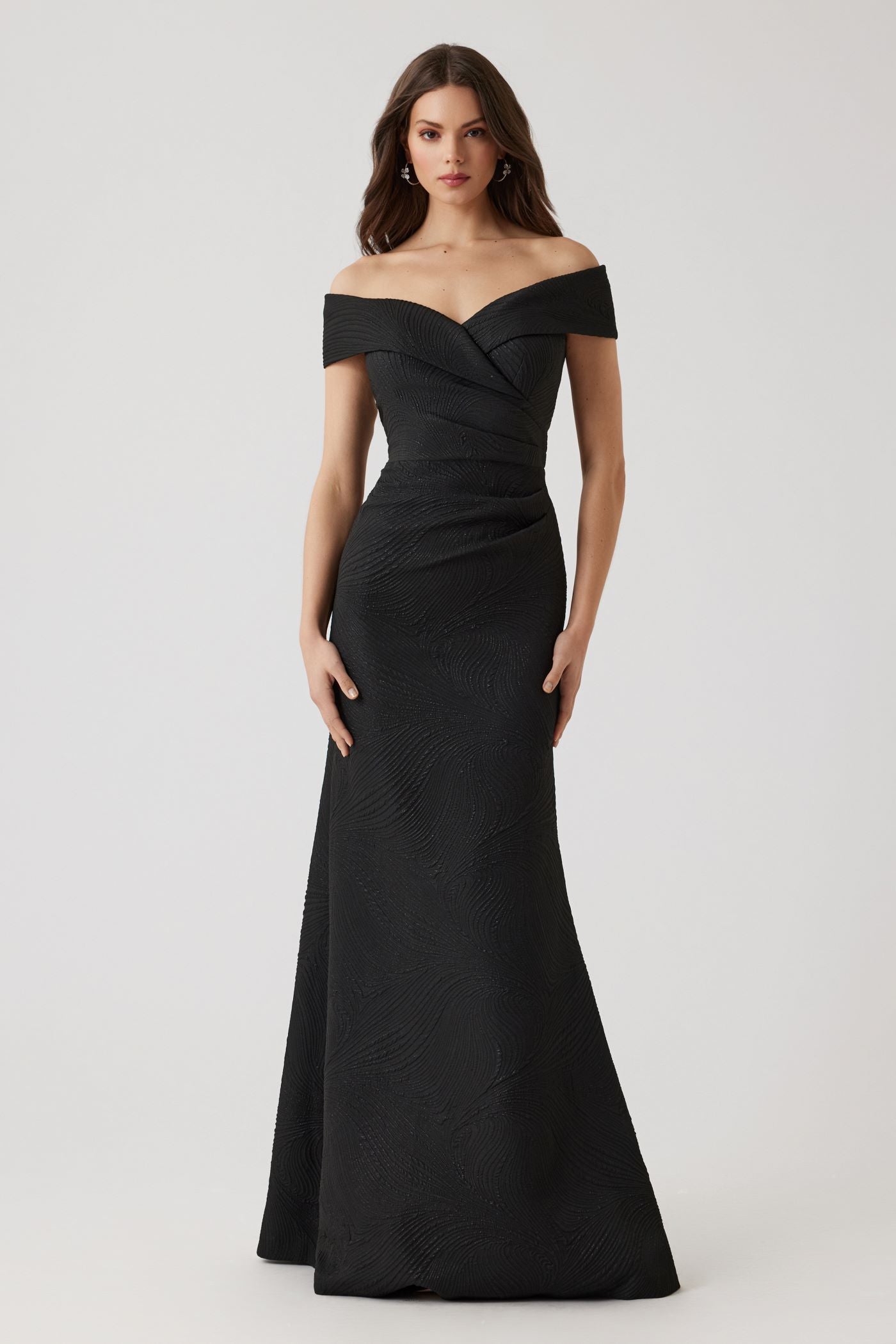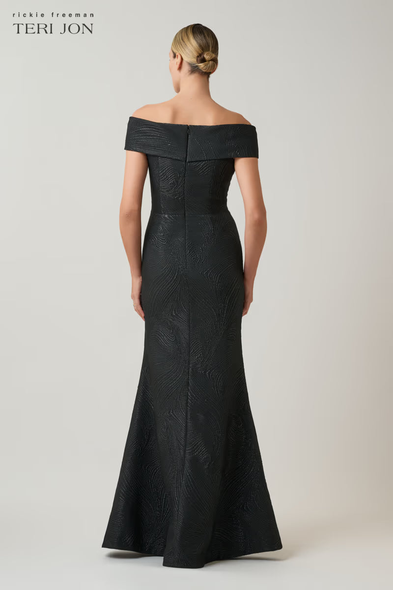 Metallic Jacquard Wavy Pattern Portrait Gown in Black by Teri Jon.