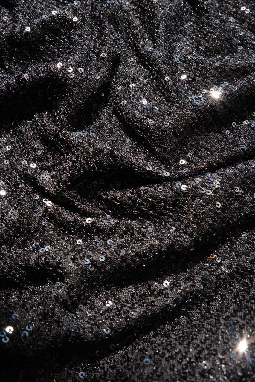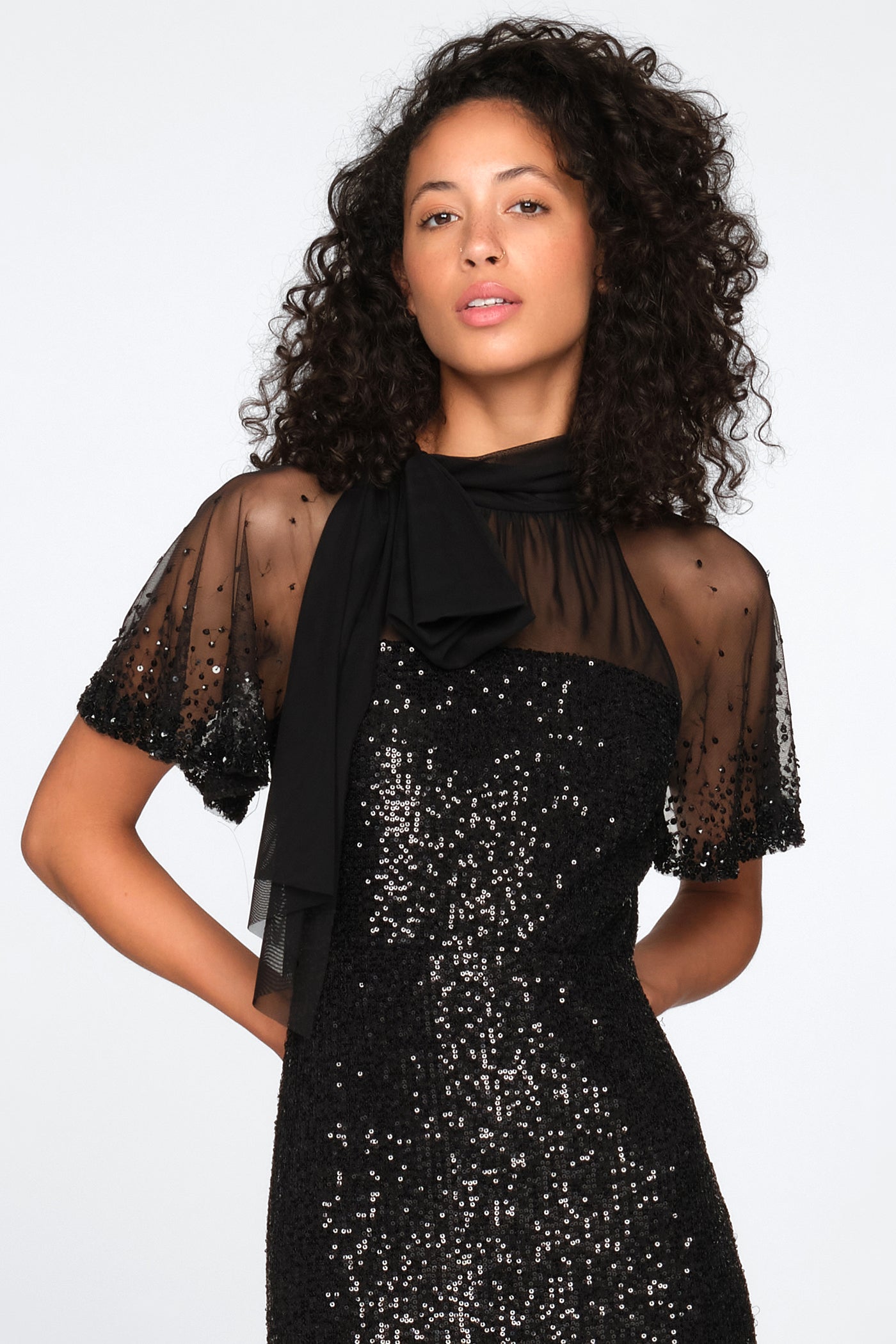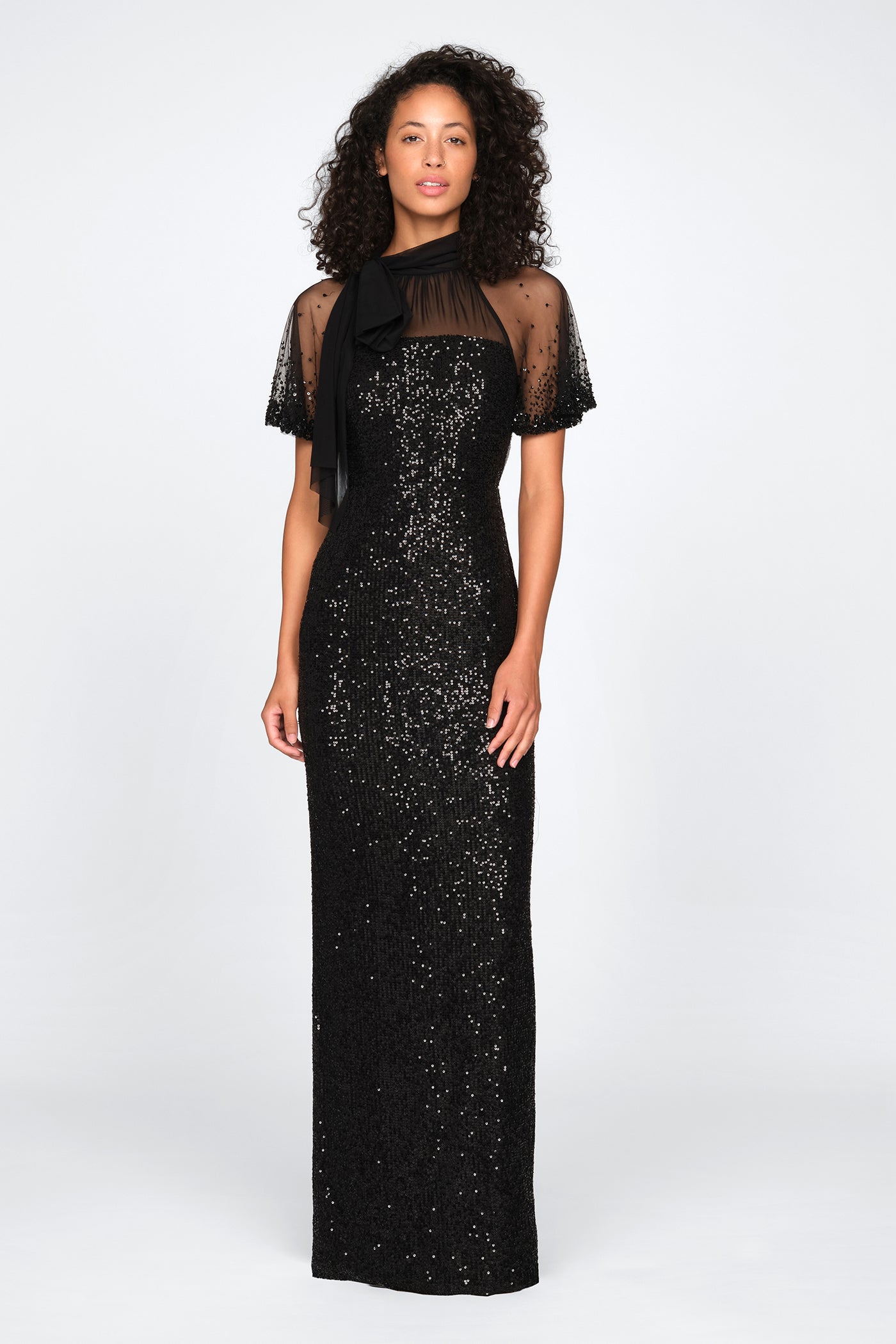 Stretch Sequin Gown With Bow Neck Tie Detail and Flutter Sleeves in Black by Theia