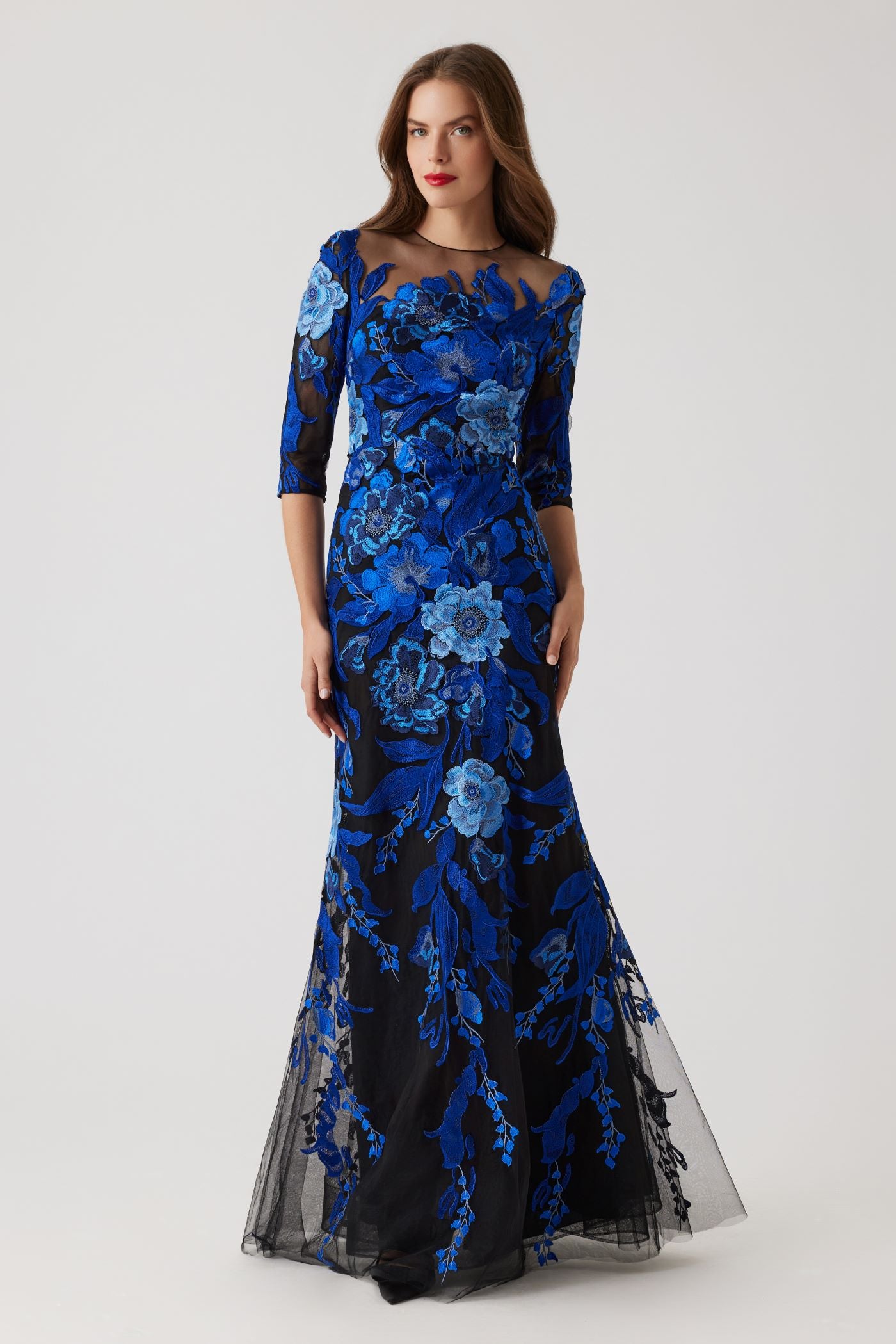 Floral Embroidered Tulle Gown in Blue Multi by Teri Jon.