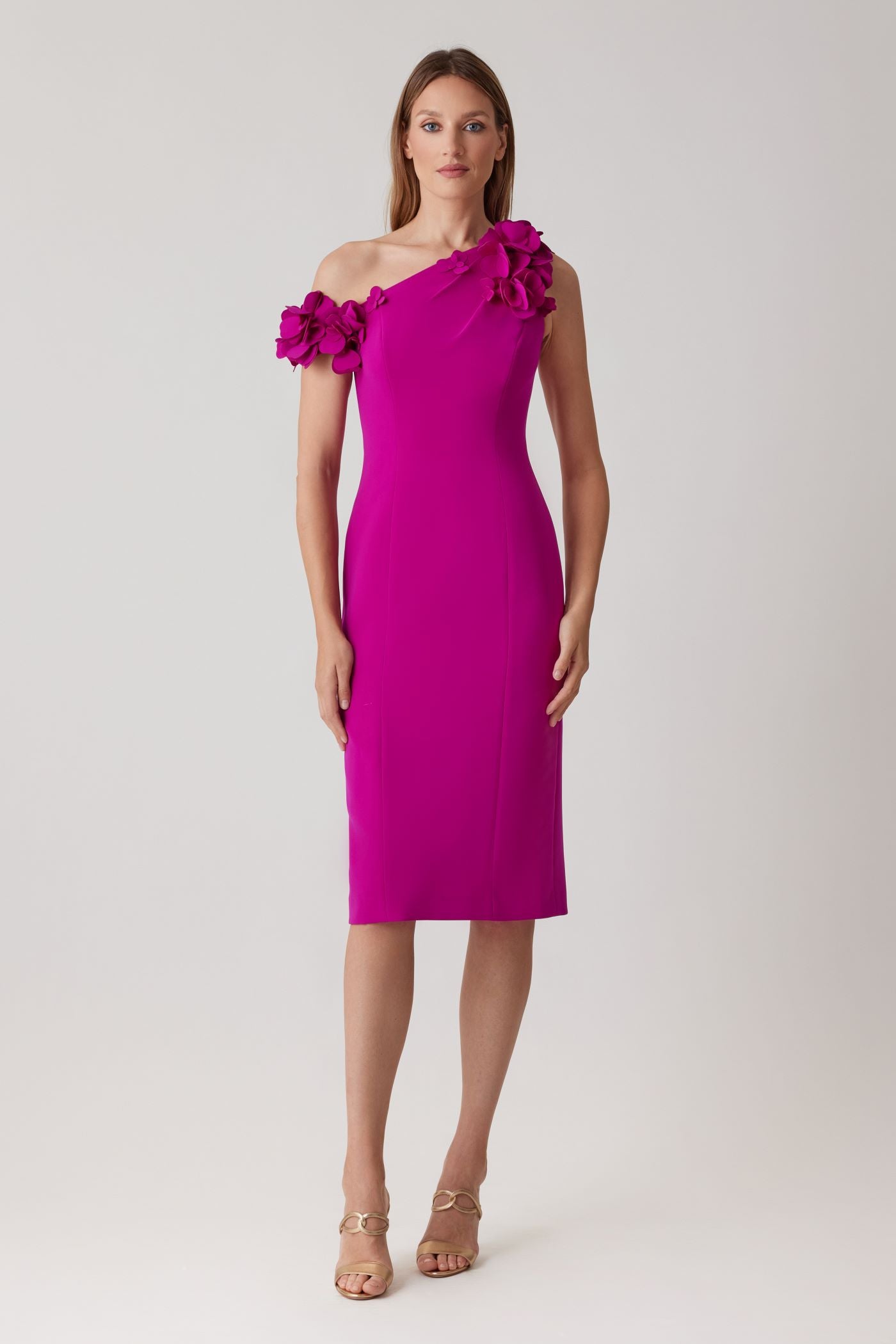 Stretch Crepe 3D Flower Asymmetrical Shoulder in Cerise by Teri Jon.