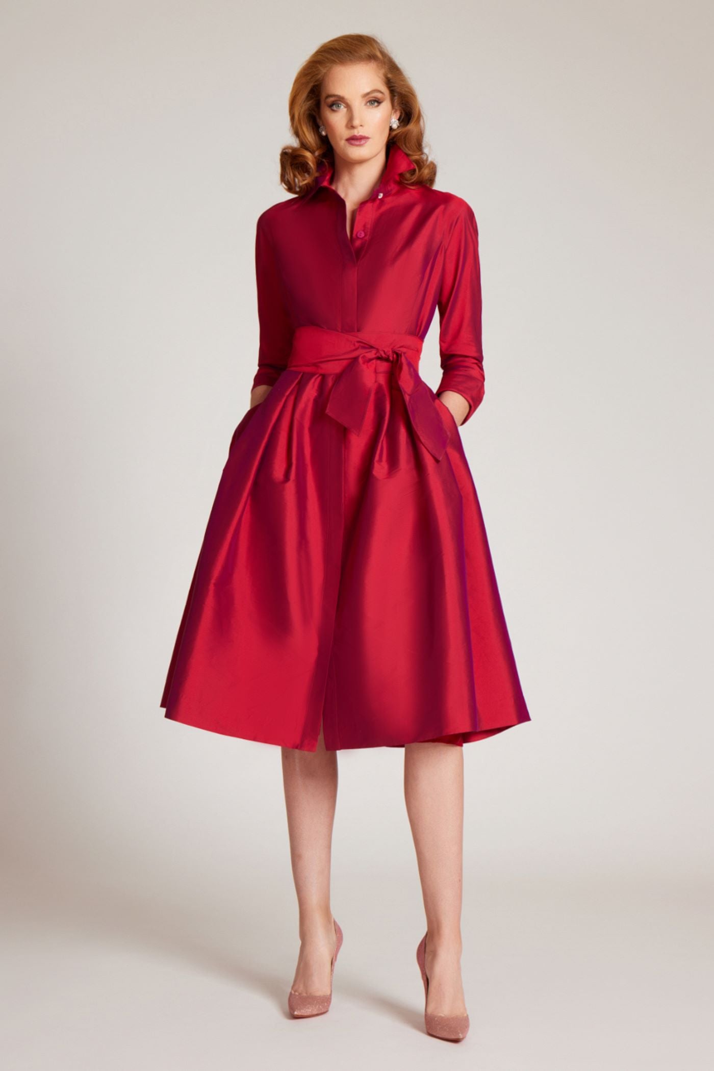 3/4 Sleeve Belted Taffeta Shirt Drees in Cherry Violet by Teri Jon.