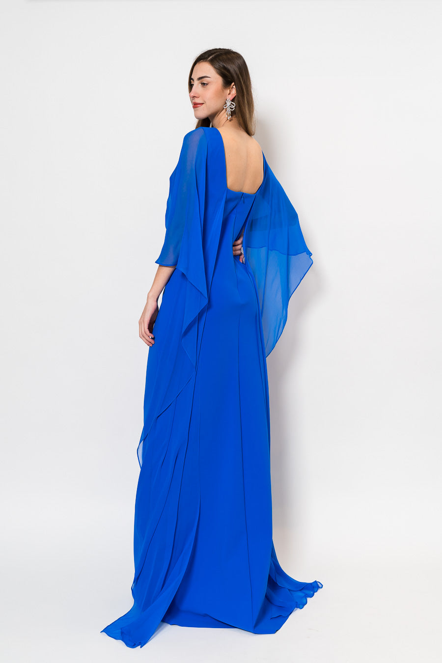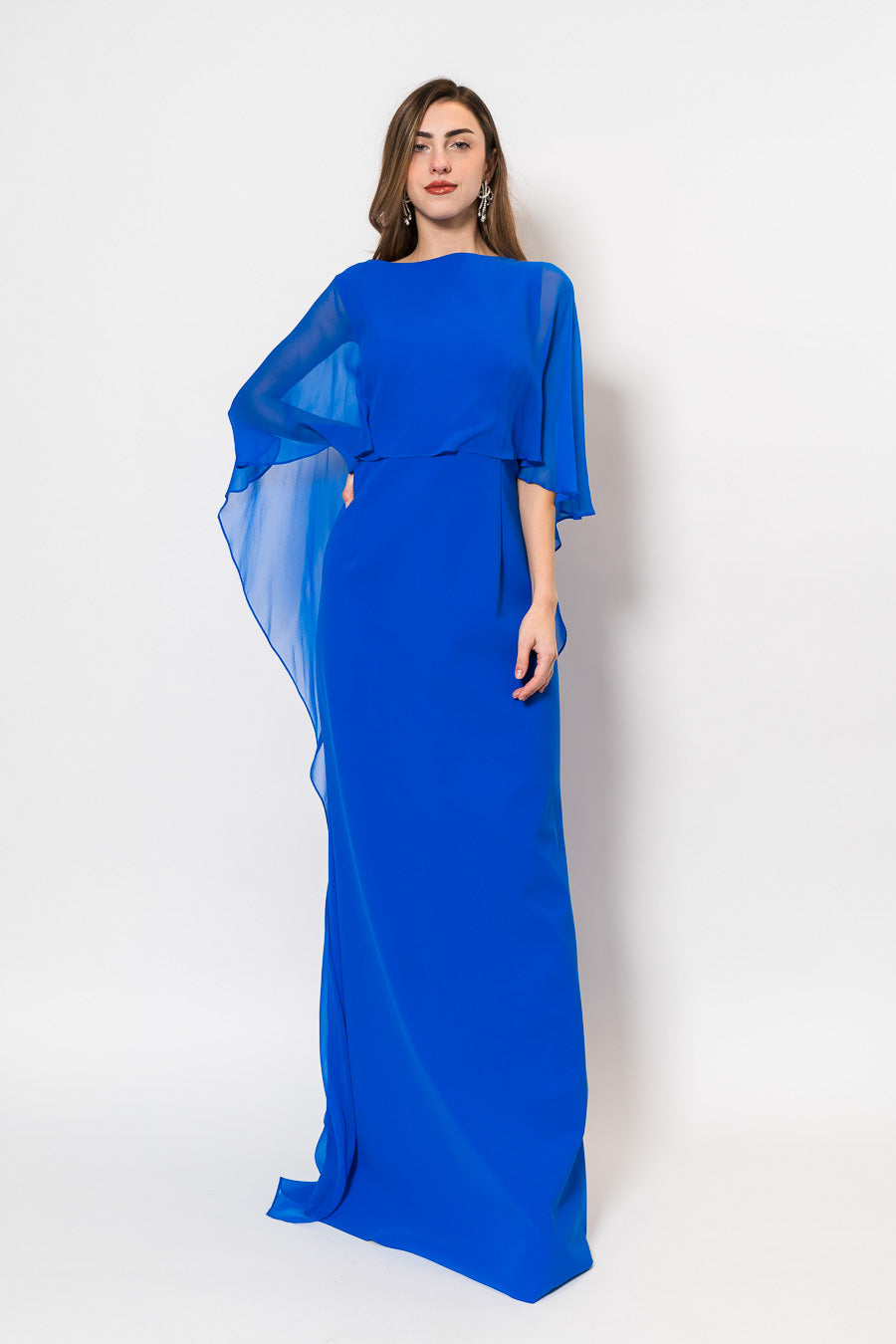 Scuba Gown With Chiffon Cape in Cobalt by Teri Jon.
