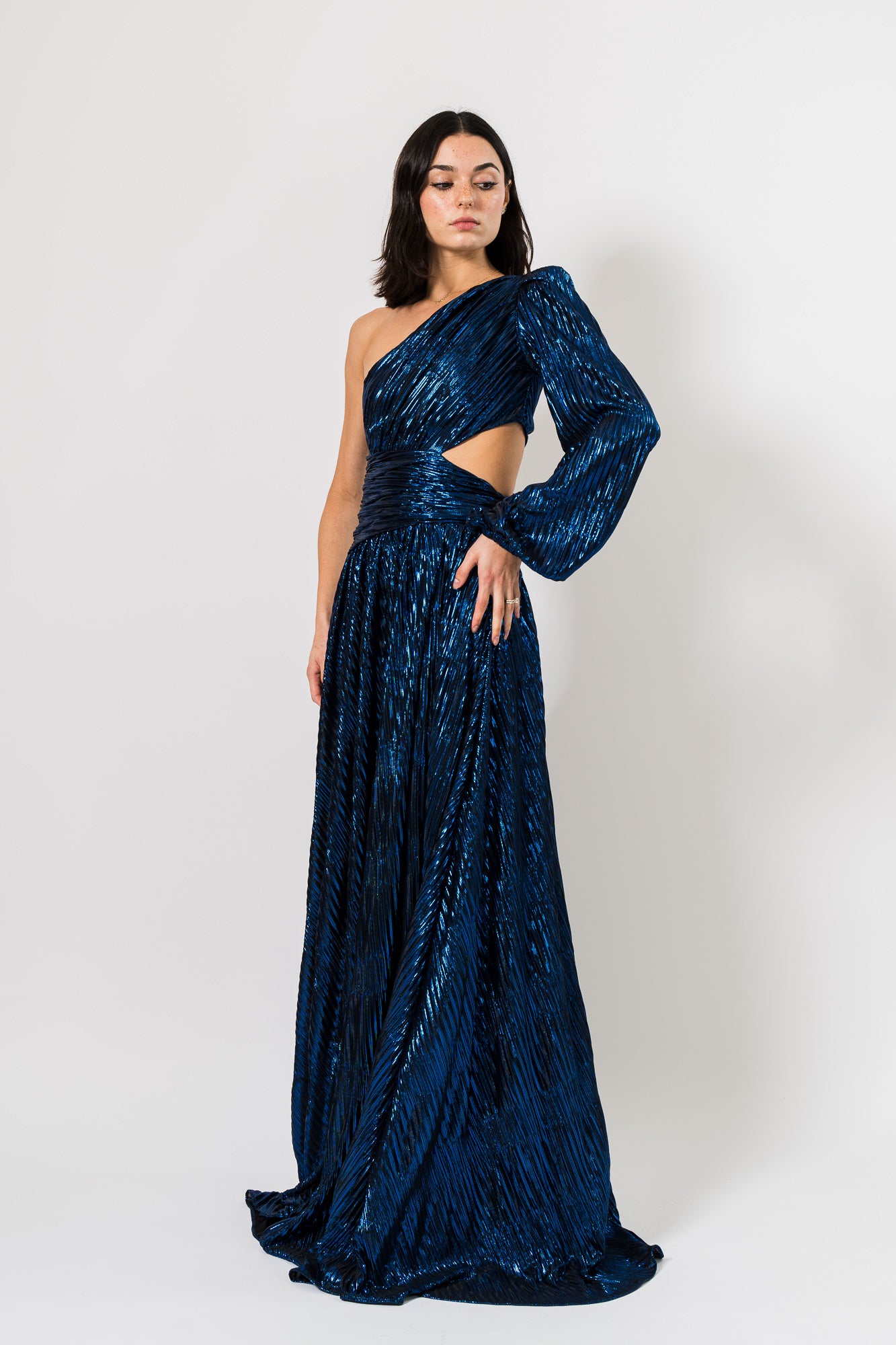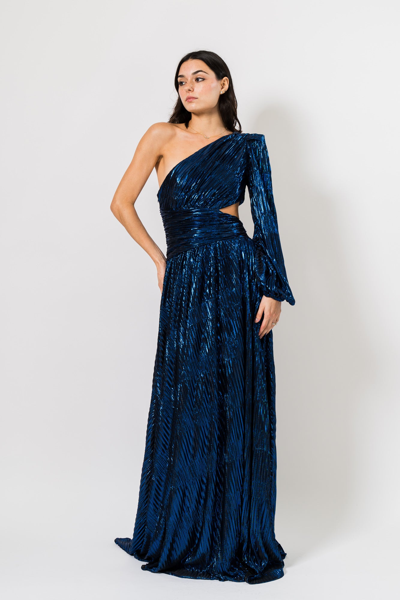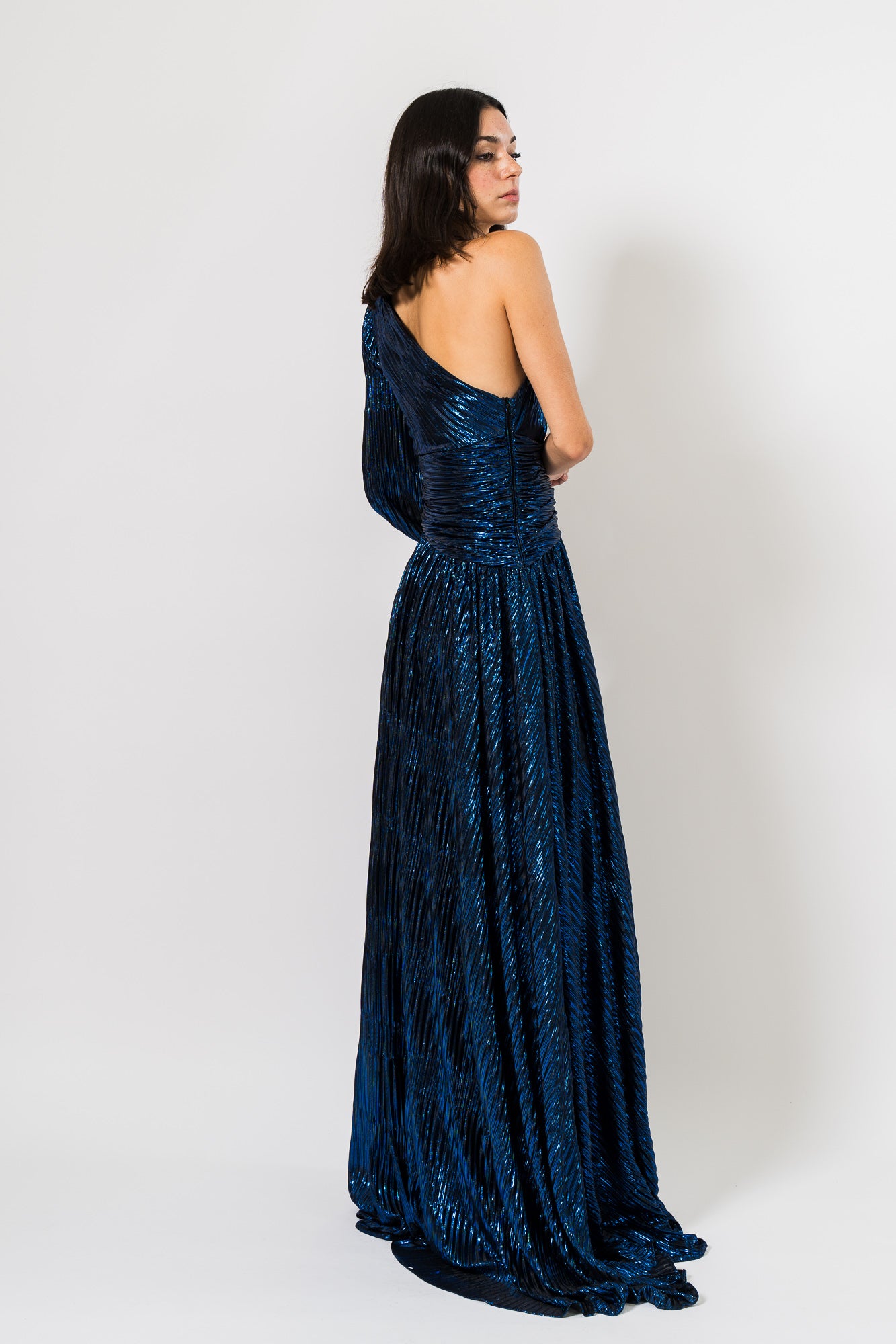 Metallic Plisse One Shoulder Gown in Dark Blue by Patbo.