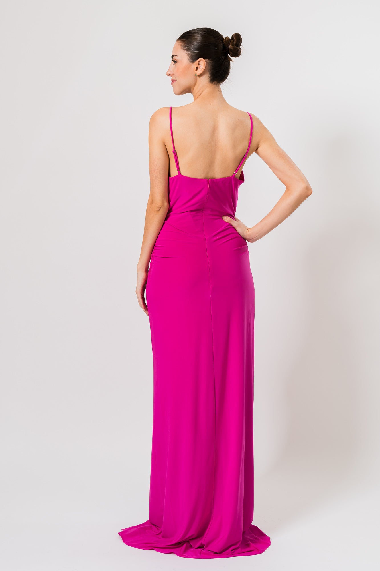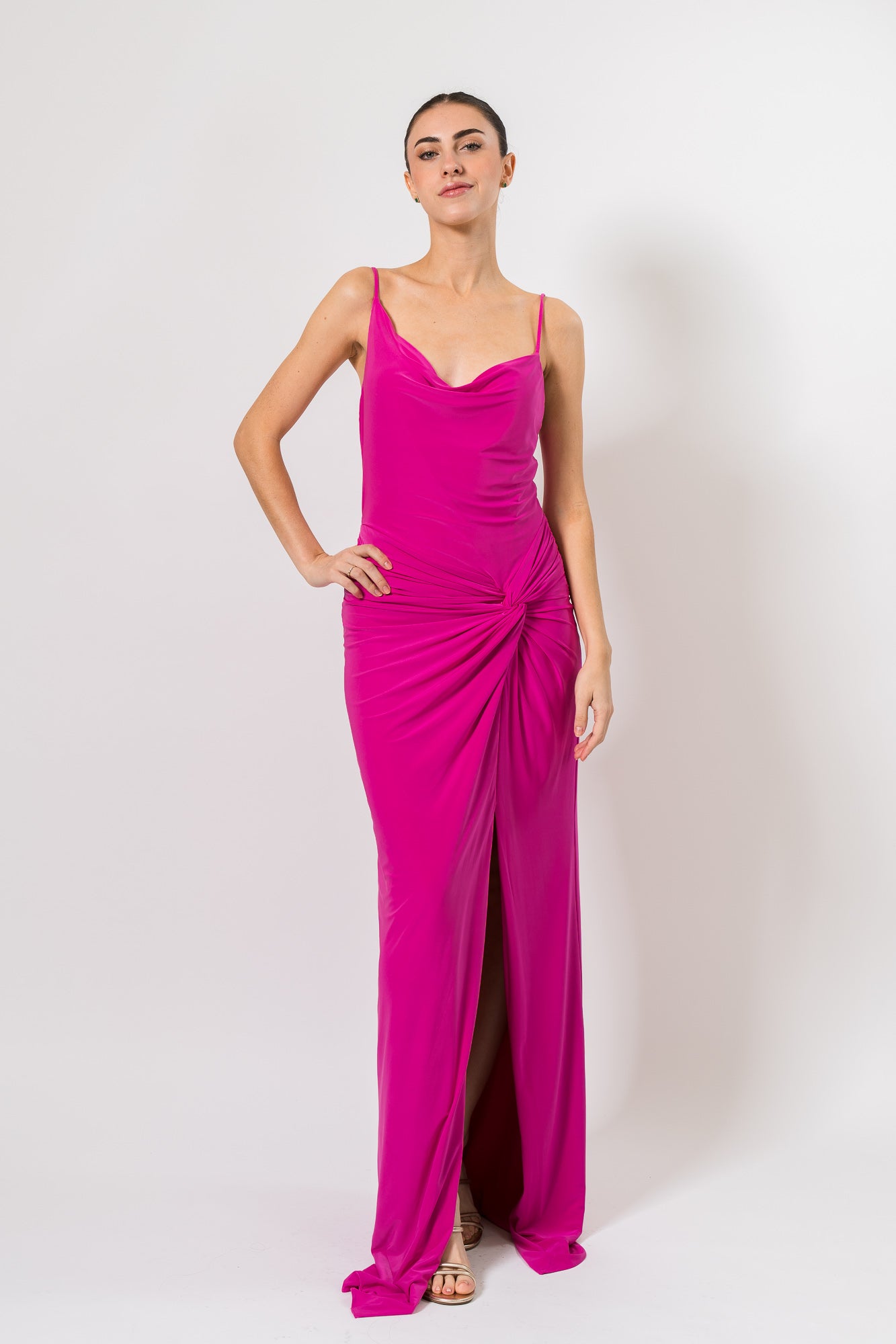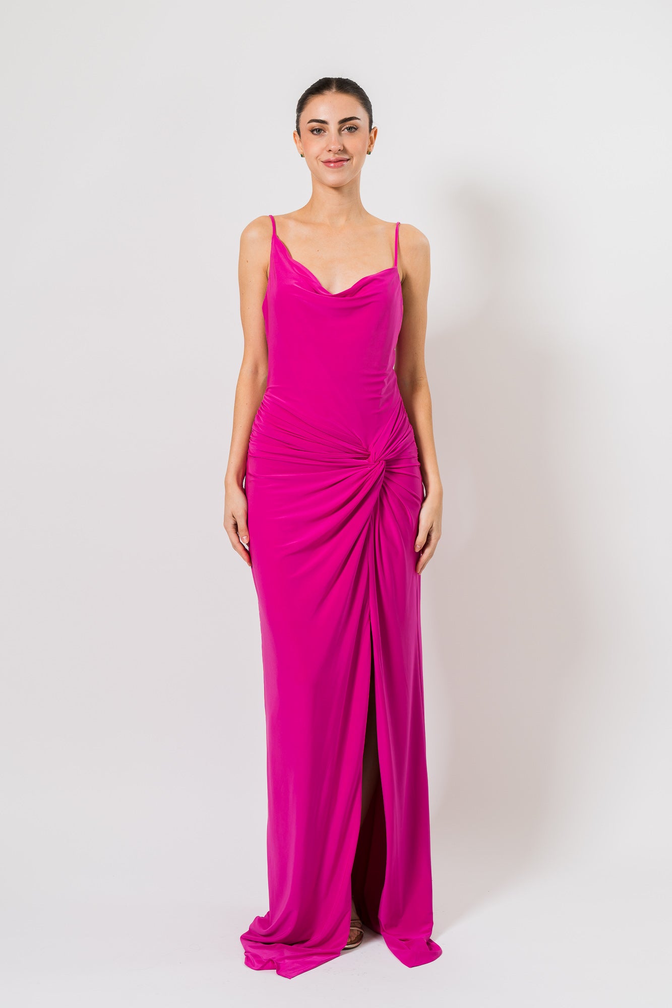 Cowl Draped Gown with Twist in Electric Orchid by BCBG MAXAZRIA.