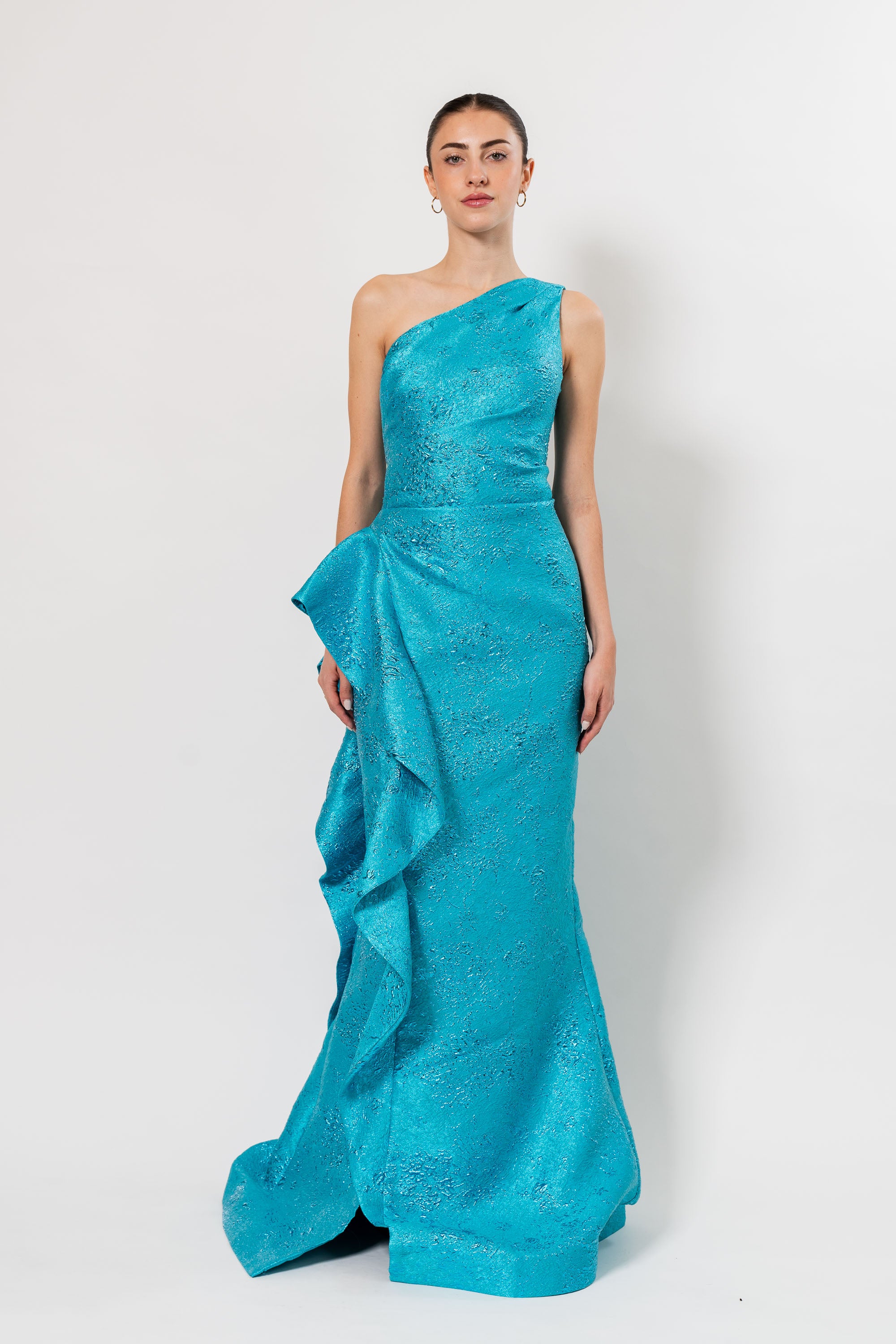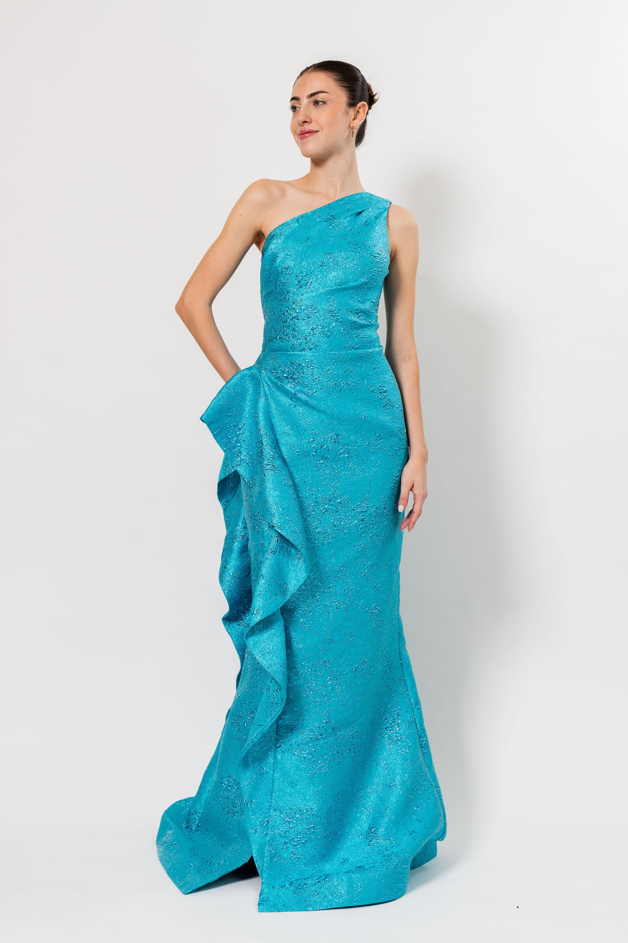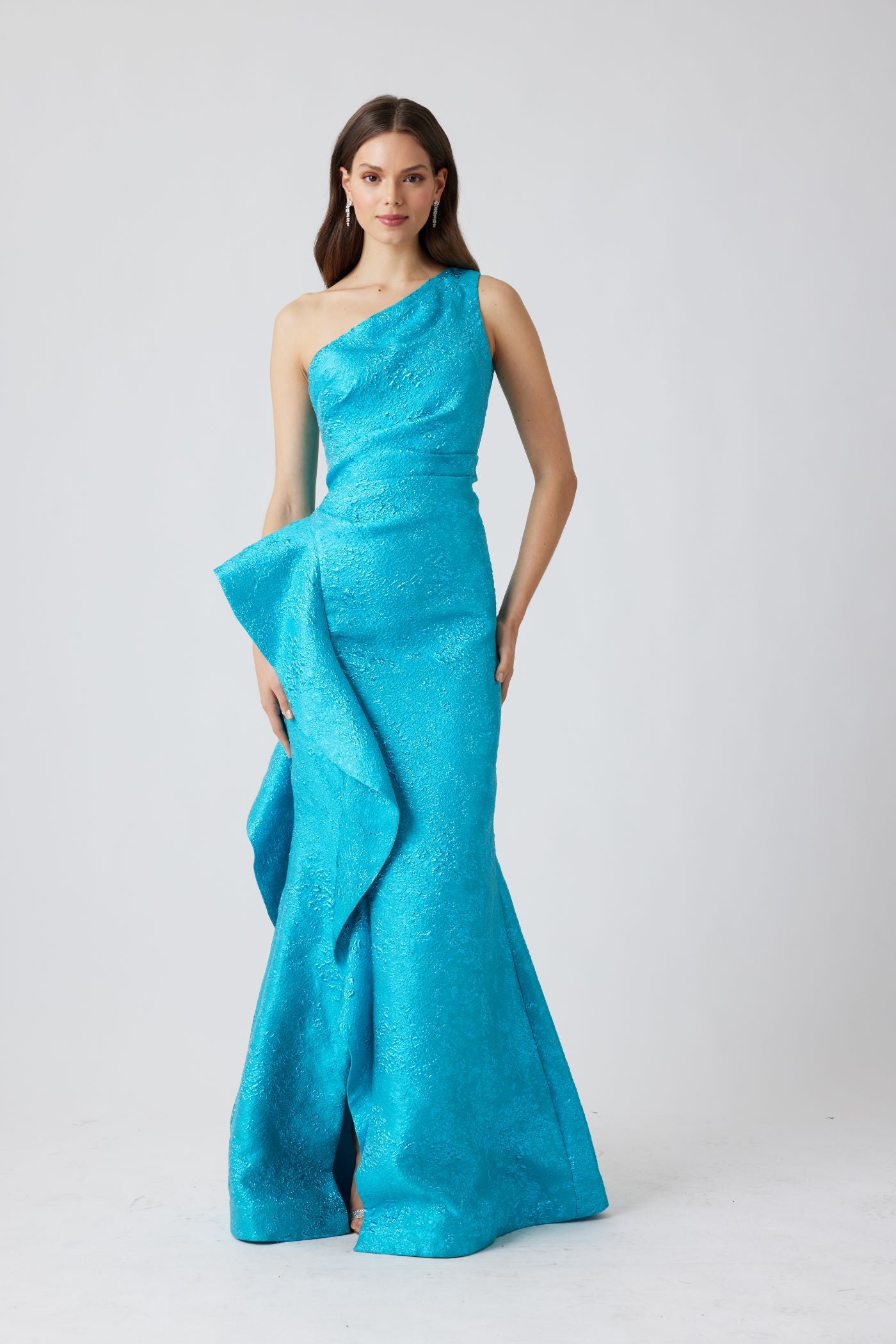 Jacquard Side Ruffle One Shoulder Gown in Electric Turquoise by Teri Jon.