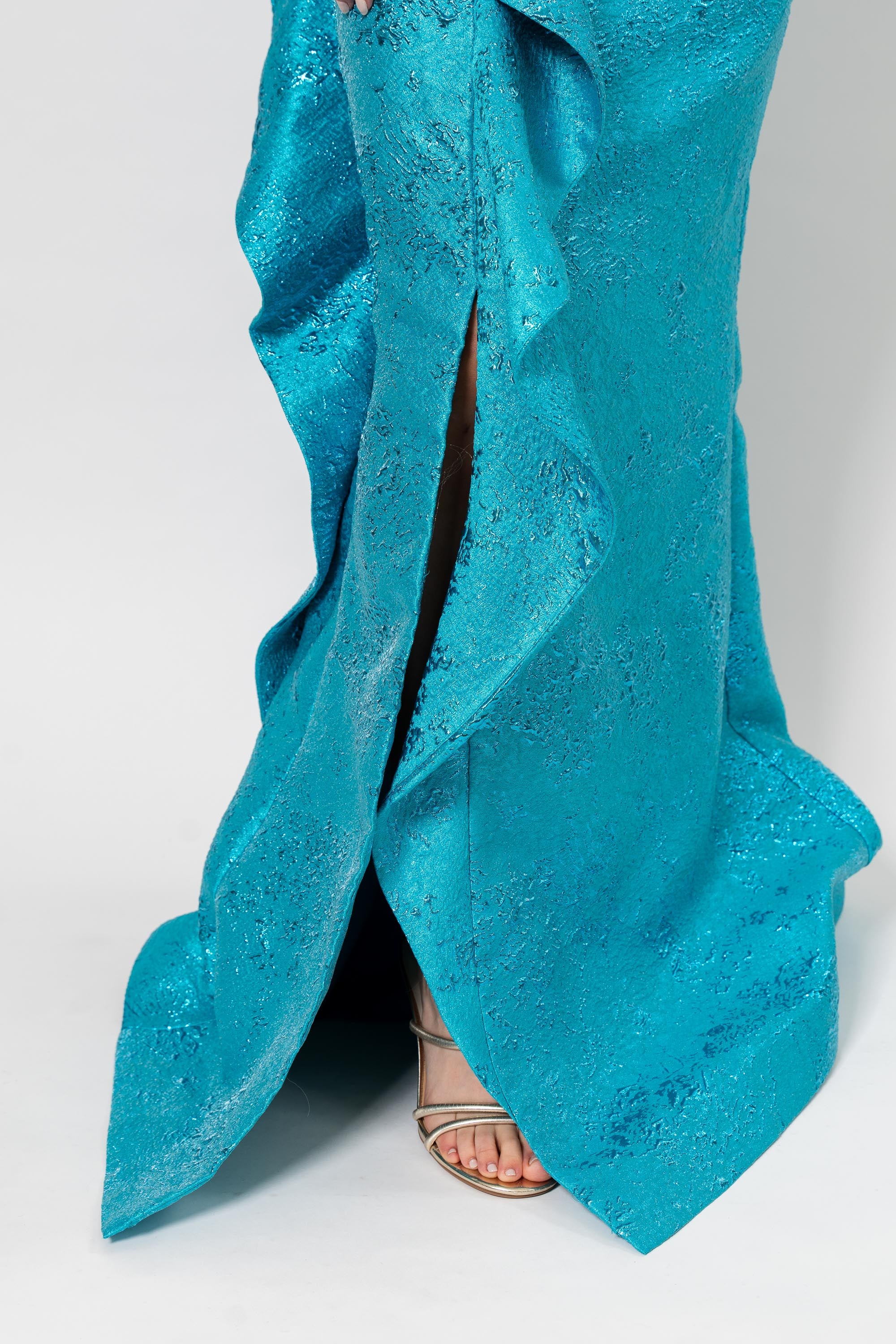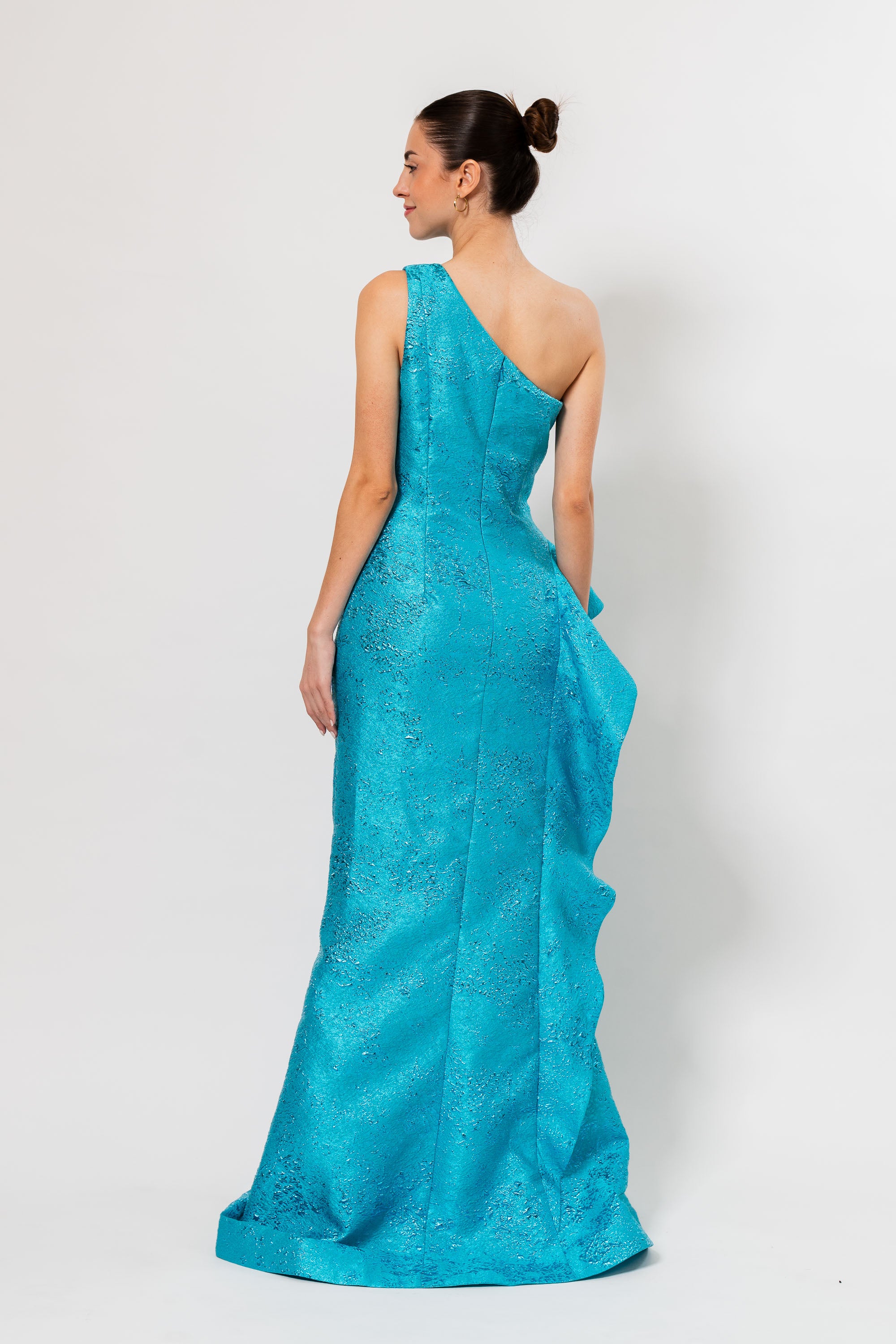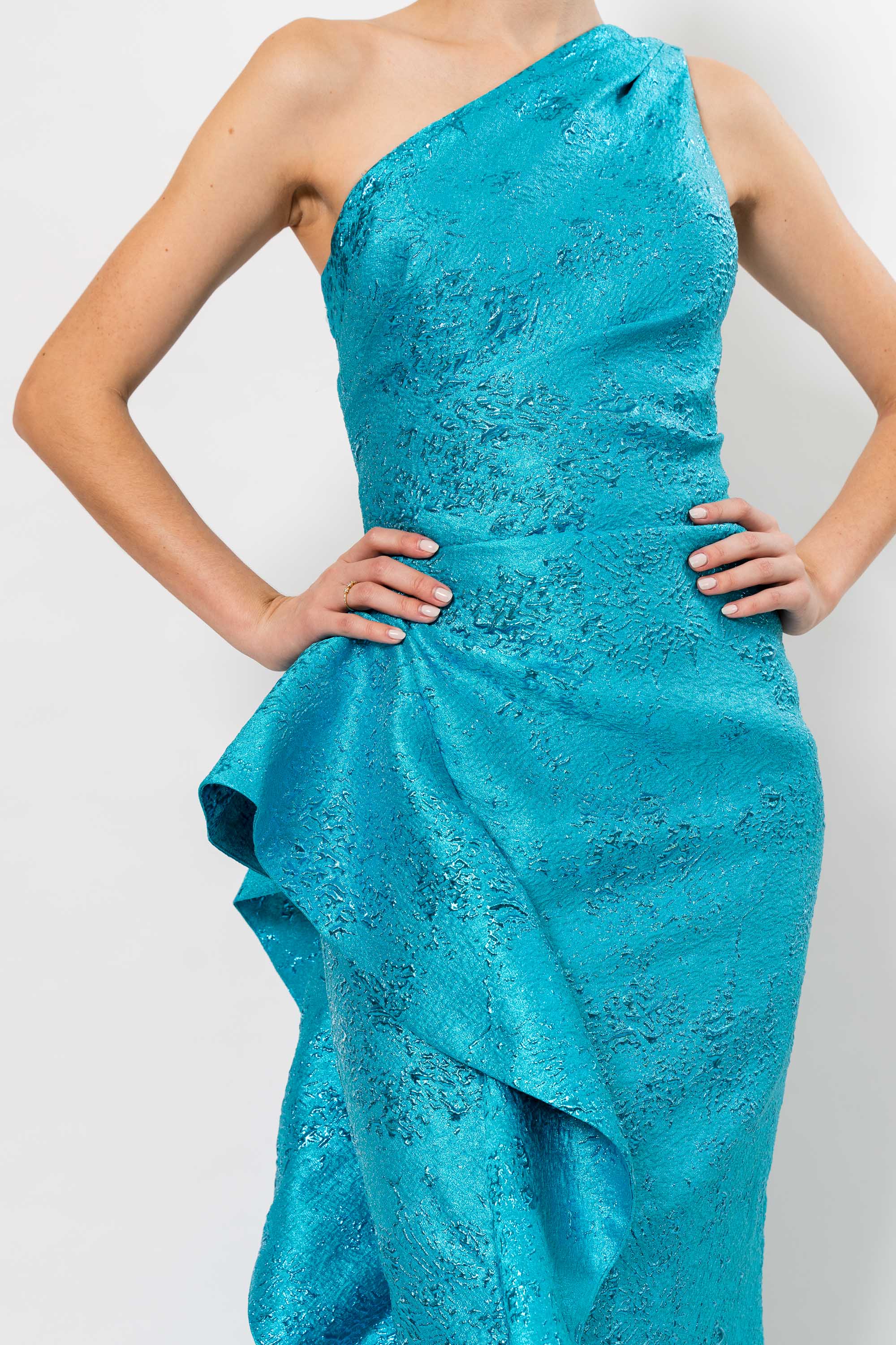 Jacquard Side Ruffle One Shoulder Gown in Electric Turquoise by Teri Jon.