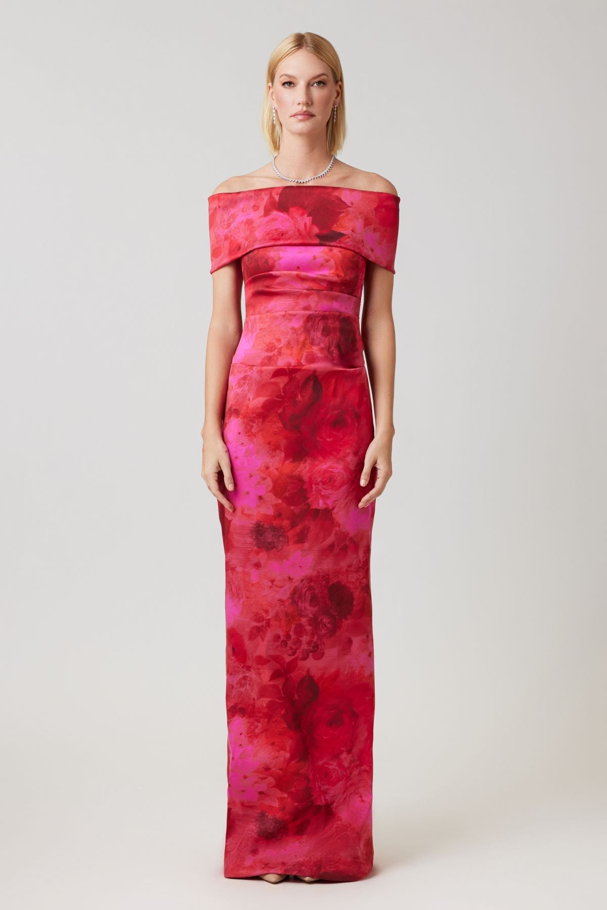 Floral Stretch Mikado Ruched Off The Shoulder Gown in Fuchsia Multi by Teri Jon.