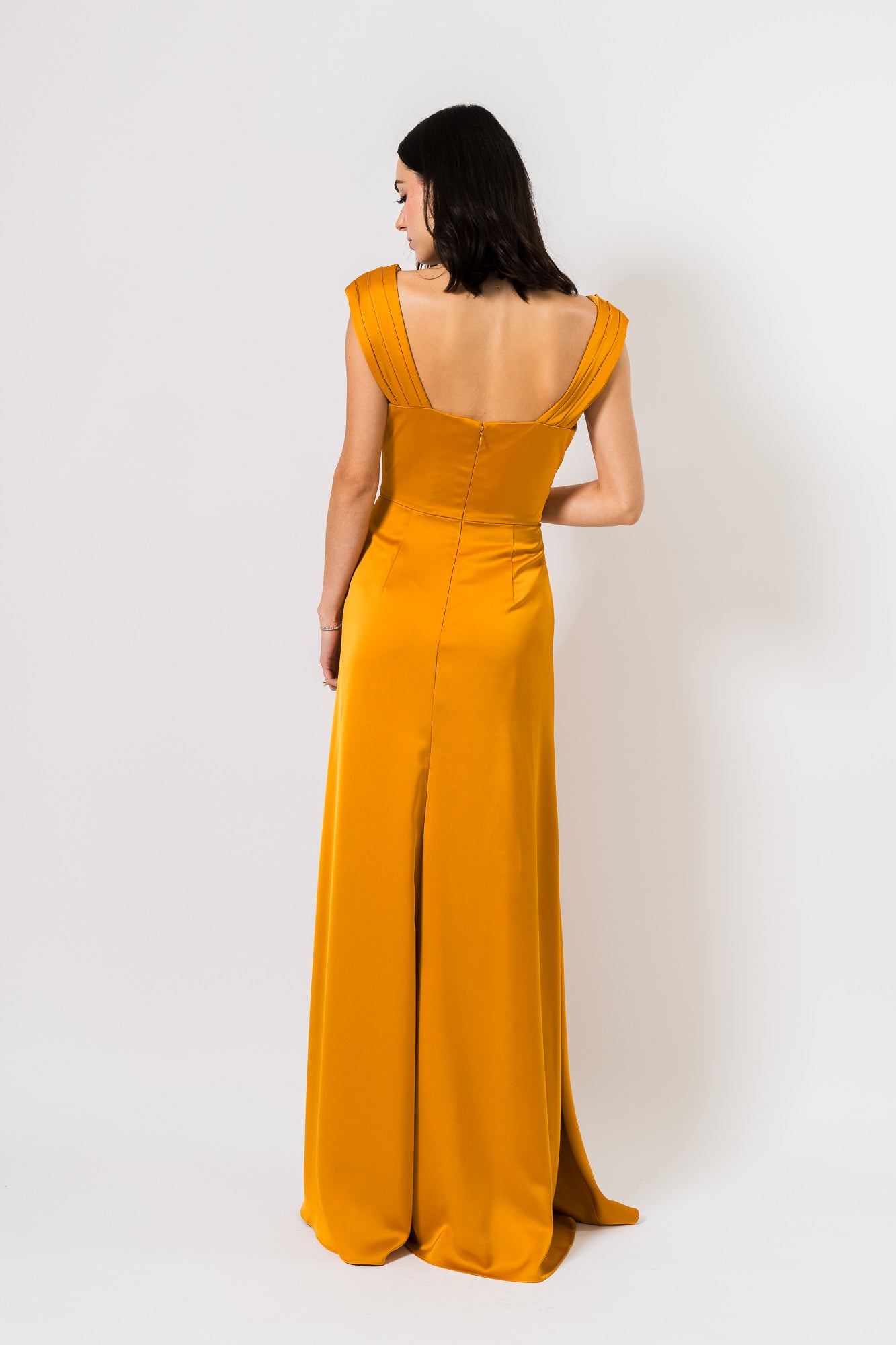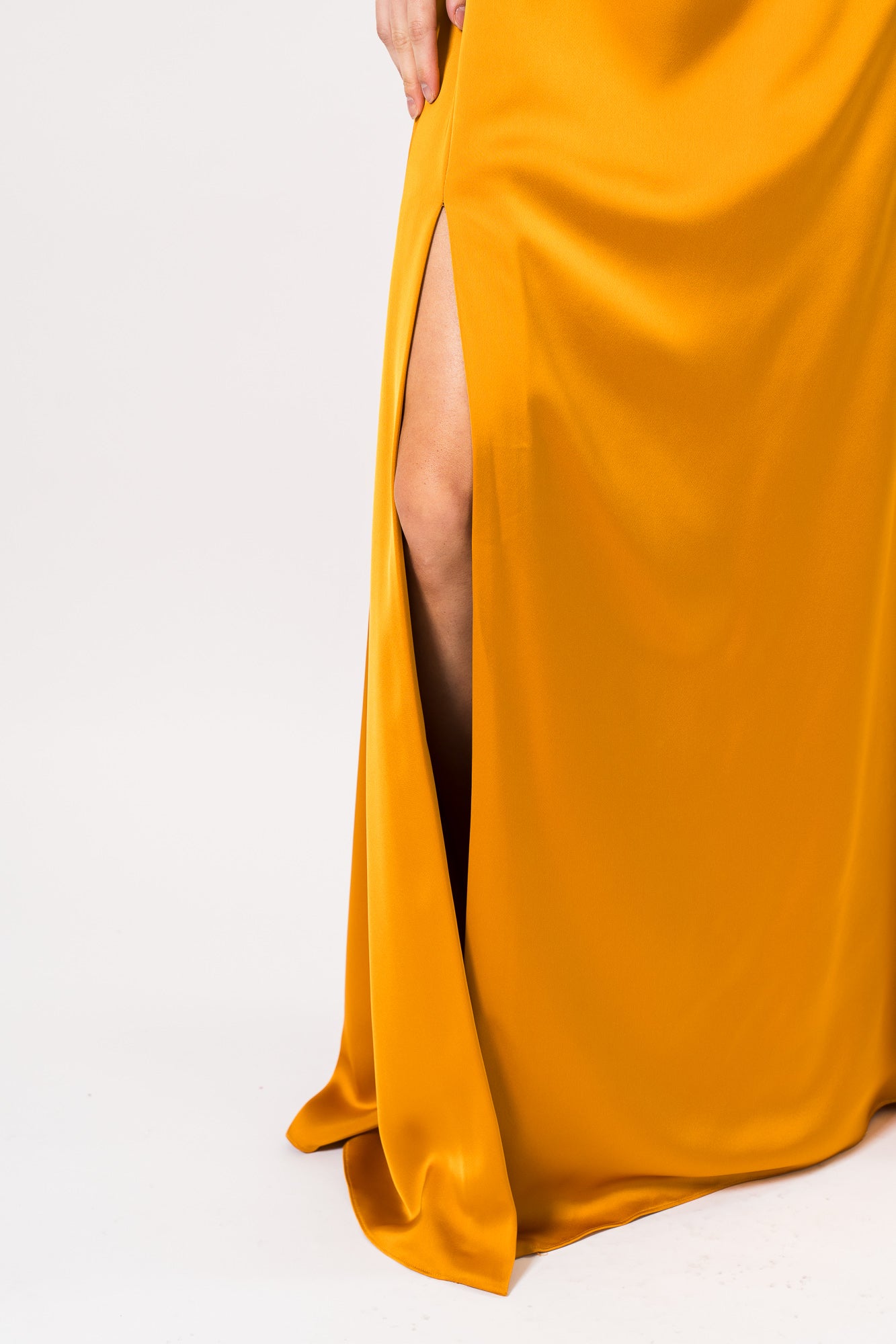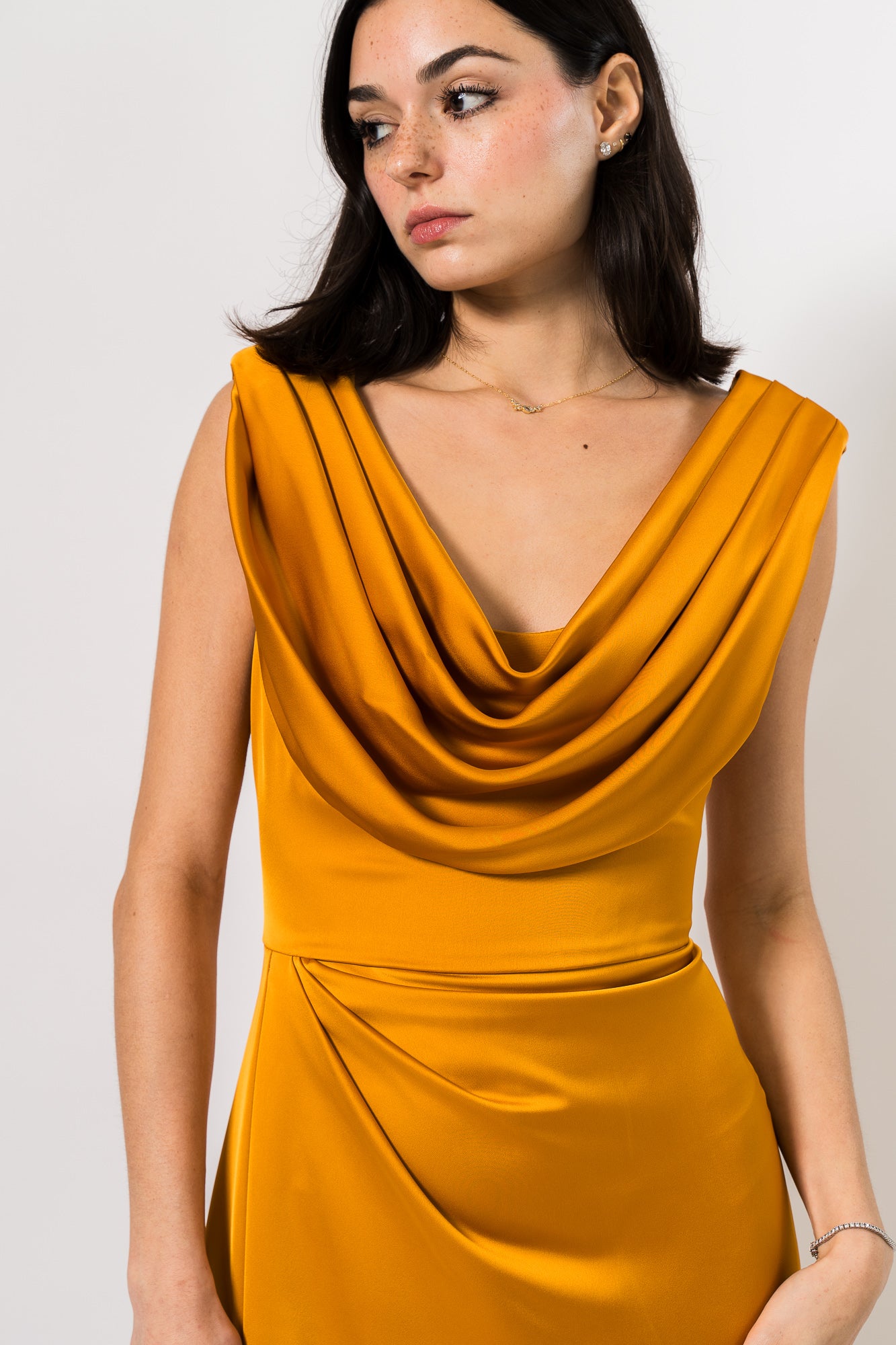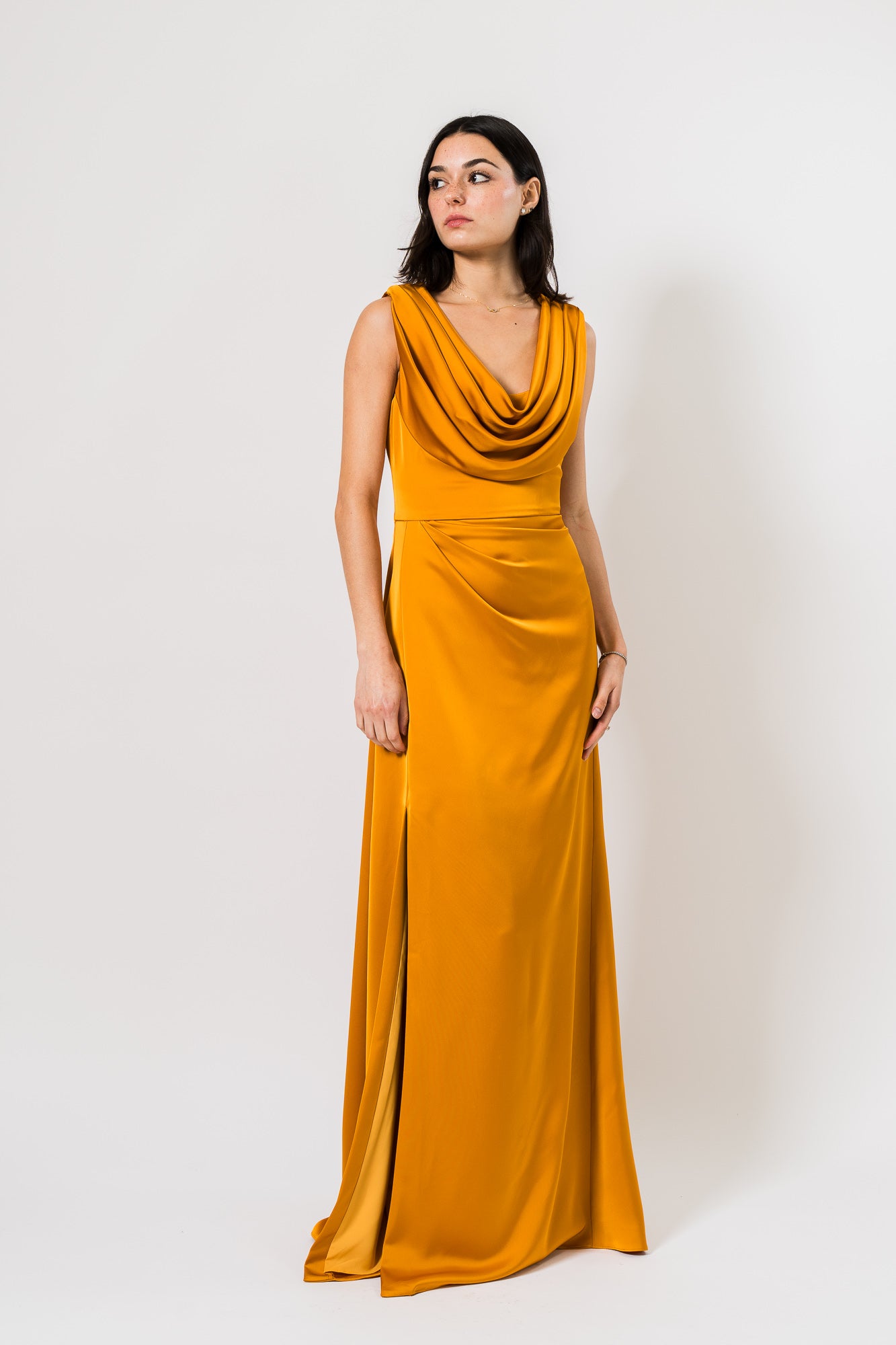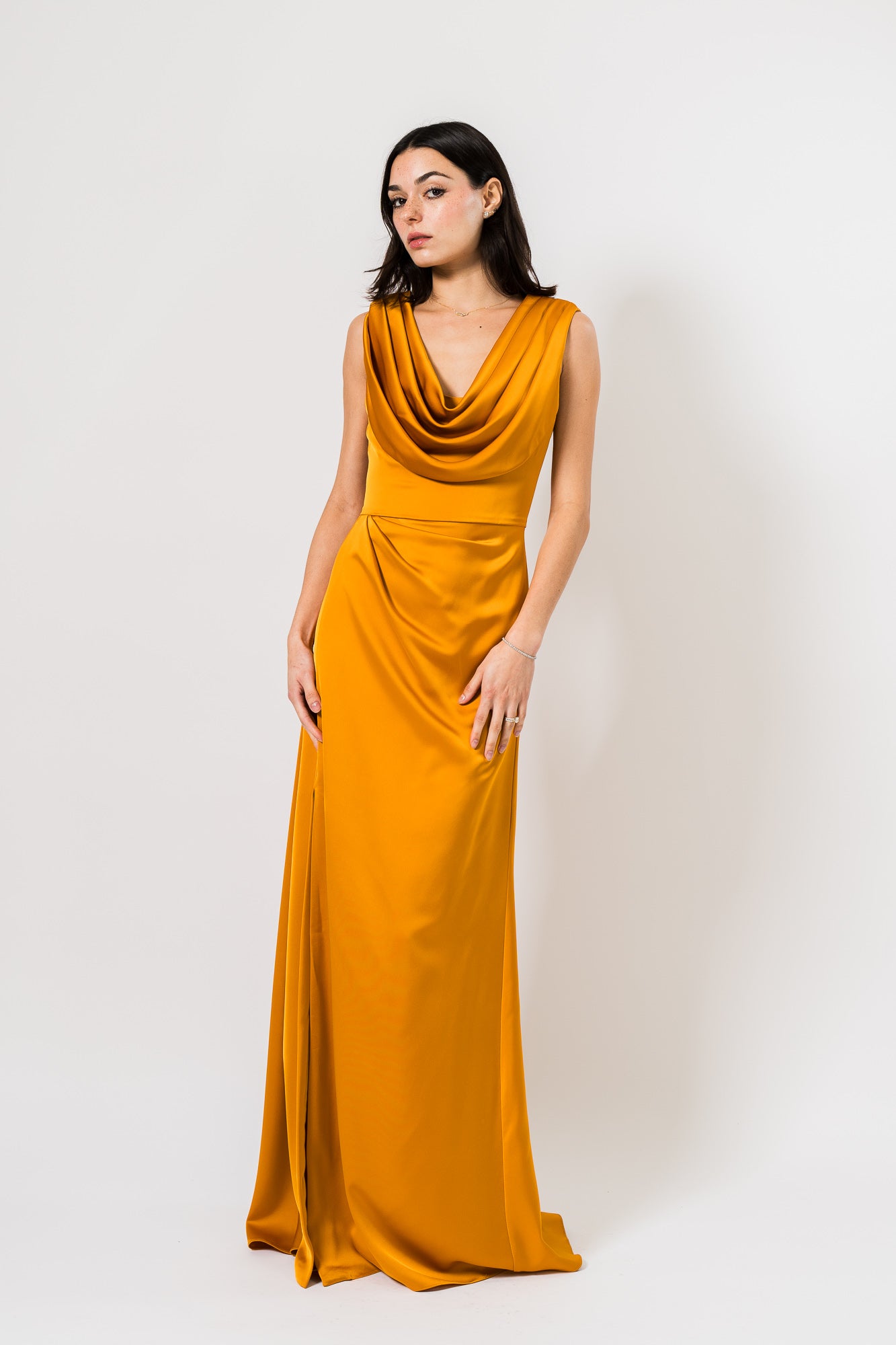 Blair Cowl Draped Gown in Gold Nectar by Theia.
