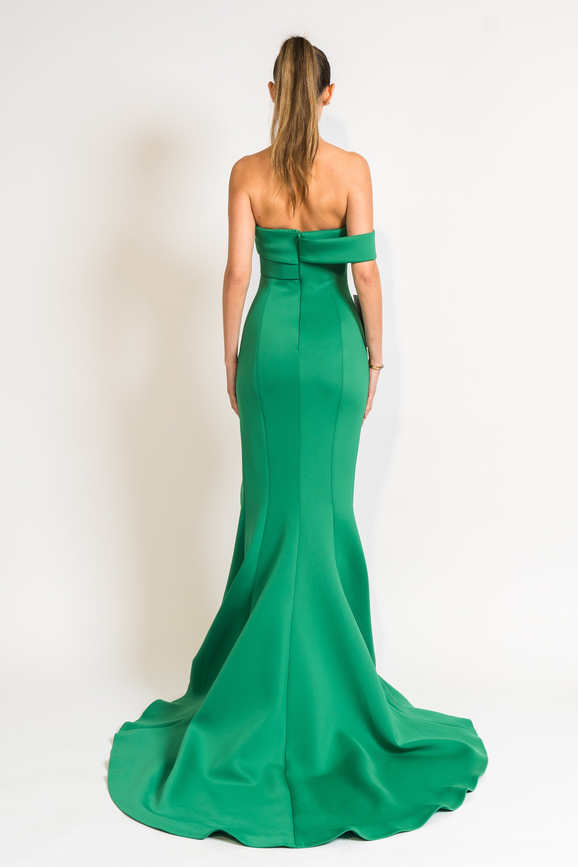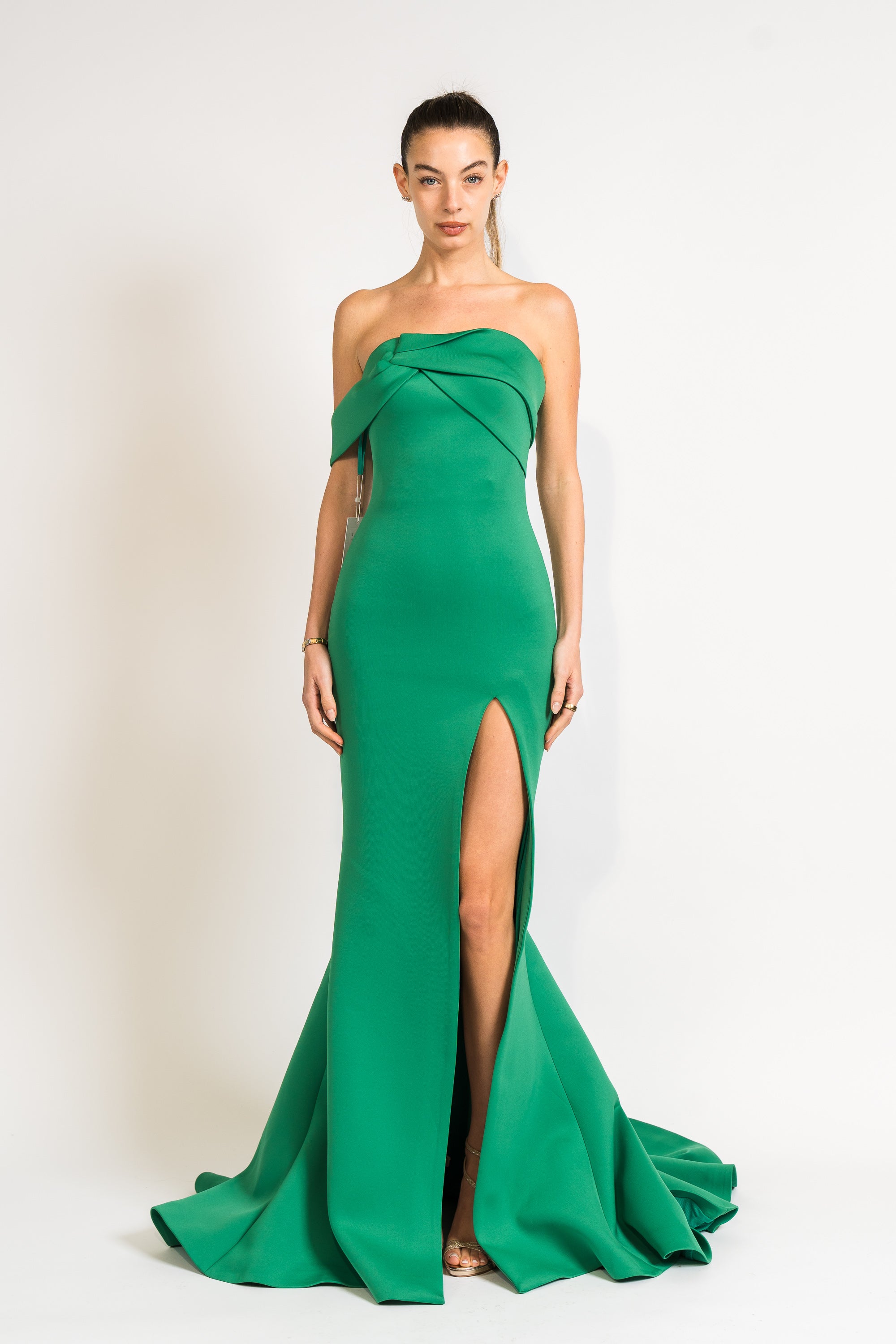 Fitted High Slit Gown in Green by Jovani.