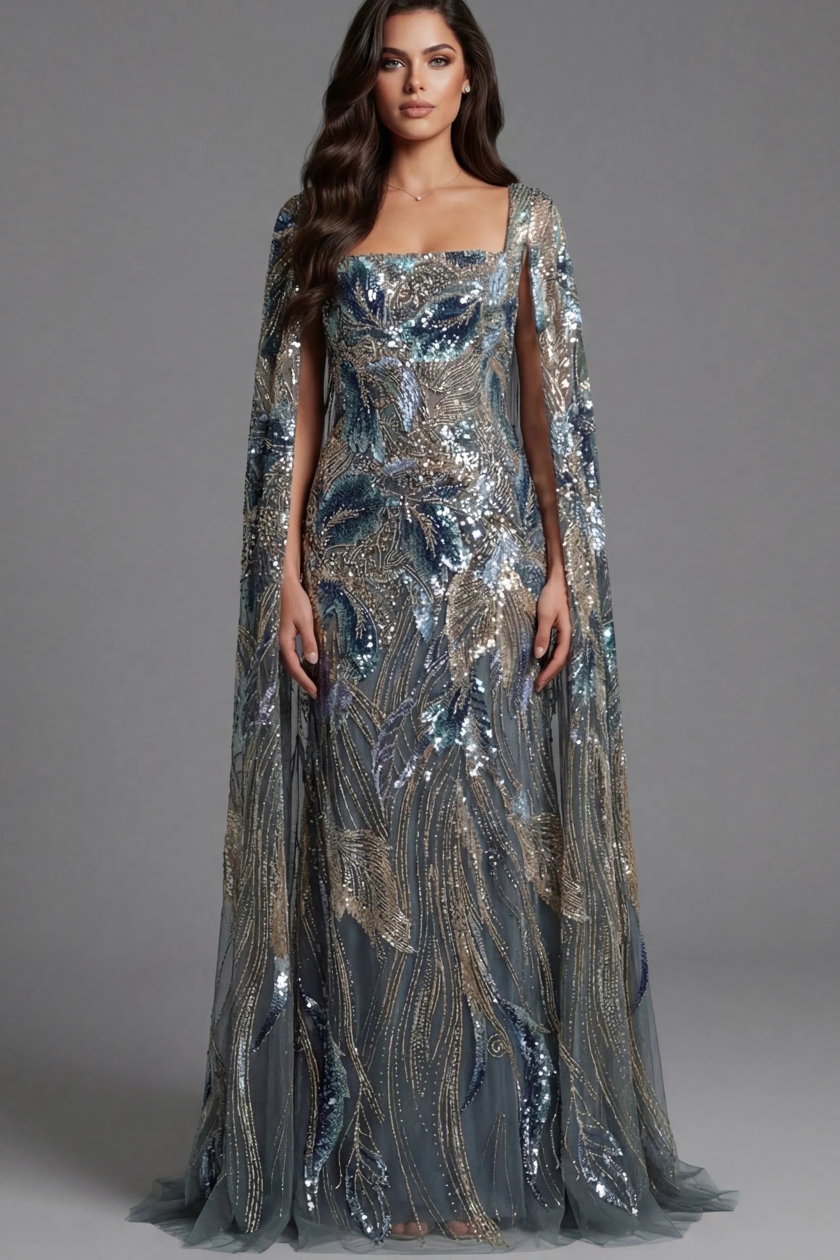 Sequin Embellished Gown With Square Neckline in Grey Multi by Jovani.