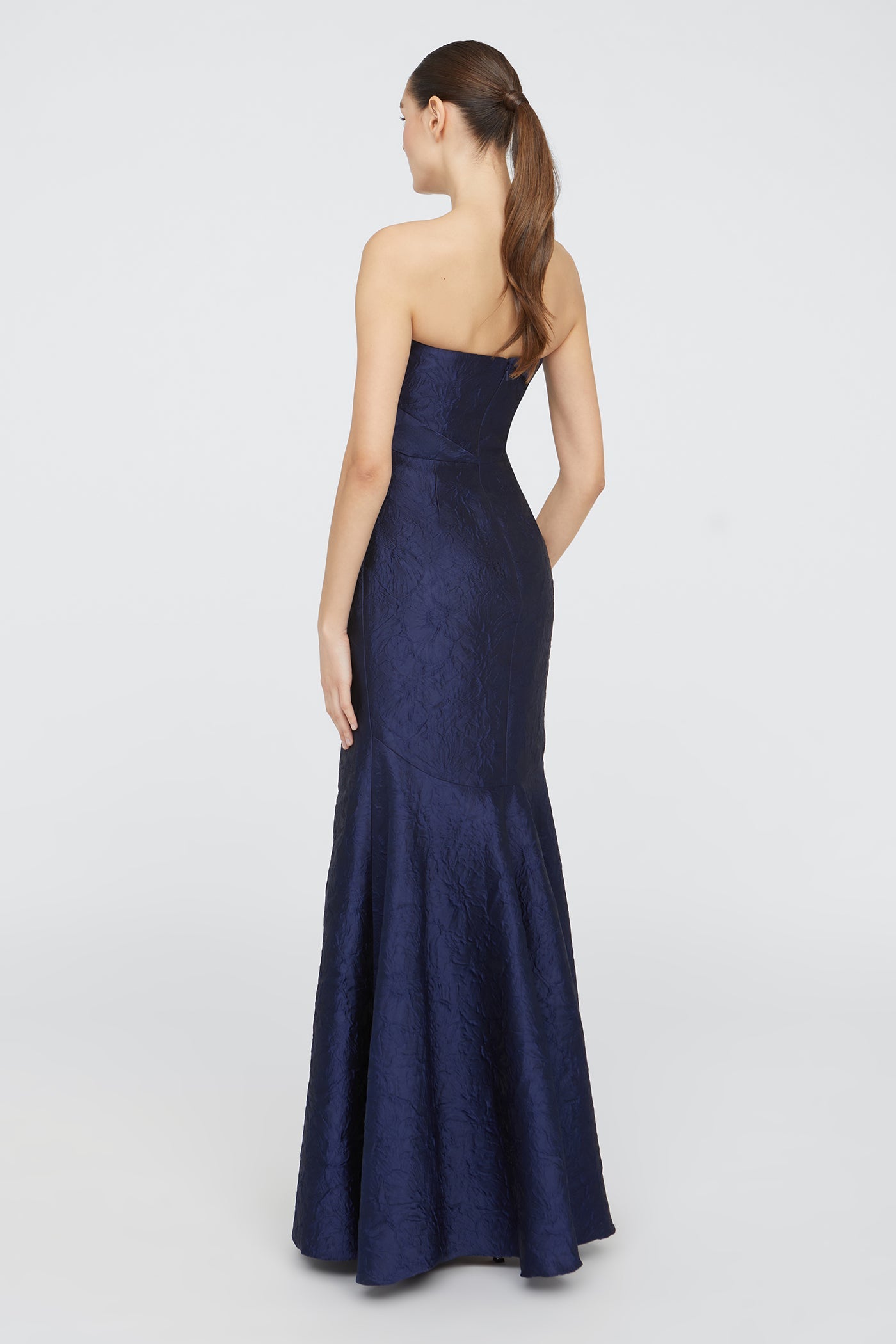 Cloud Jacquard Draped Strapless Fit and Flare Gown With Arched Neckline in Midnight Fog by Theia.