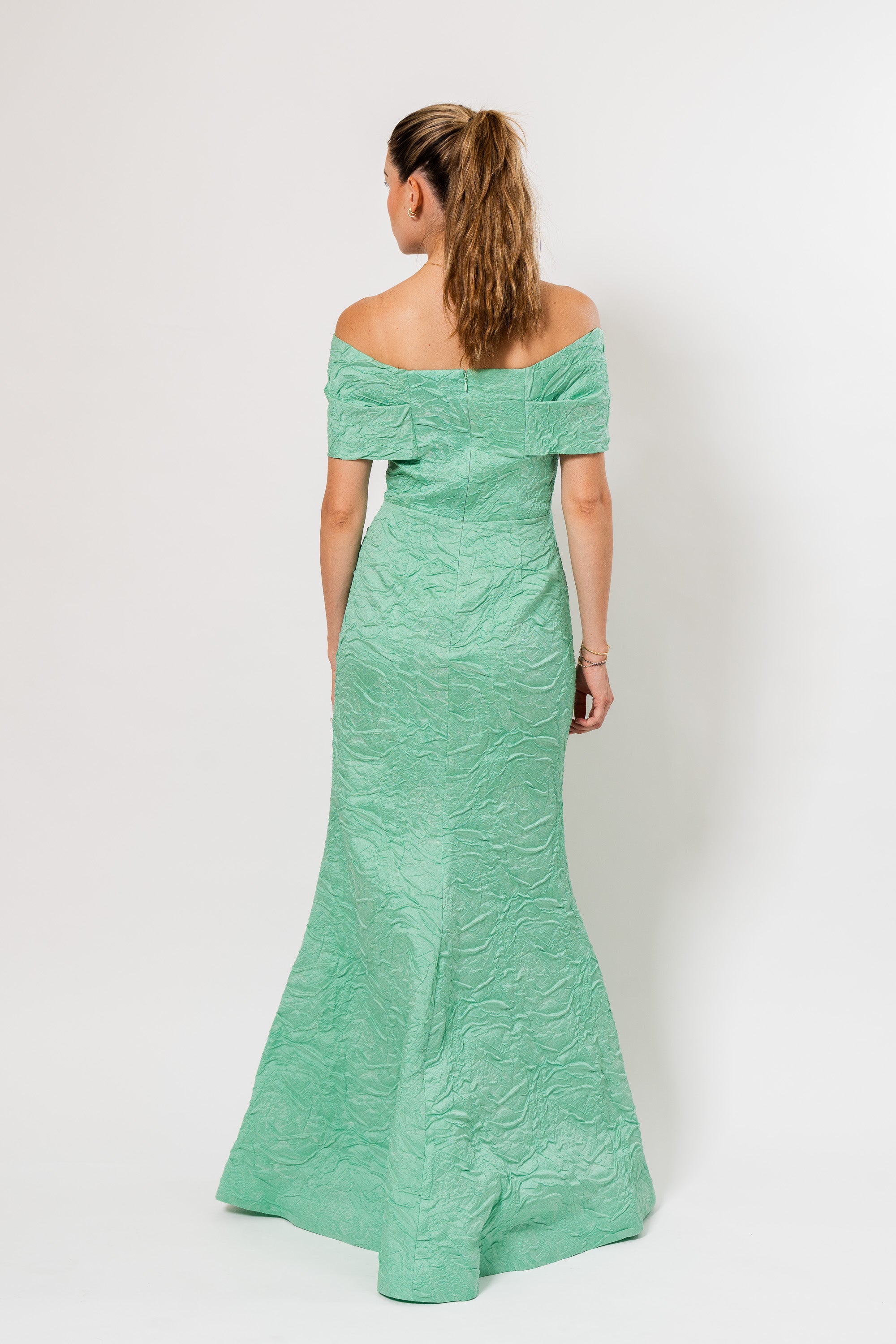 Embossed Jacquard Twist Bobice Gown in Mint Green by Teri Jon.