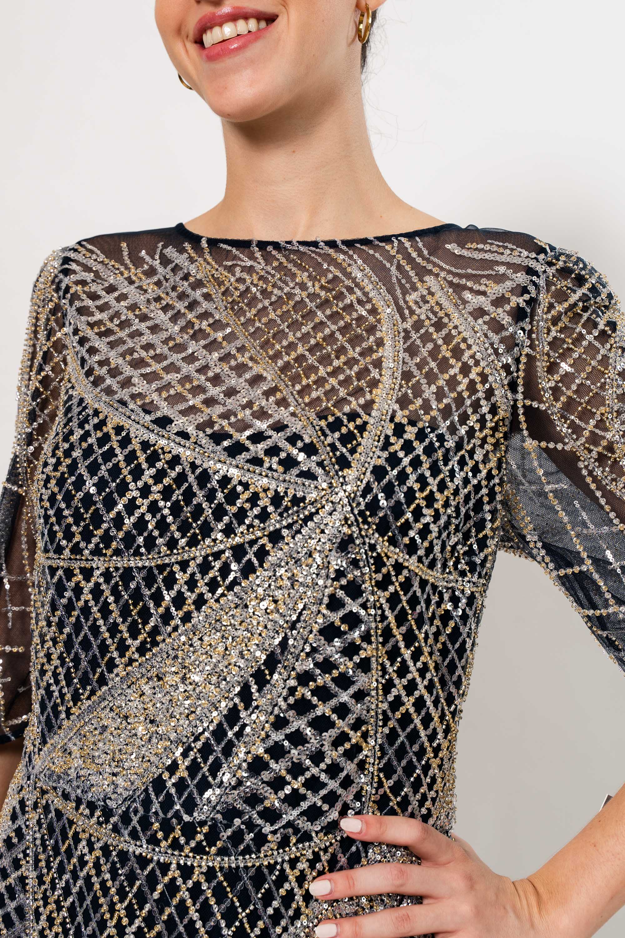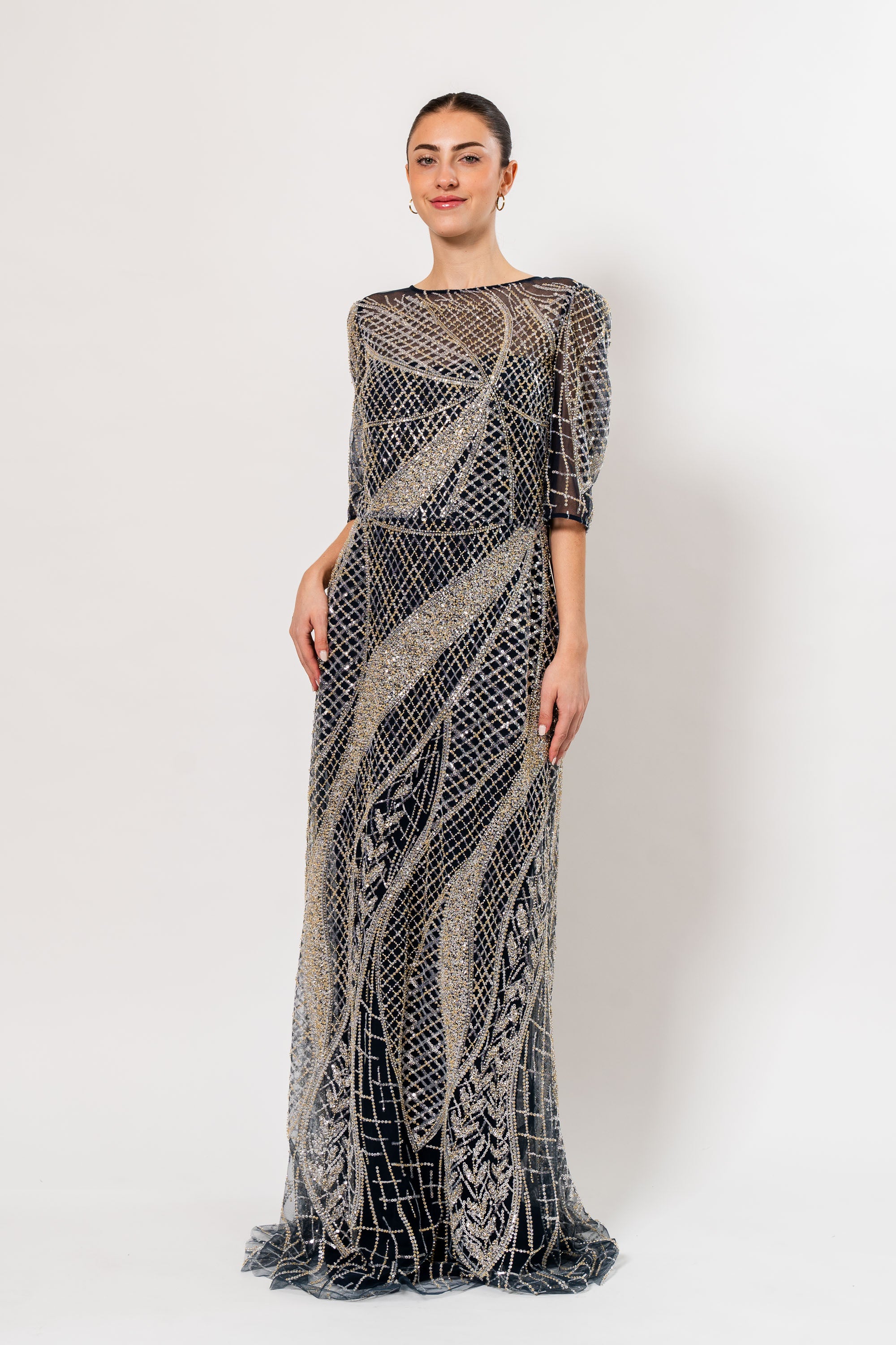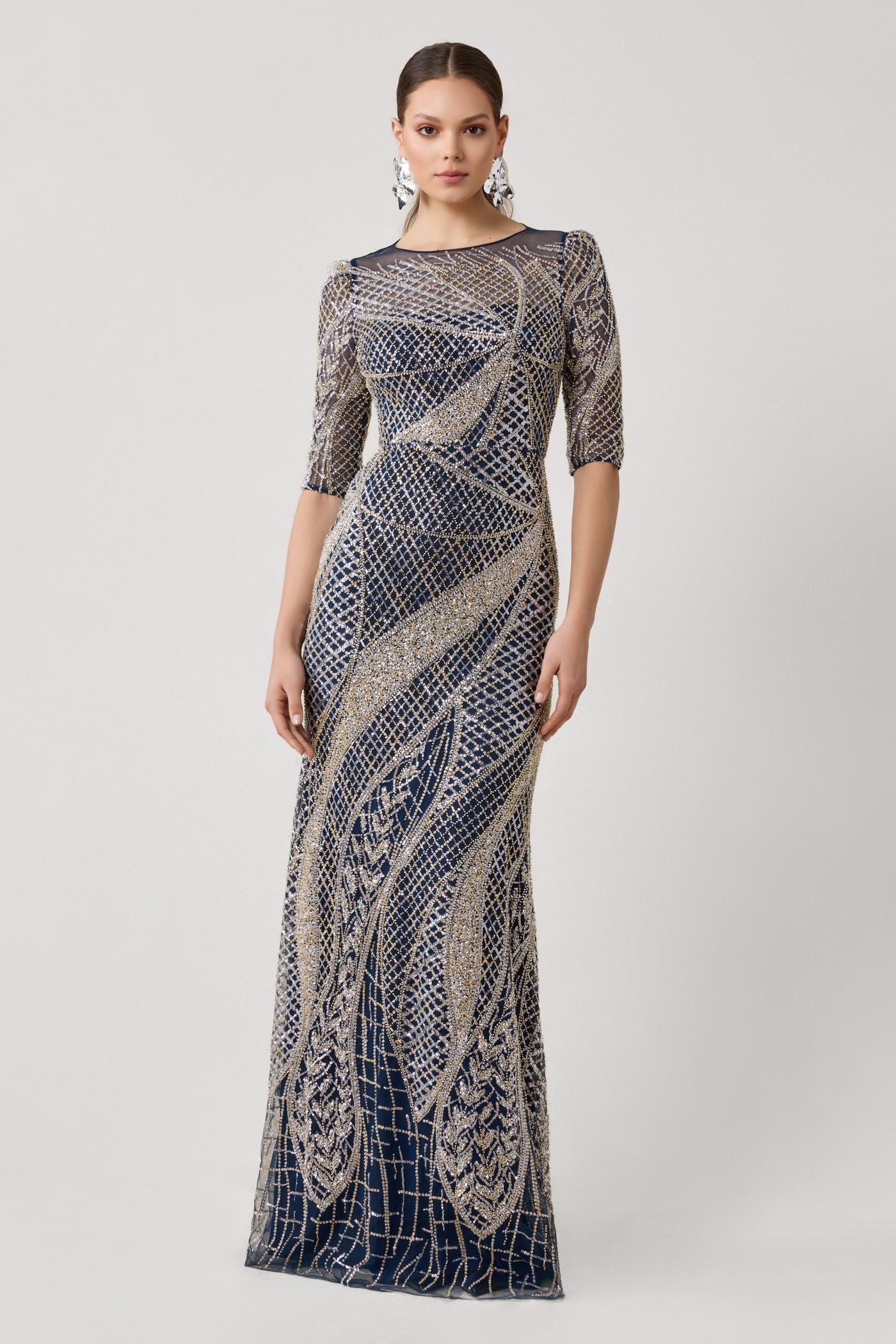 Art Deco Beaded Tulle Elbow Sleeve Gown in Navy multi by Teri Jon.