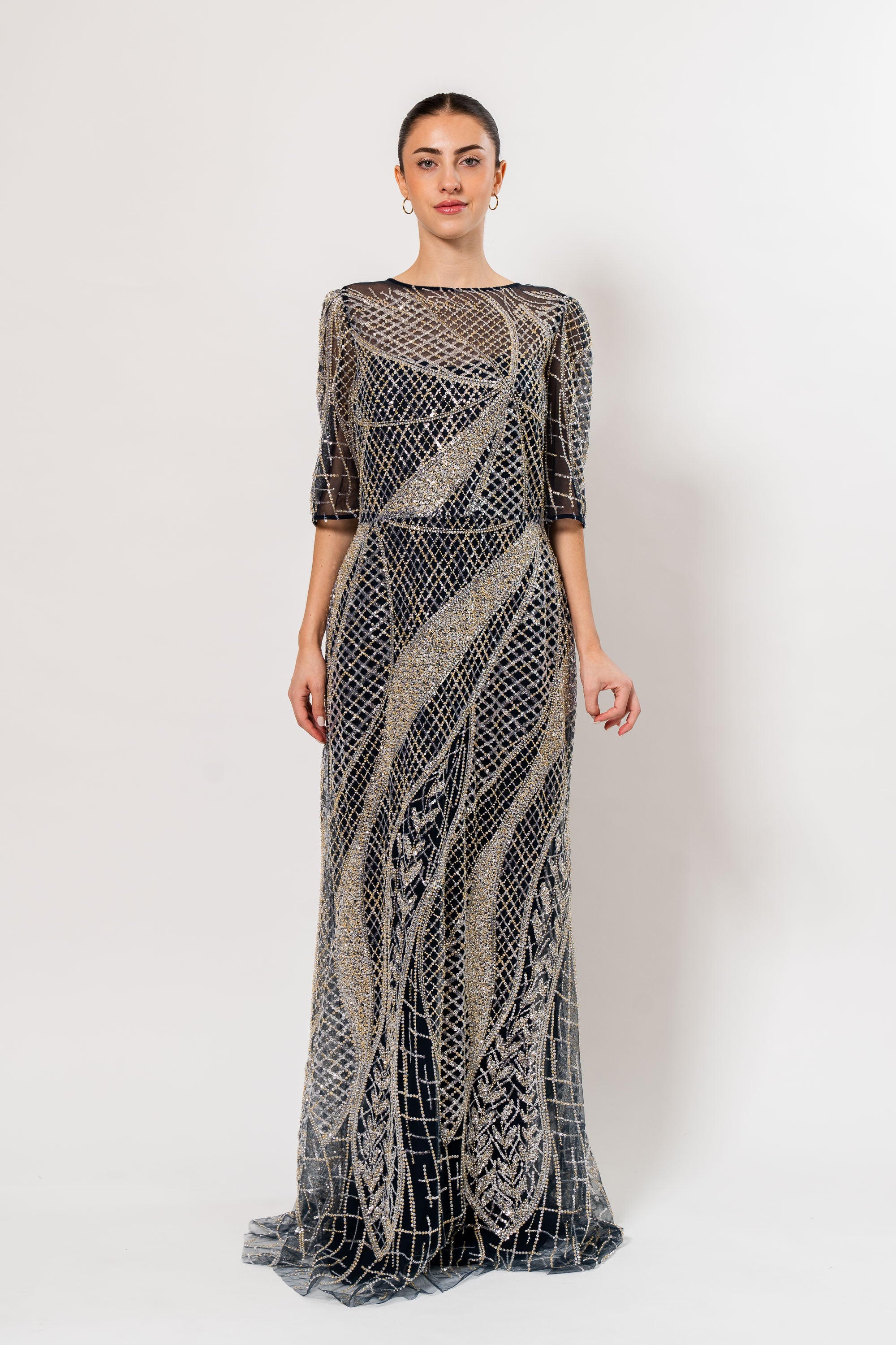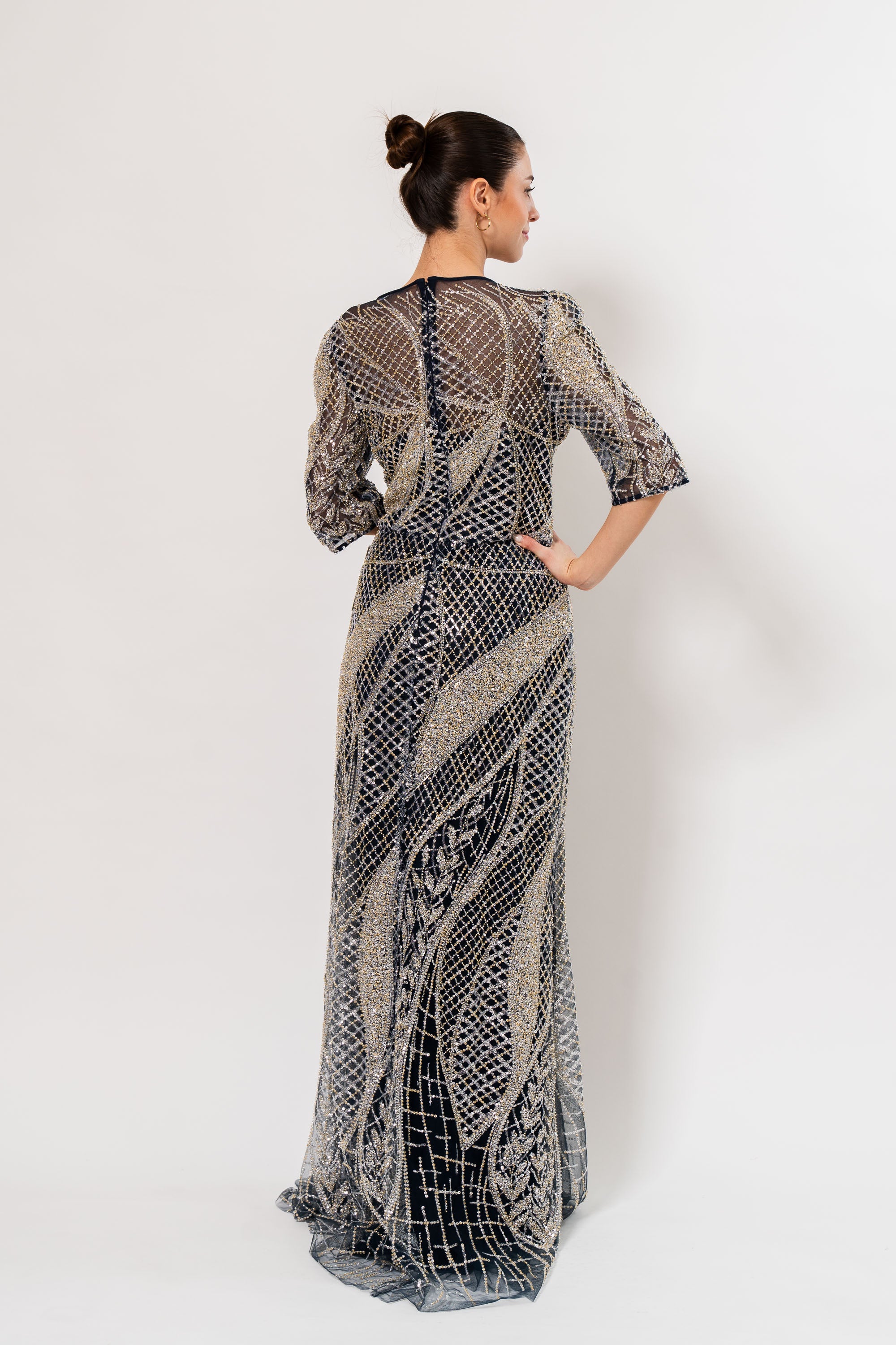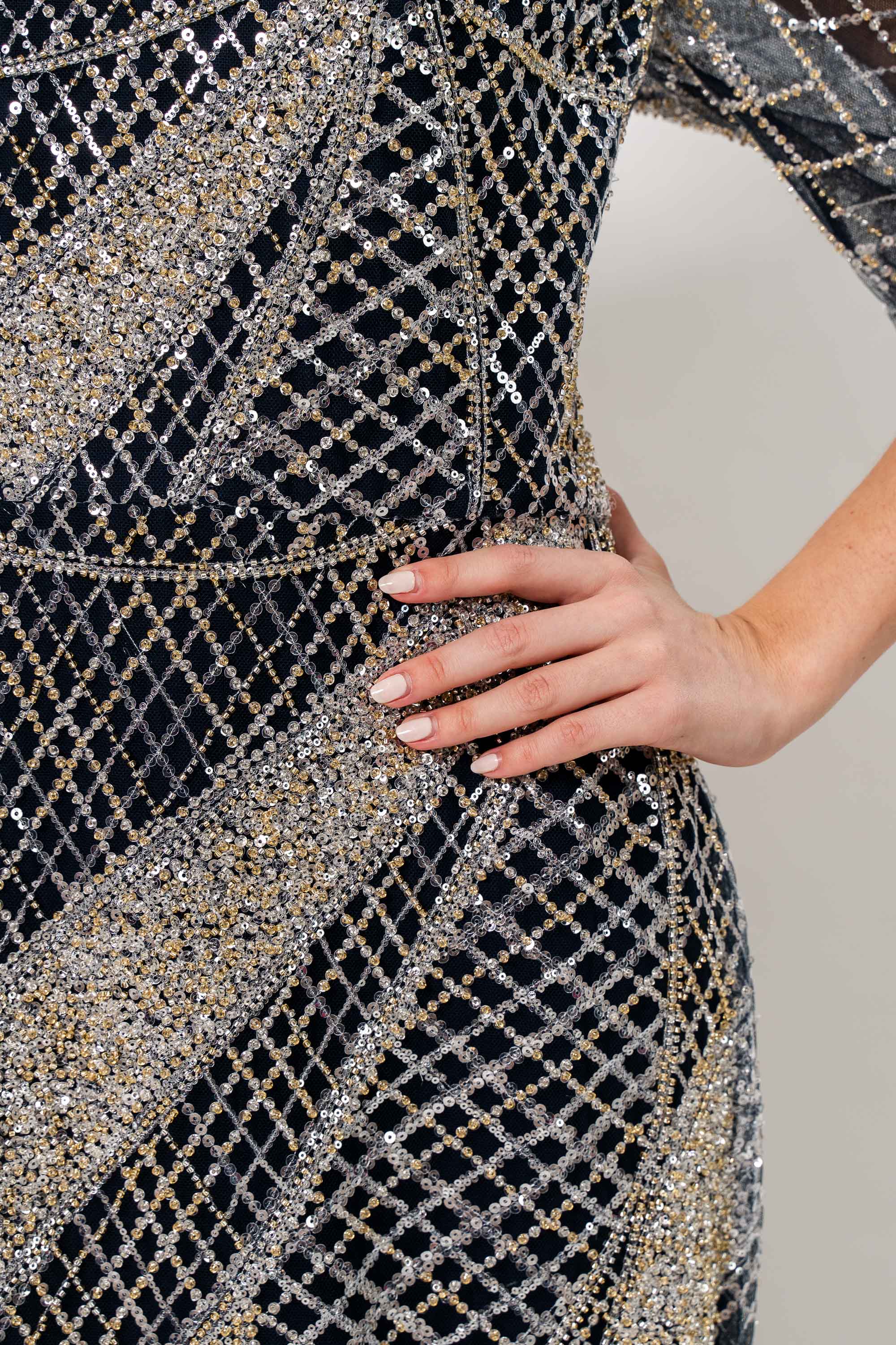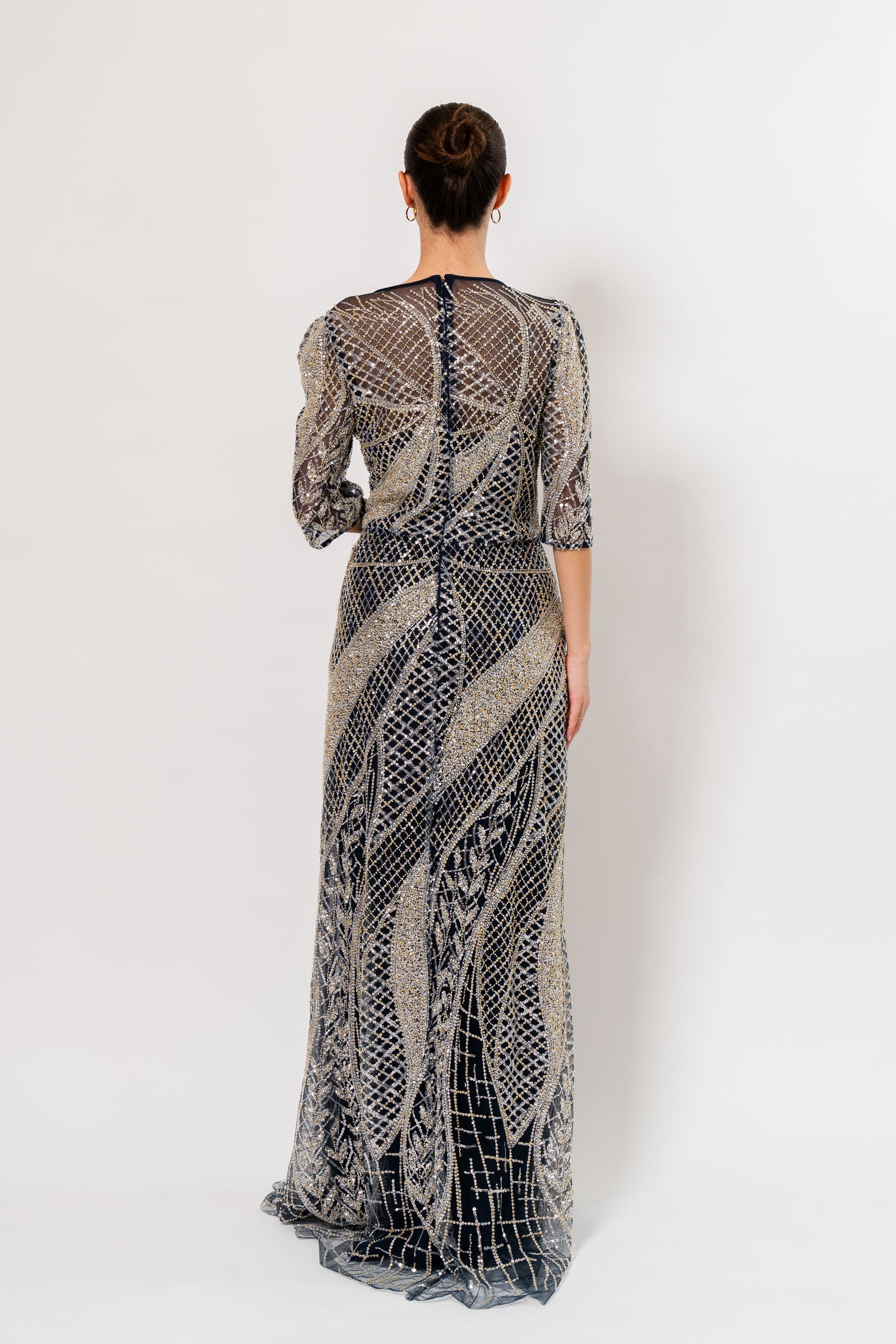 Art Deco Beaded Tulle Elbow Sleeve Gown in Navy multi by Teri Jon.