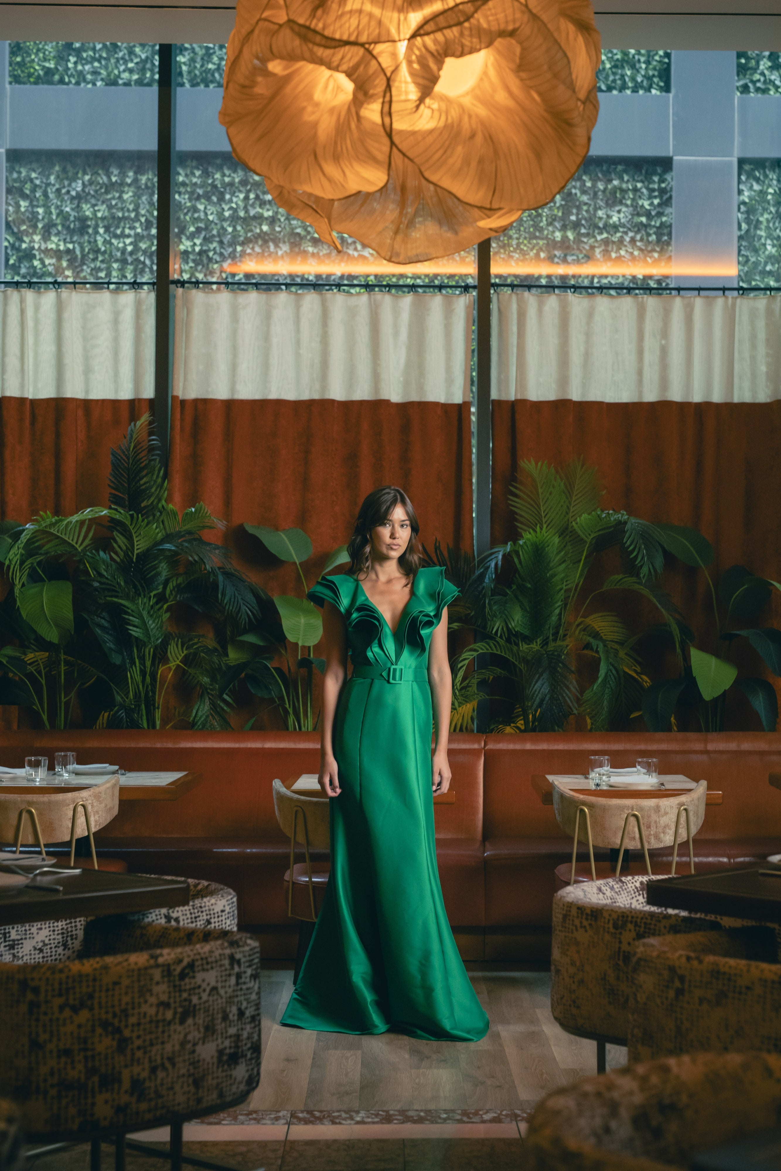 Ruffled Neckline Belted Trumpet Gown in Palm Green by Badgley Mischka.