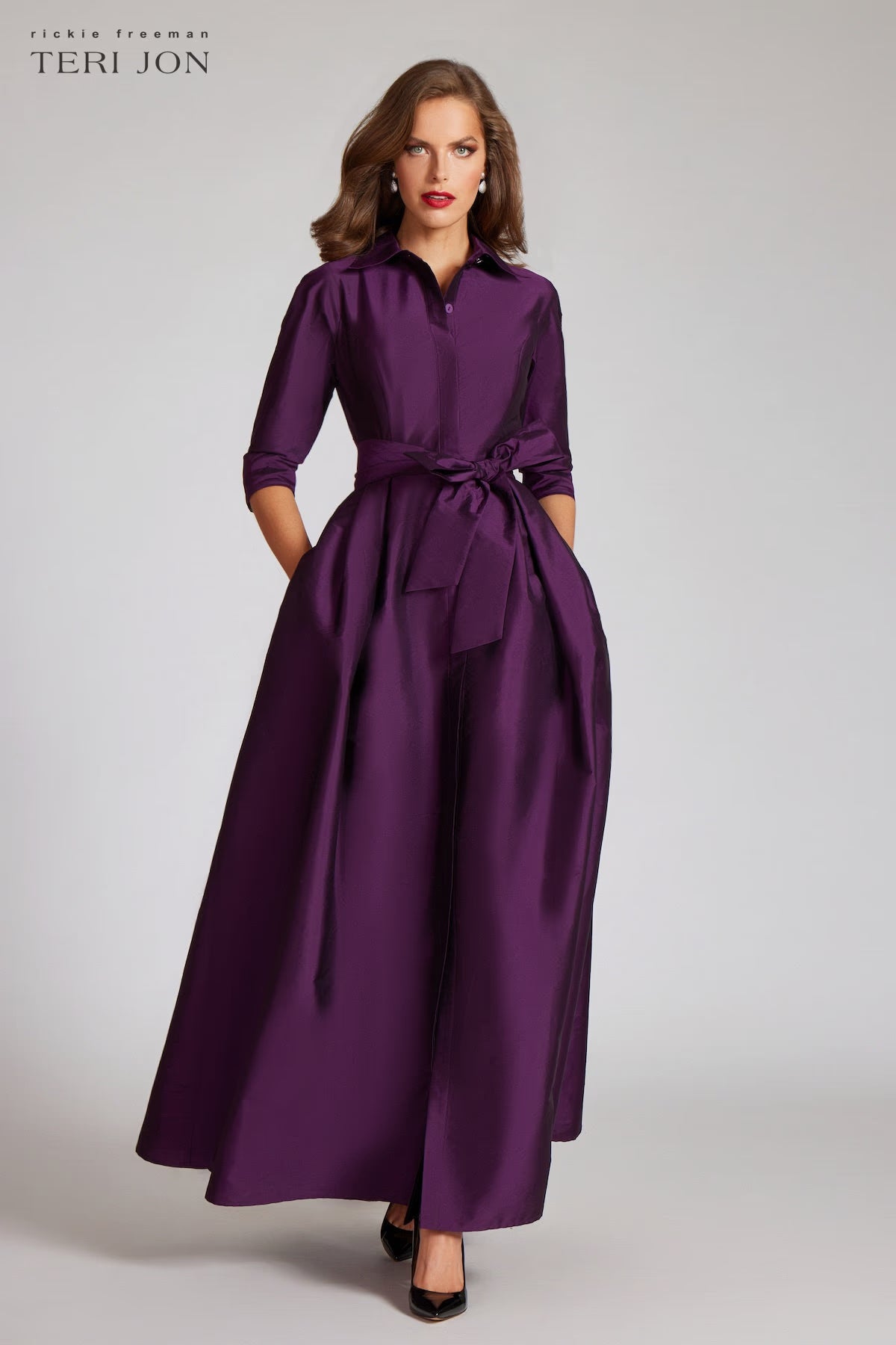 Taffeta Shirt Waist Gown in Plum by Teri Jon.