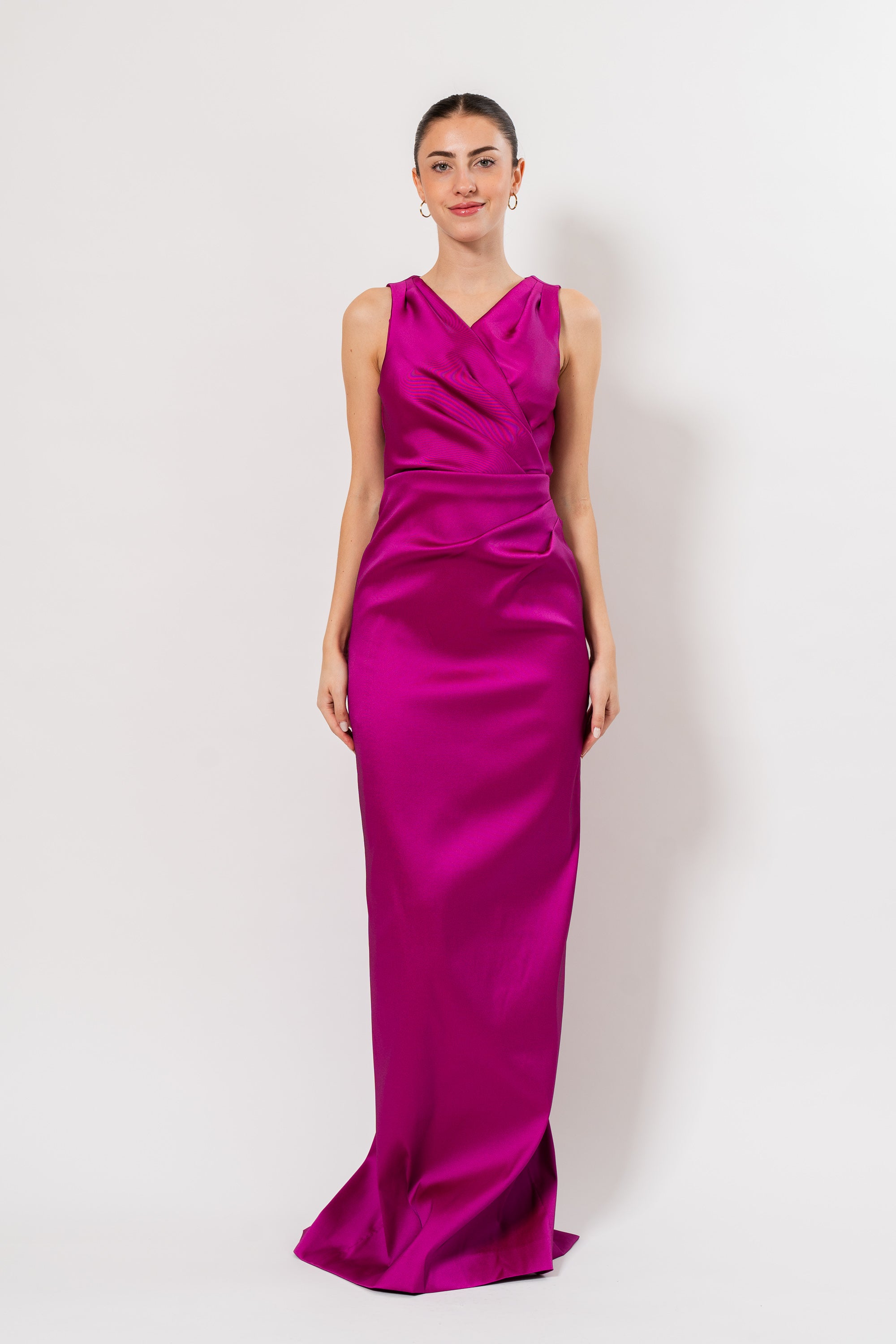 Mikado Criss Cross Bodice Ruched Tank Gown in Raspberry by Teri Jon.